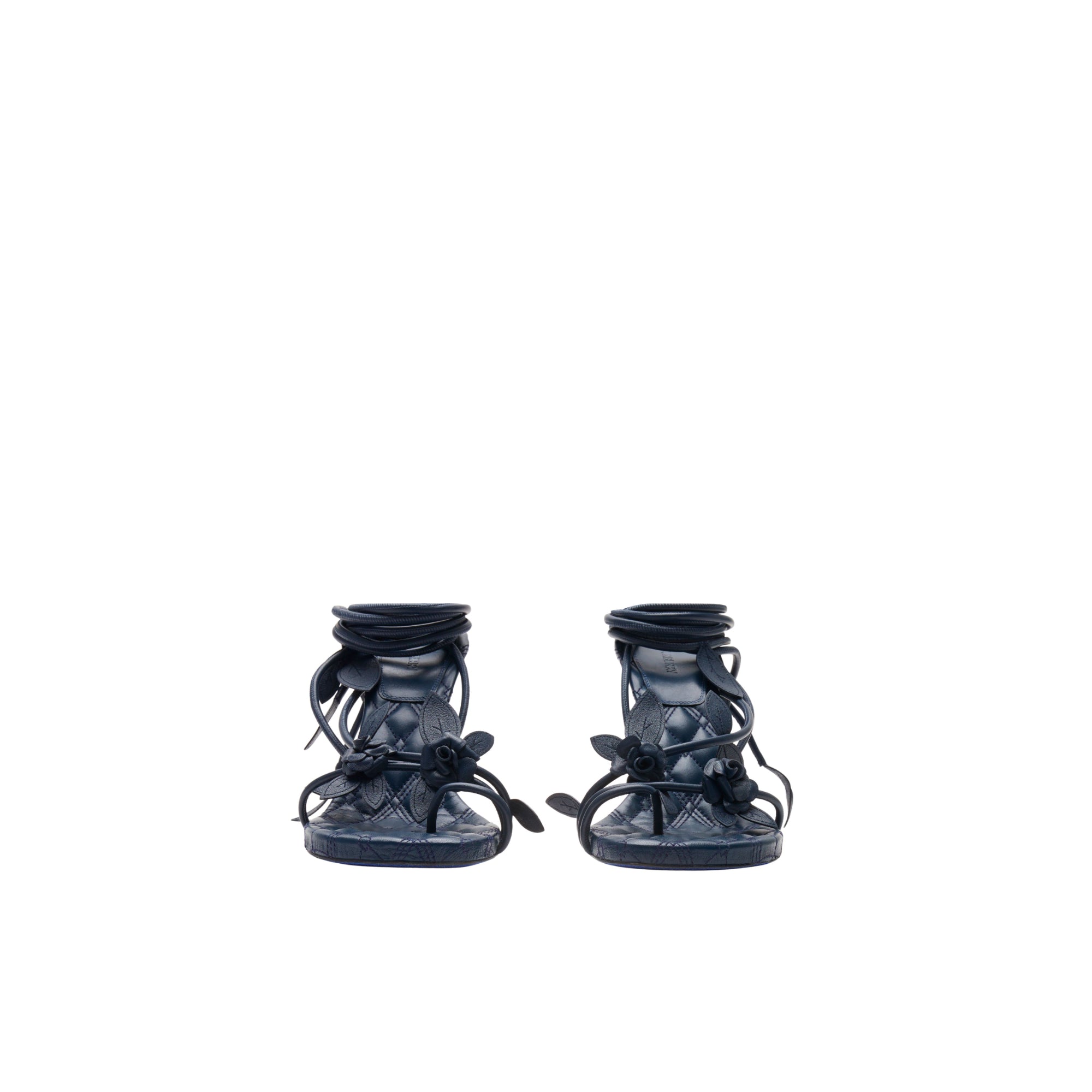 상품설명 : 나파 가죽 소재로 이탈리아에서 제작된 힐 샌들. 장미 덩굴에서 영감을 받은 랩어라운드 스타일의 스트랩과 수작업으로 완성된 새싹 및 나뭇잎 모티프가 특징.##둥근 앞코#퀼팅 가죽 안창#밑창의 기마상 디자인(Equestrian Knight Design, EKD)