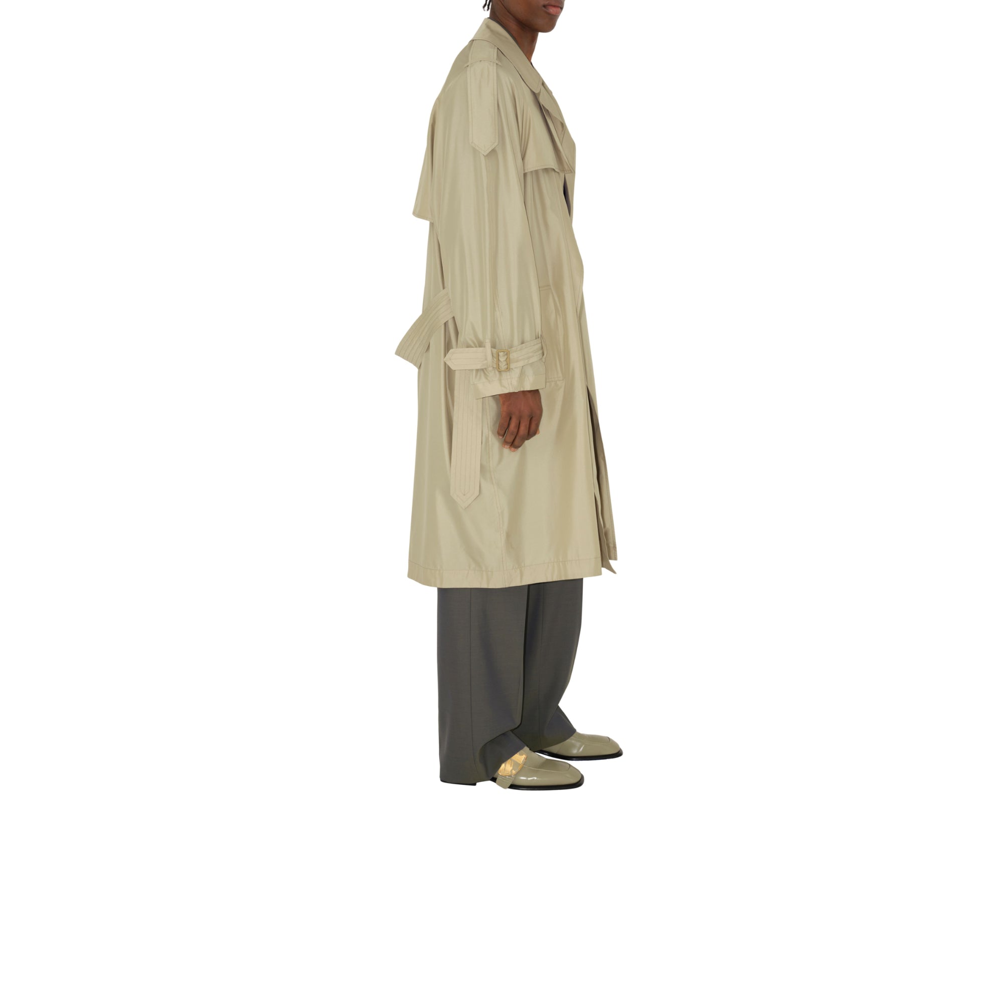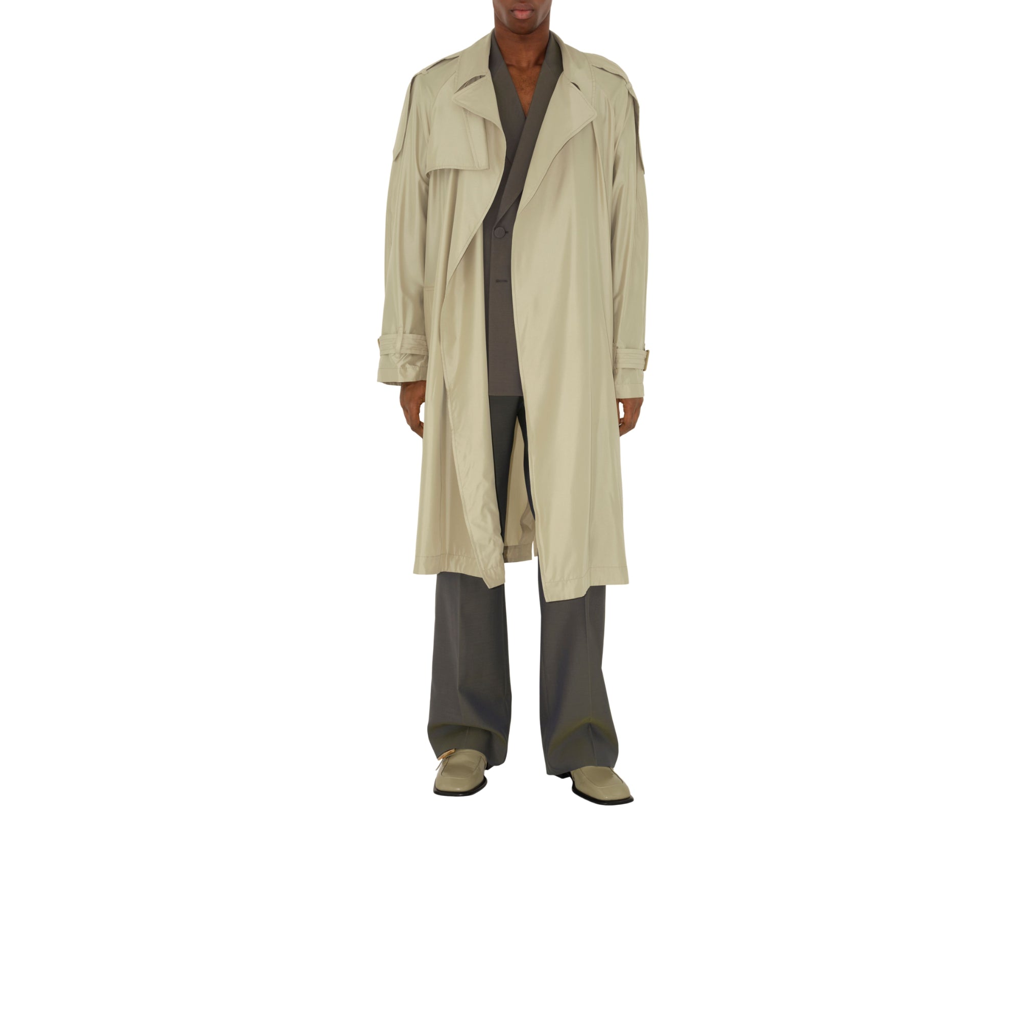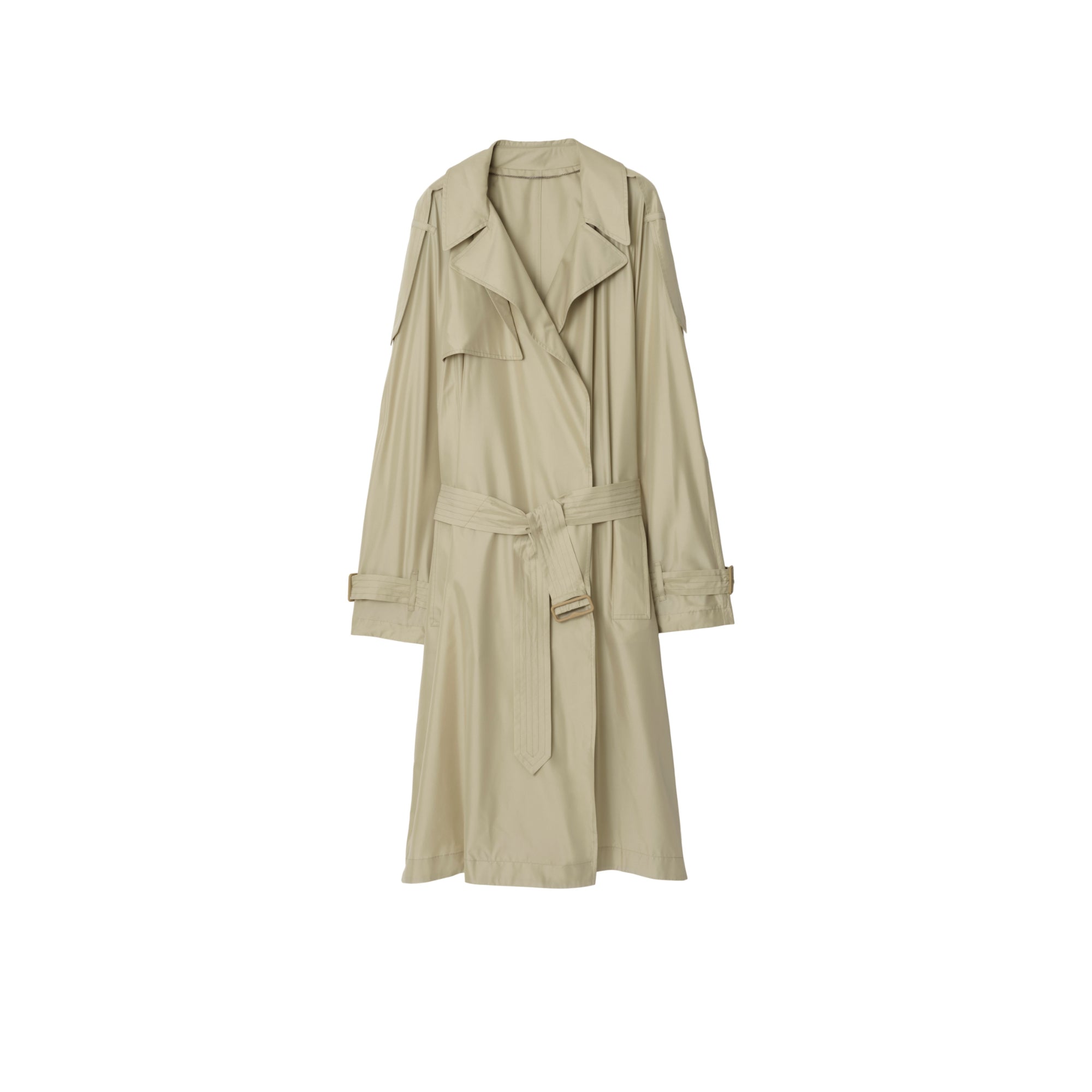 상품설명 : 이탈리안 실크 소재의 오버사이즈핏 랩 트렌치코트. 안감 처리되지 않은 디자인으로, 래글런 소매가 돋보이며 스티치 디테일이 연출된 벨트를 사용해 실루엣을 조절할 수 있습니다.##랩 여밈#견장​#벨트#측면의 웰트 포켓​#커프스의 벨트 디테일​#뒤트임