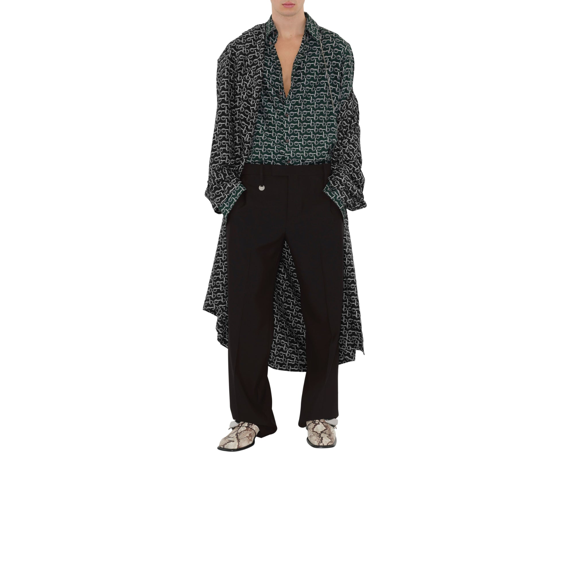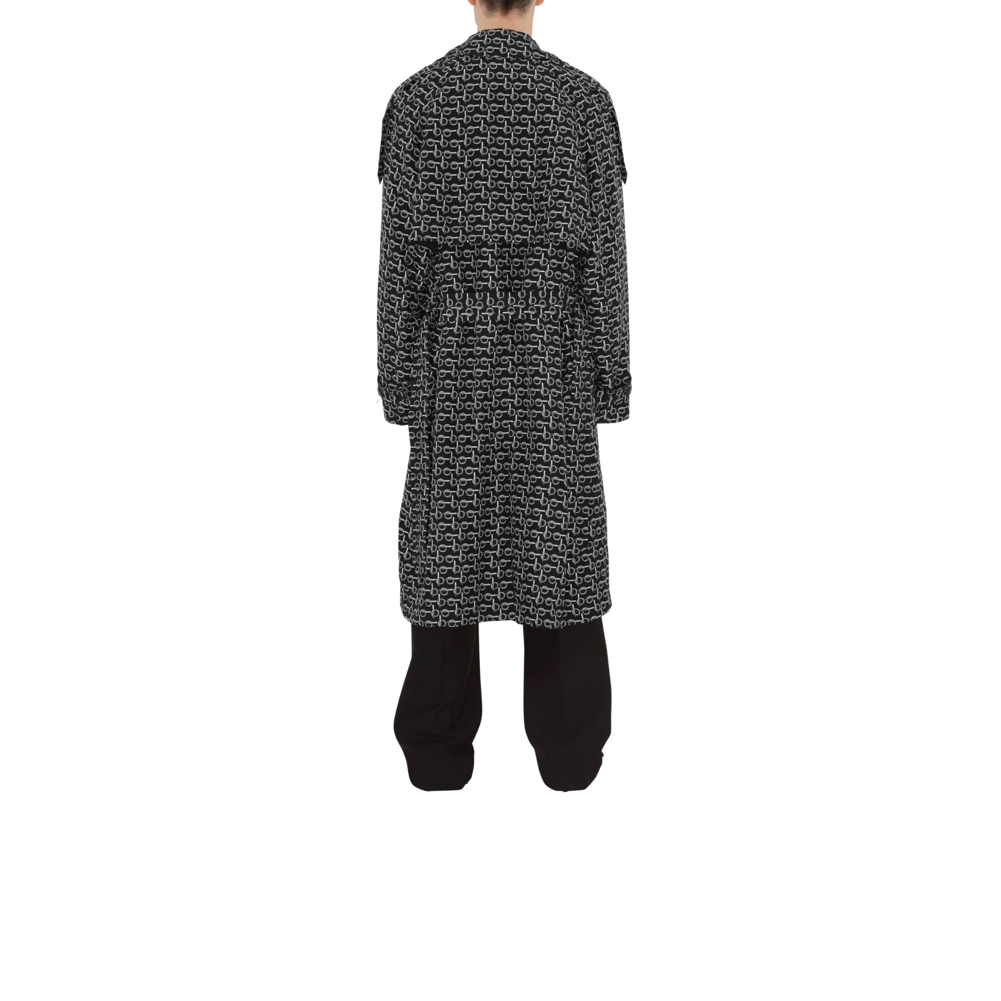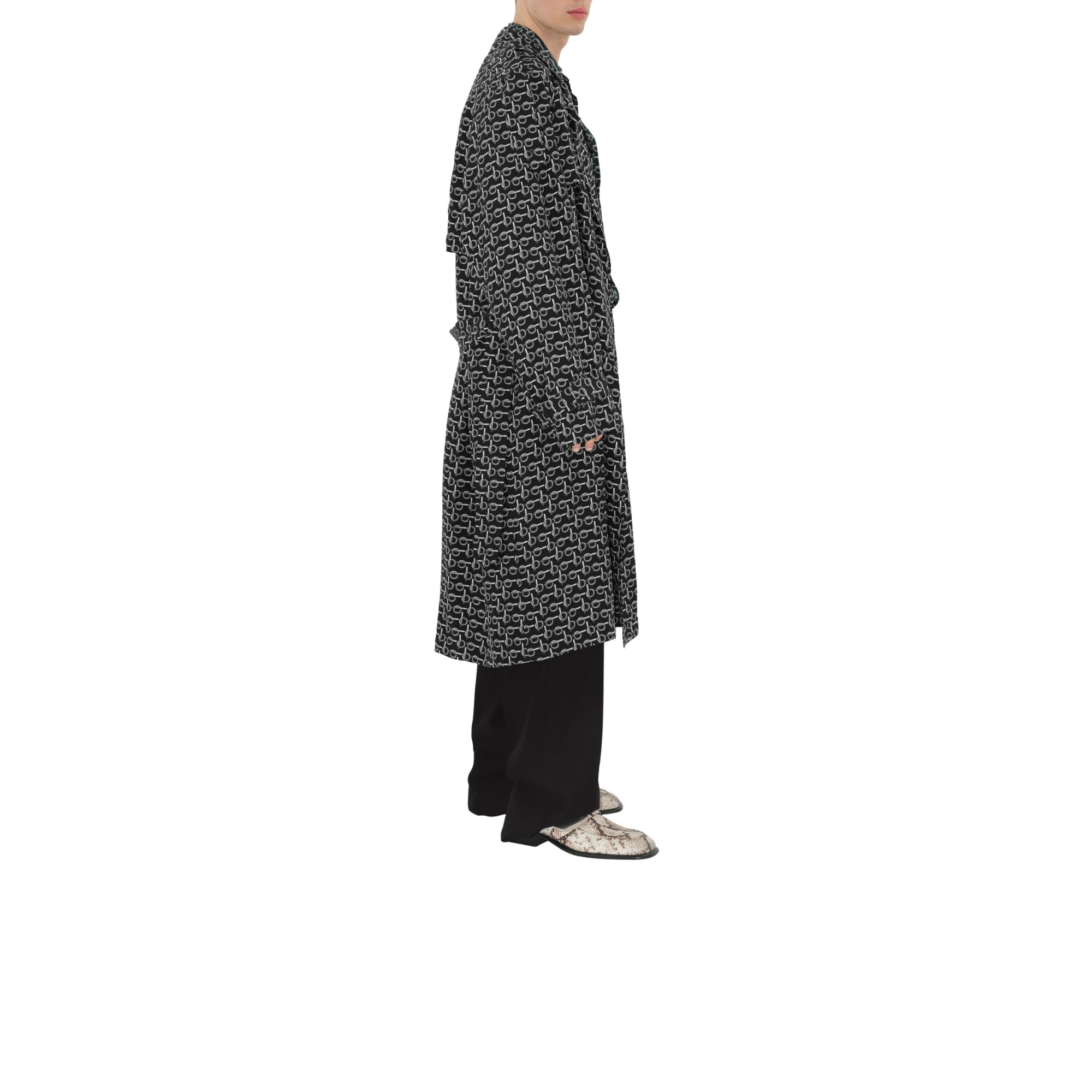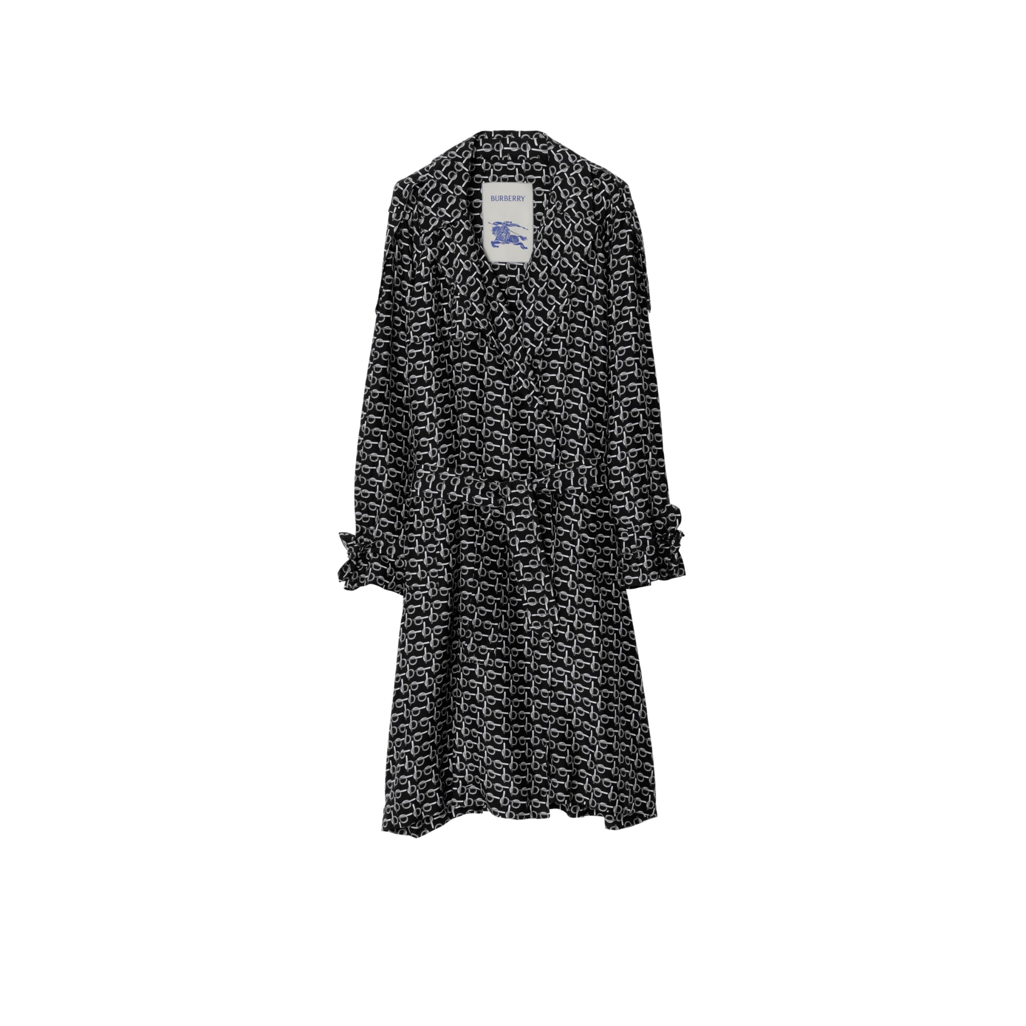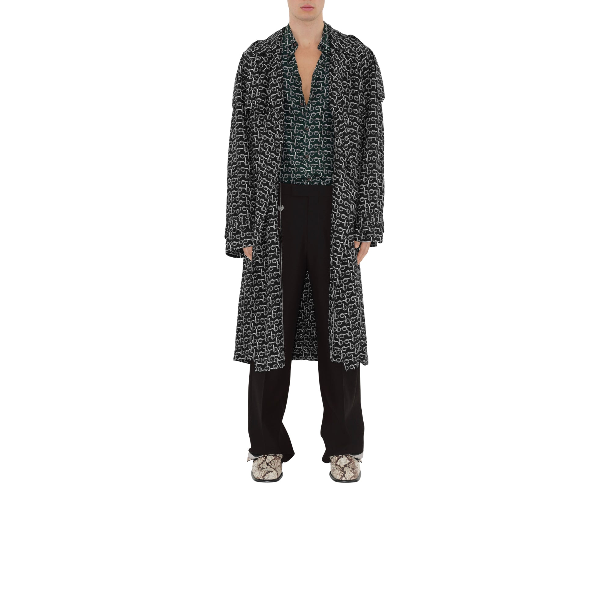 상품설명 : b 모양 여밈 패턴 프린트가 연출된 실크 소재로 이탈리아에서 제작된 랩 트렌치코트. 안감이 없는 릴랙스핏 실루엣, 래글런 소매 및 핏을 조절할 수 있는 벨트가 특징입니다.##랩 여밈#견장​#셀프 타이 벨트#​커프스의 벨트 디테일#​뒤트임#기마상 디자인(Equestrian Knight Design, EKD) 라벨
