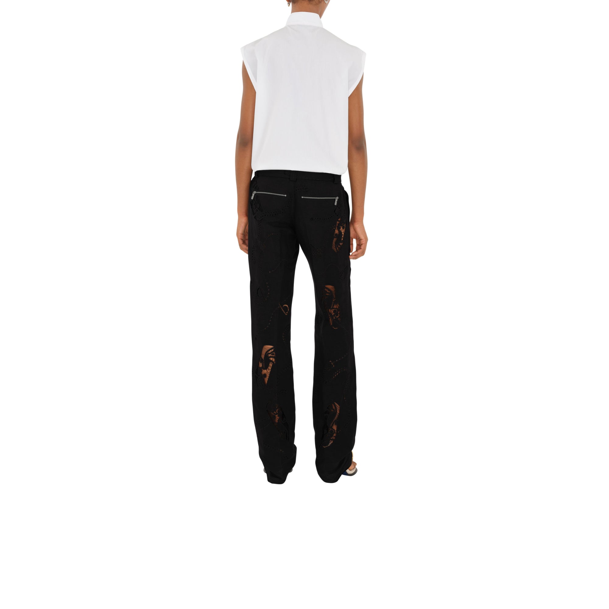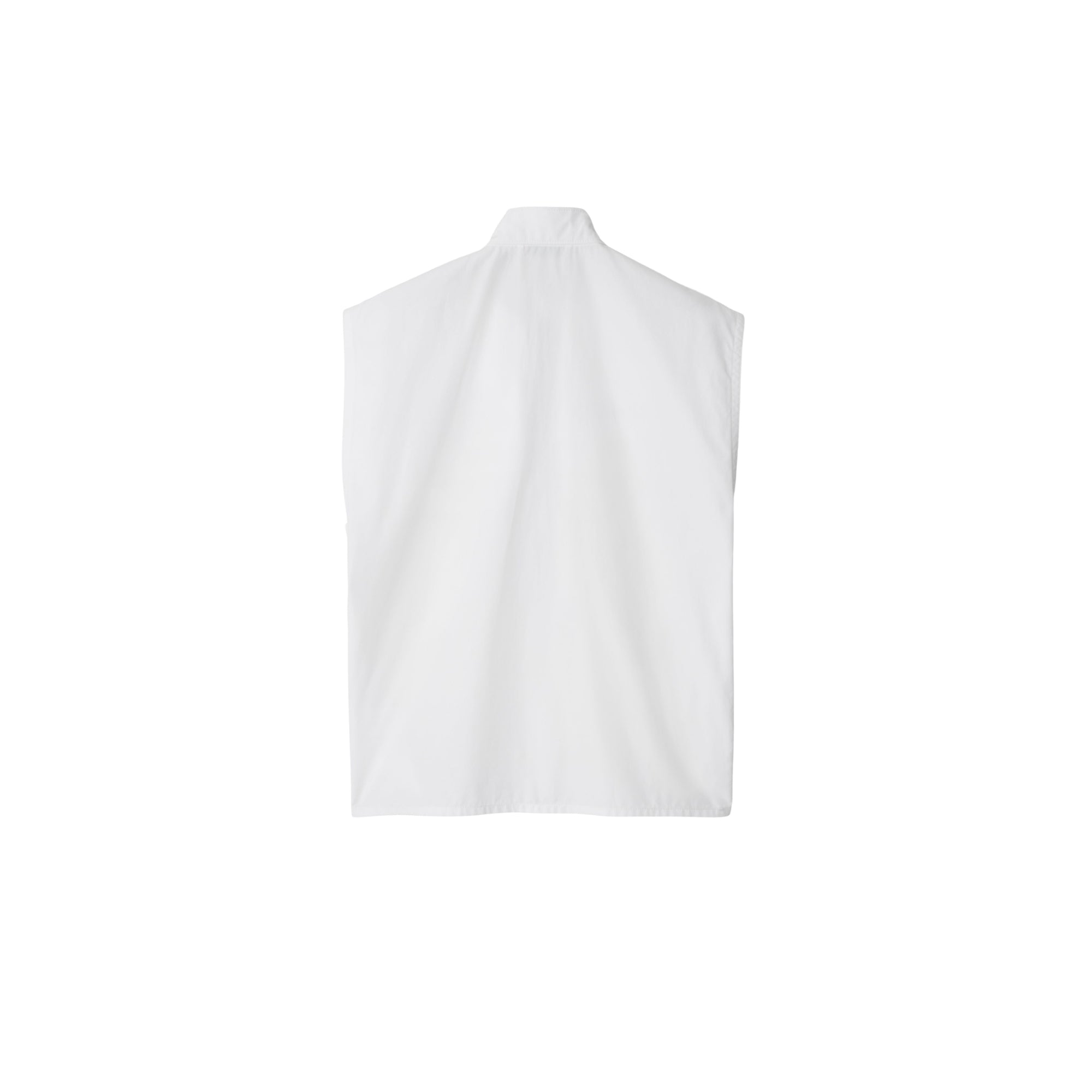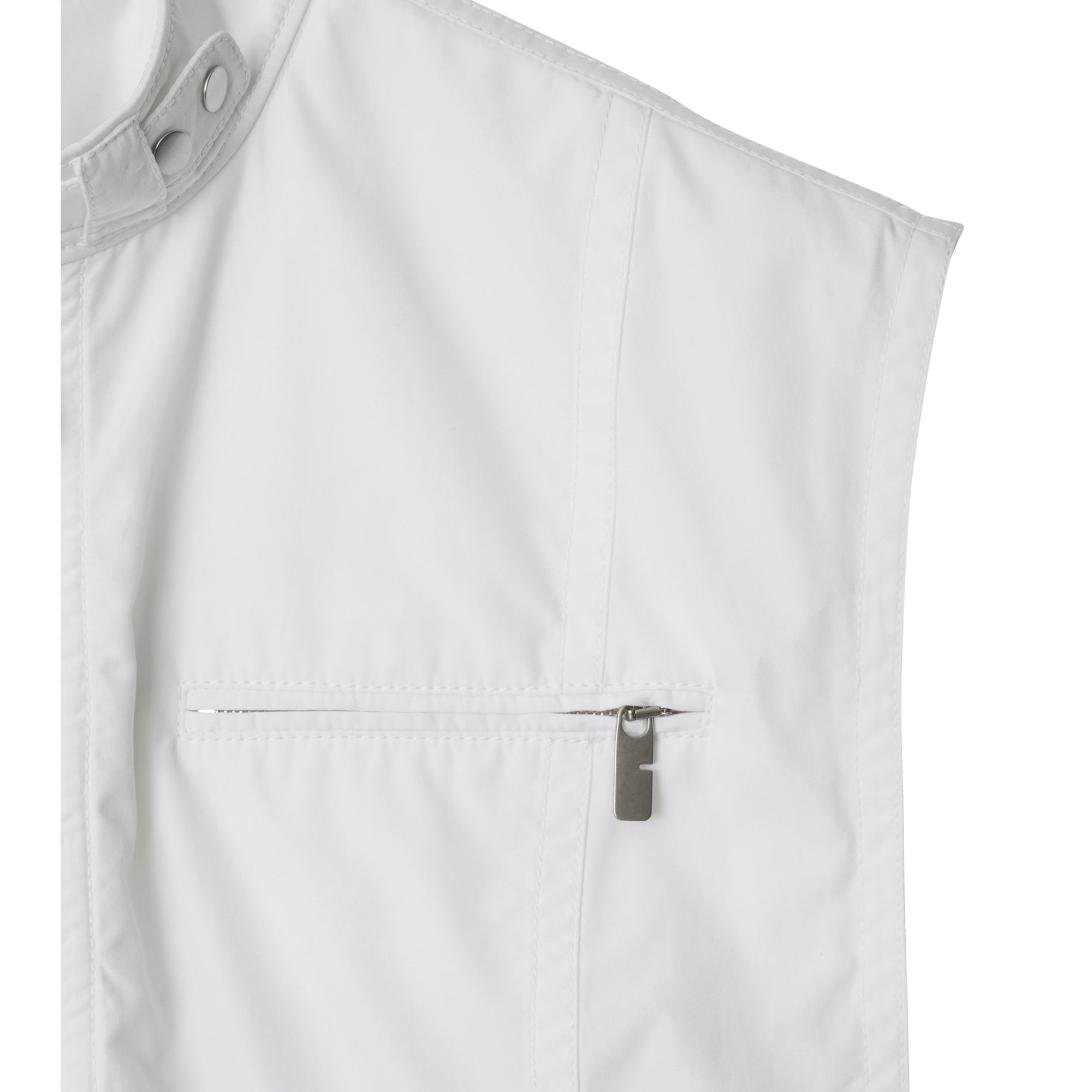 상품설명 : 면 포플린 소재의 레귤러핏 민소매 상의. 모터사이클 재킷과 펑크 스타일에서 영감을 받은 칼라의 스냅 단추 및 지퍼 디테일이 특별함을 더하는 아이템.##플래킷의 지퍼 디테일#가슴의 지퍼 포켓