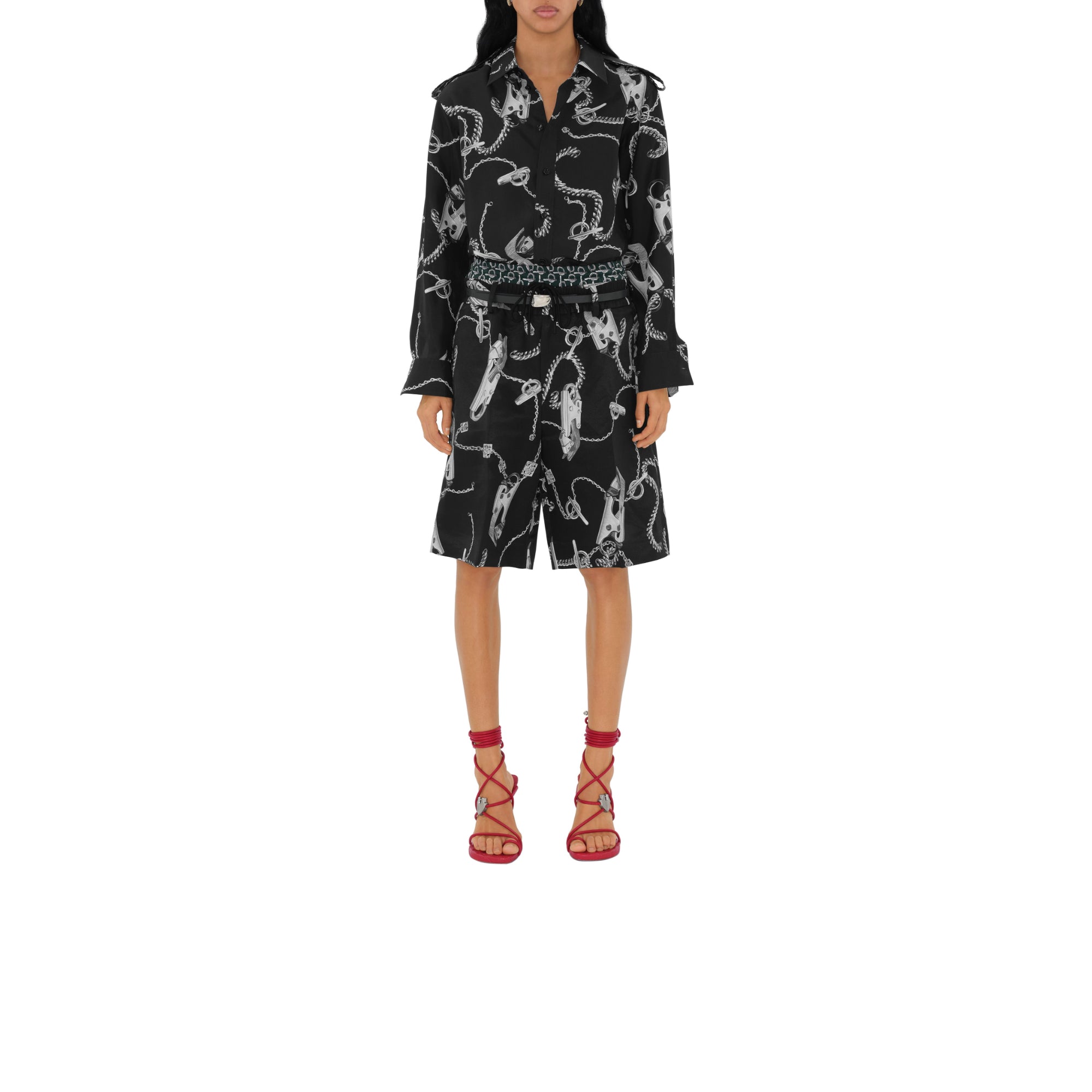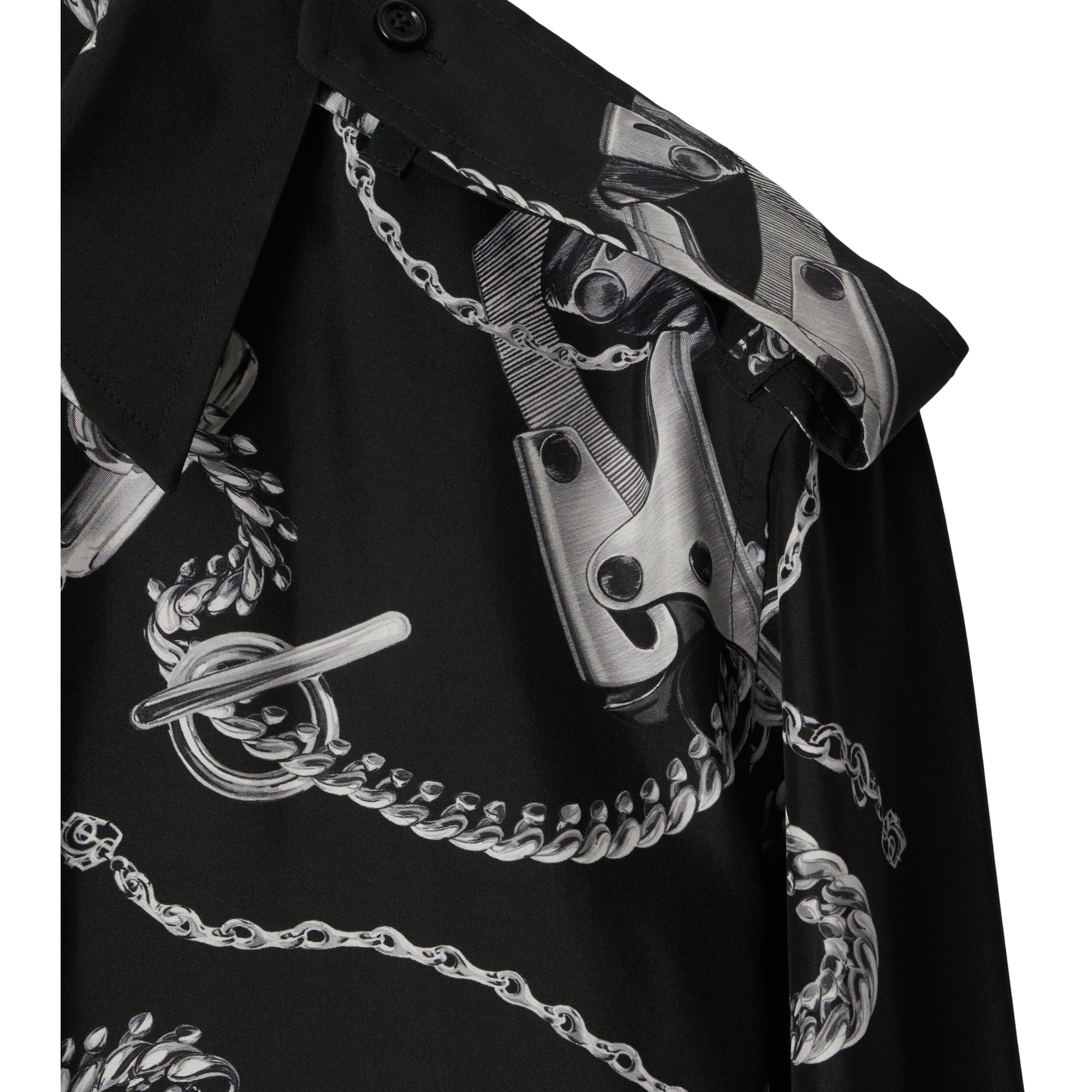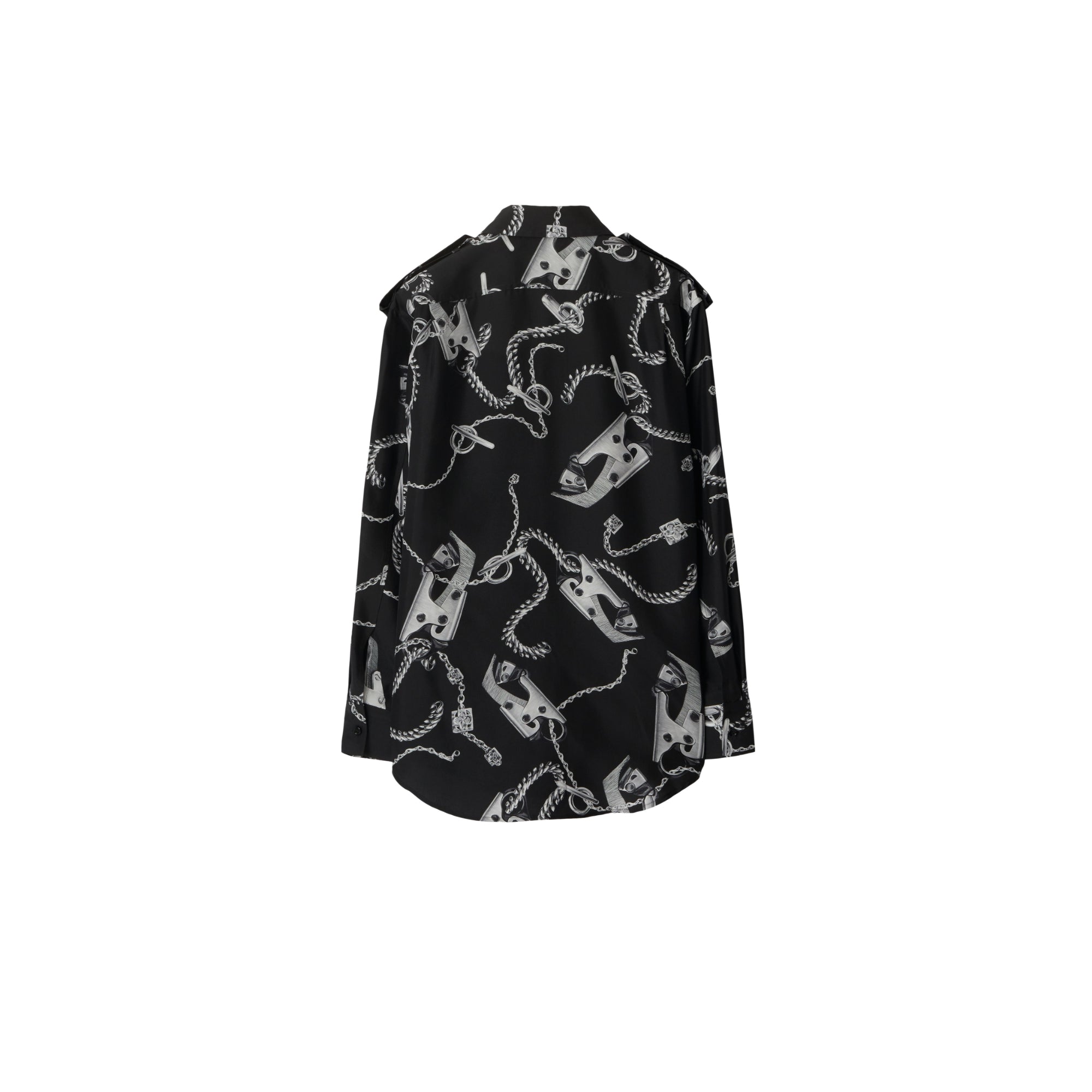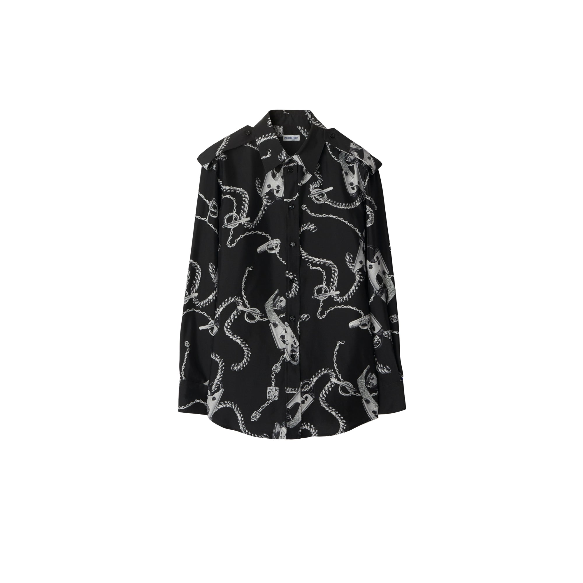 상품설명 : 실크 포플린 소재로 이탈리아에서 제작된 레귤러핏의 긴소매 셔츠. 수작업으로 그린 후 프린트된 버버리 주얼리 및 가방 하드웨어 아트워크가 특징.##단추 여밈#포인트 칼라#견장#싱글 버튼 커프스#곡선형 밑단