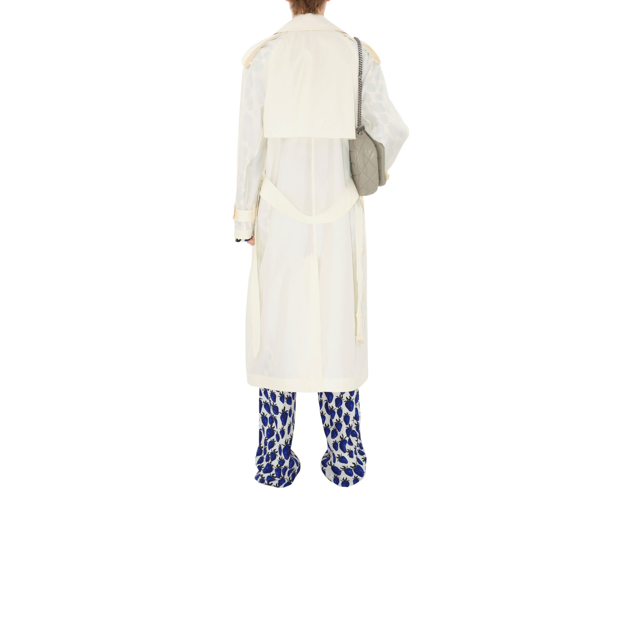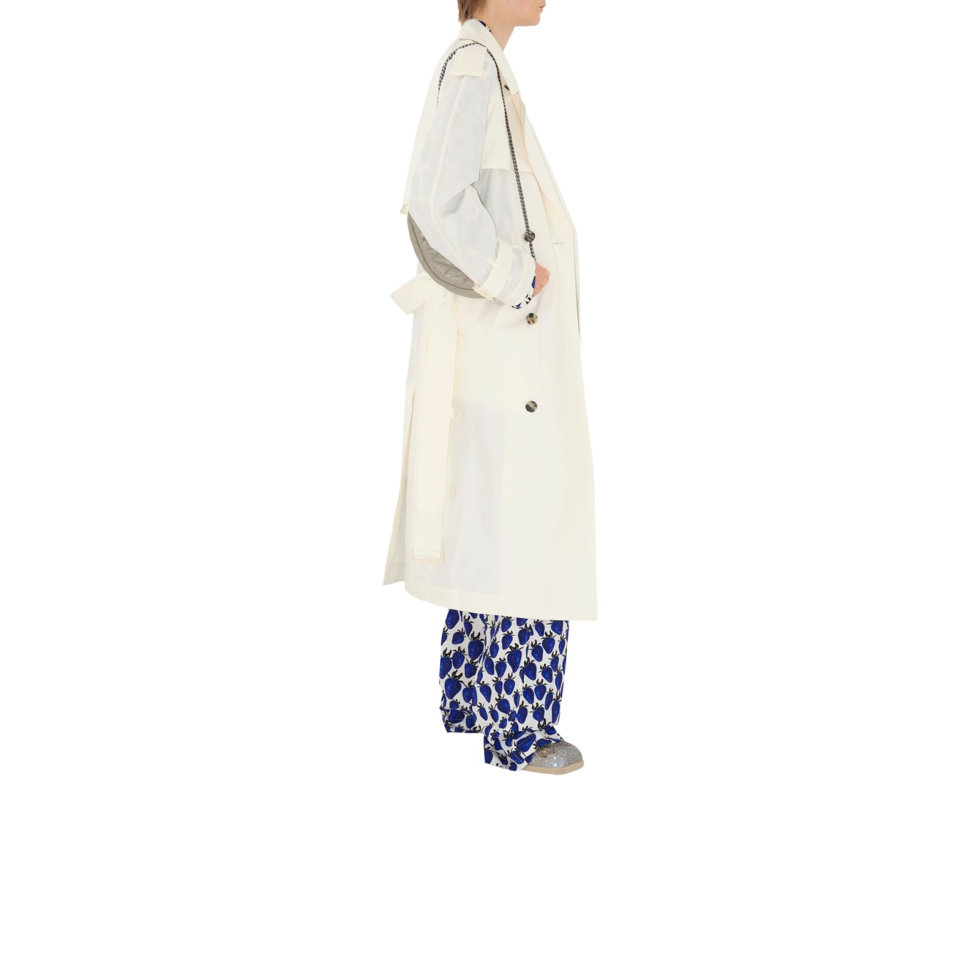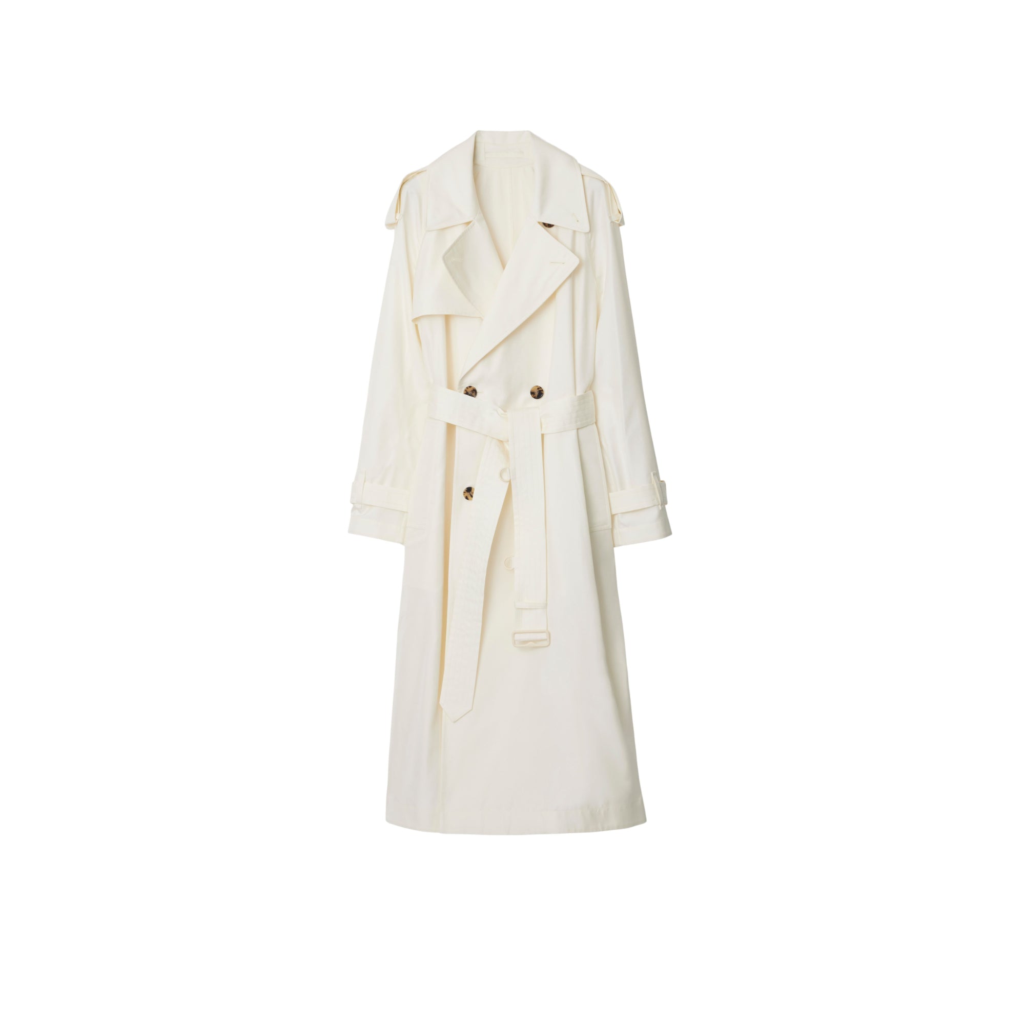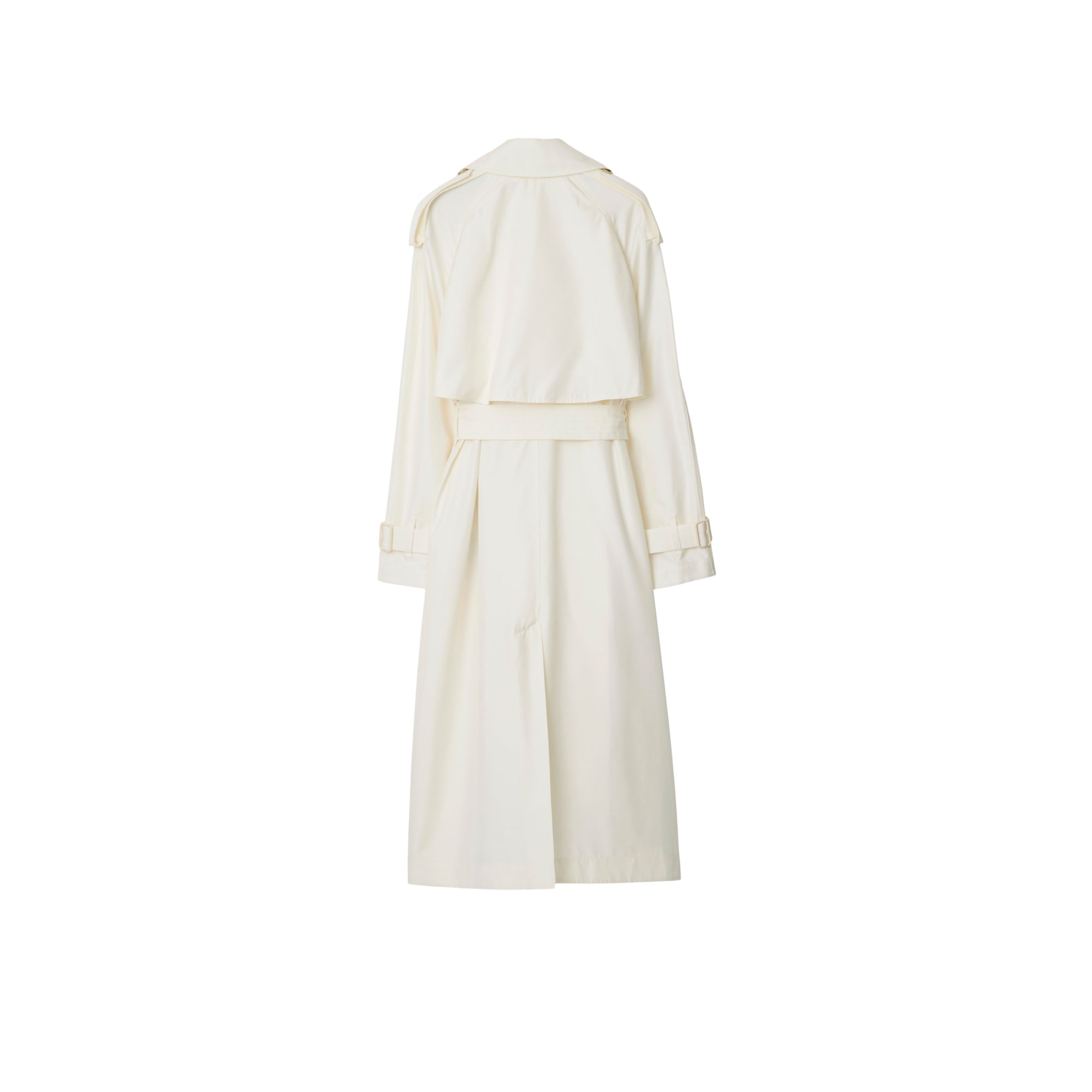 상품설명 : 이탈리안 실크 소재의 경량 트렌치코트. 릴랙스핏 실루엣, 래글런 소매 및 과감한 디자인의 견장이 특징입니다. B 버클 벨트를 사용해 미드 또는 로우 웨이스트의 두 가지 스타일로 착용할 수 있습니다.##더블브레스트 단추 여밈#견장#측면의 웰트 포켓#커프스의 벨트 디테일#뒤트임