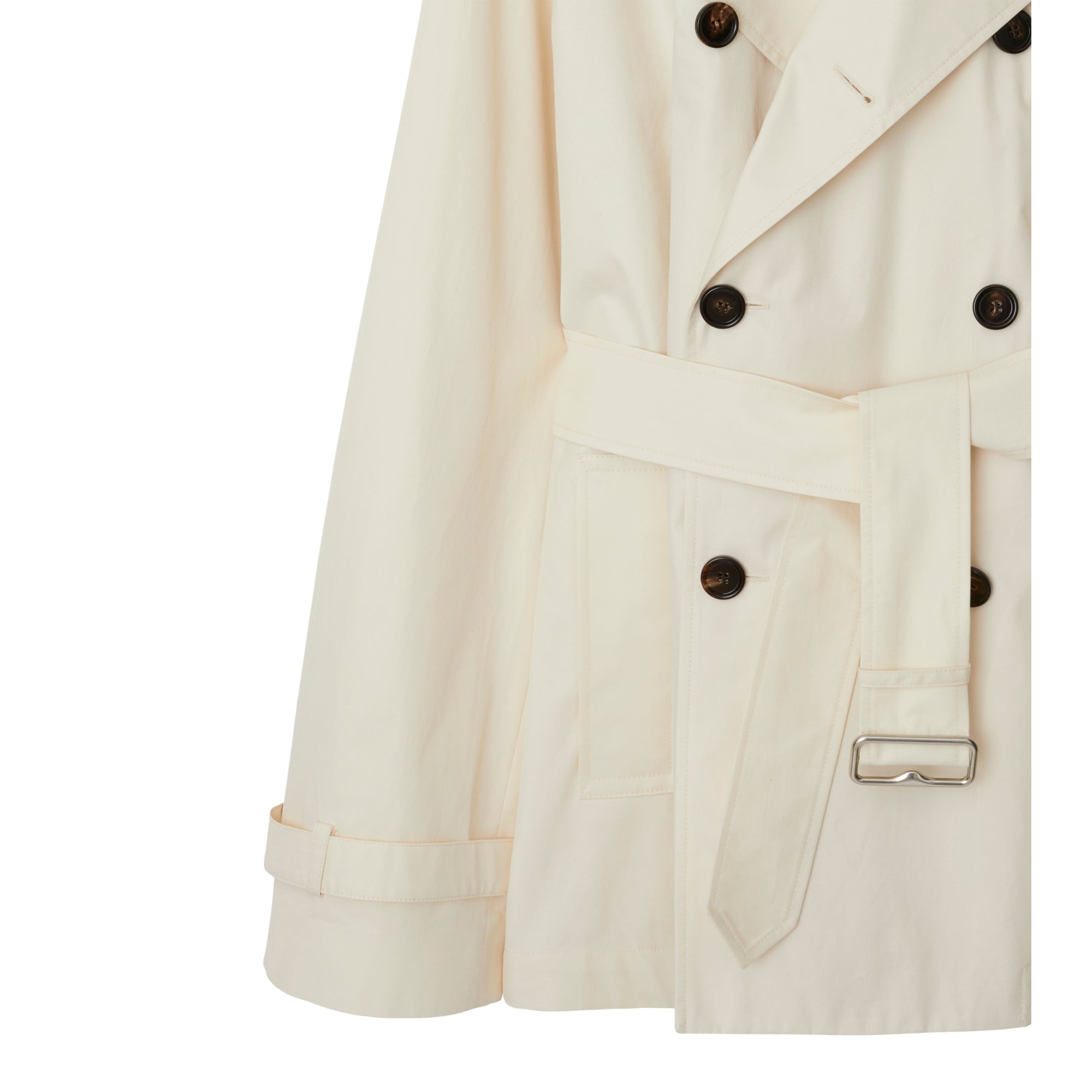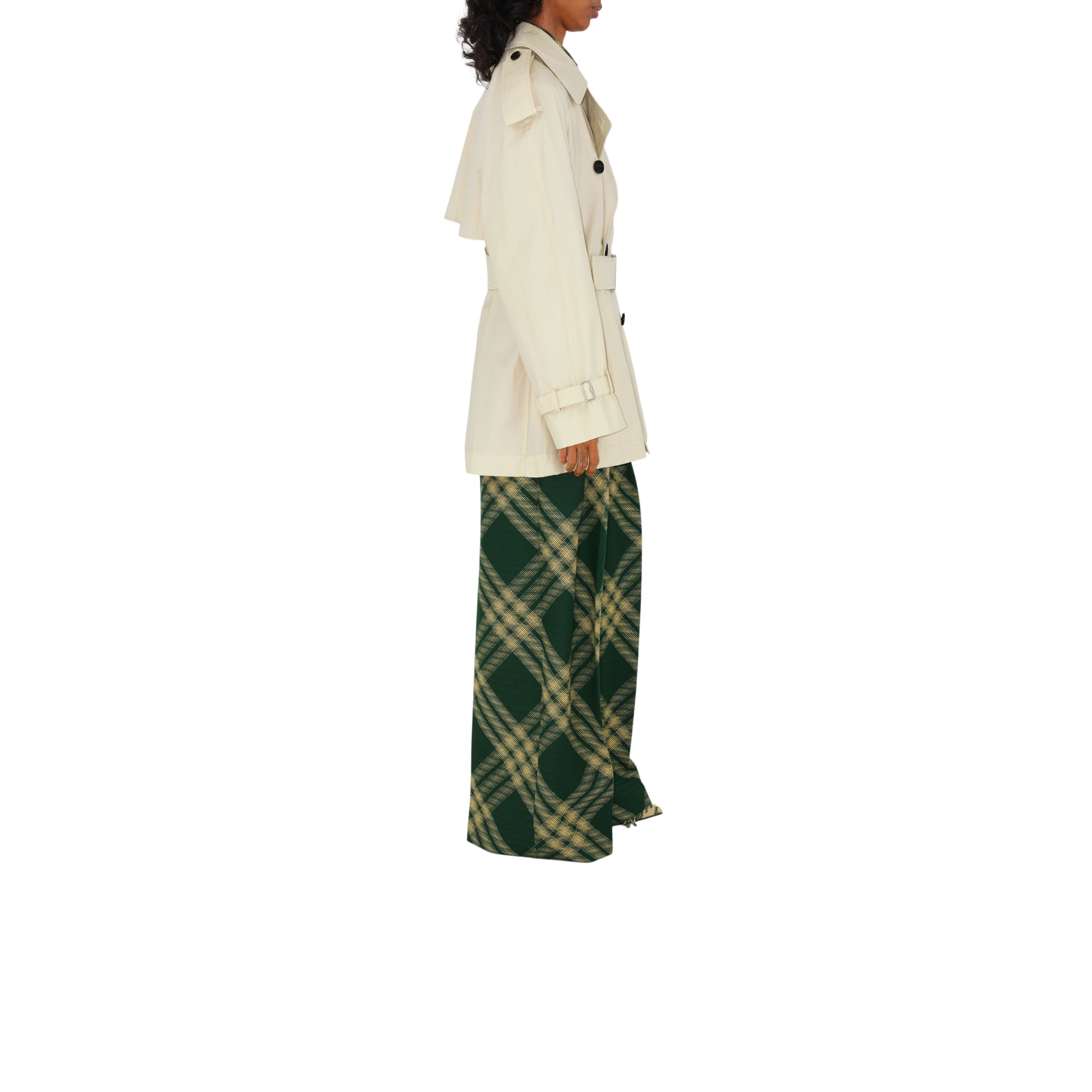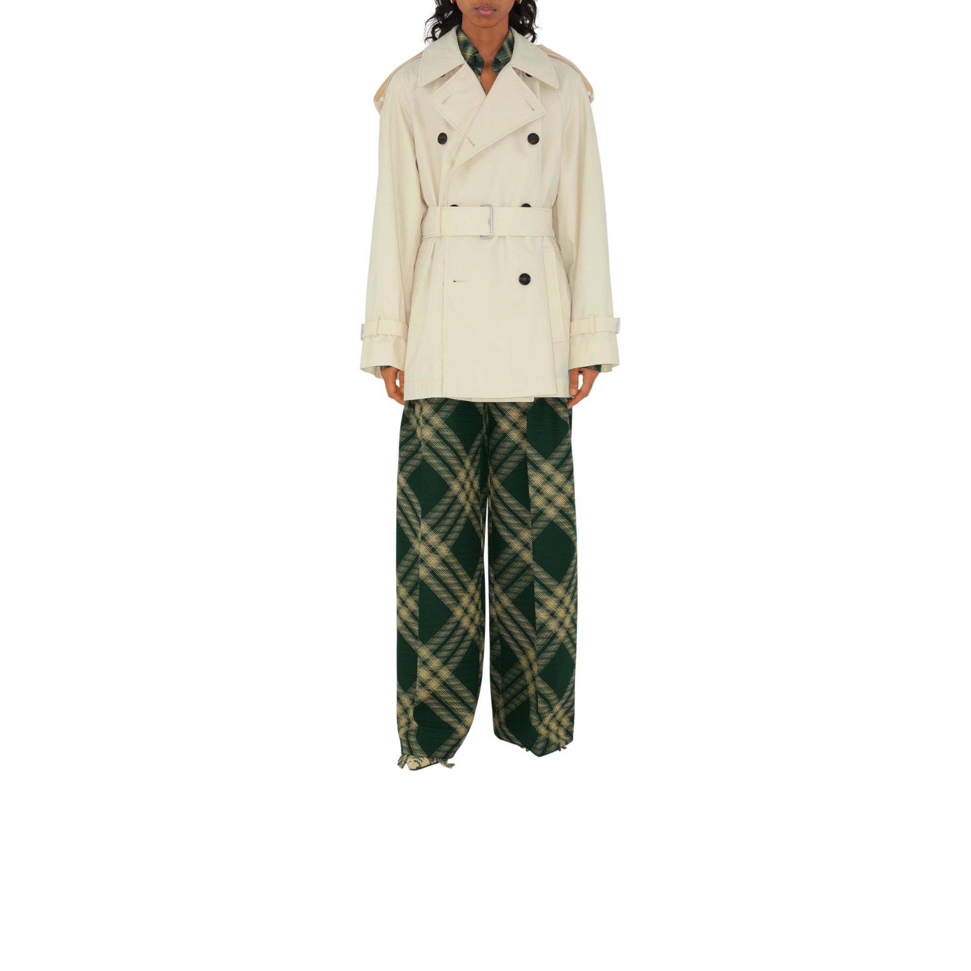 상품설명 : 생활 방수 면 개버딘 소재의 트렌치코트. 1920년대부터 버버리 코트의 안감으로 사용되어 온 버버리 체크 면 소재가 내부를 장식합니다. 오버사이즈핏 실루엣과 래글런 소매가 특징입니다.##더블브레스트 단추 여밈#견장#B 버클 벨트#측면의 웰트 포켓#커프스의 벨트 디테일#안감과 밑깃의 버버리 체크