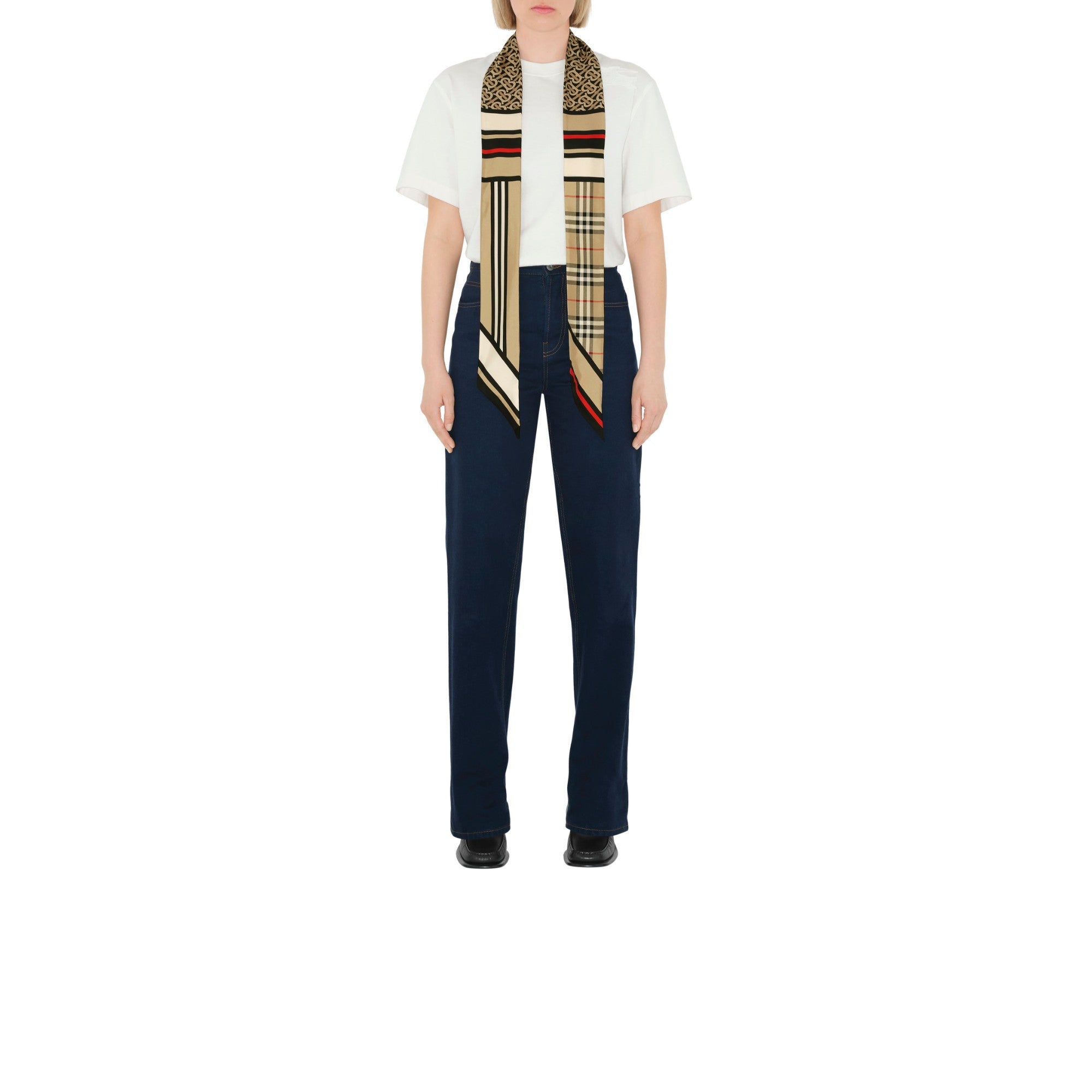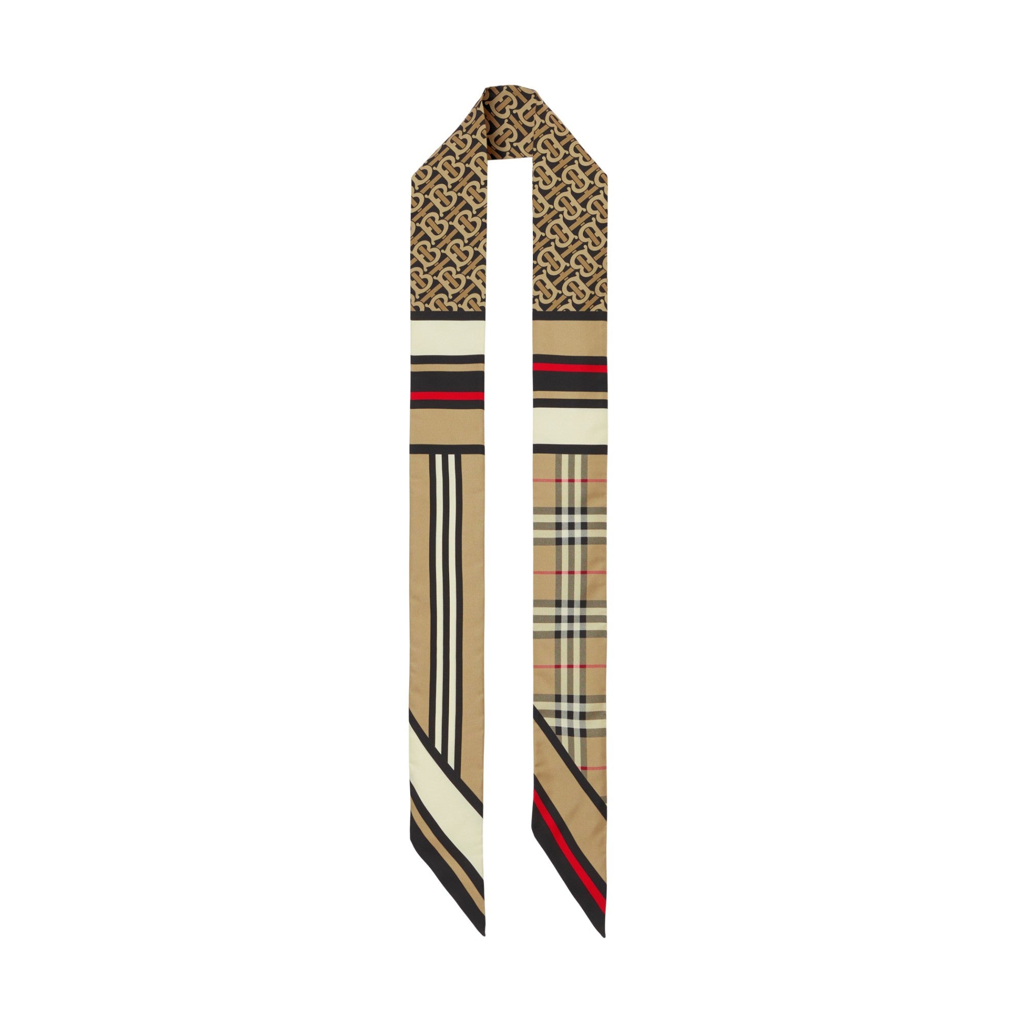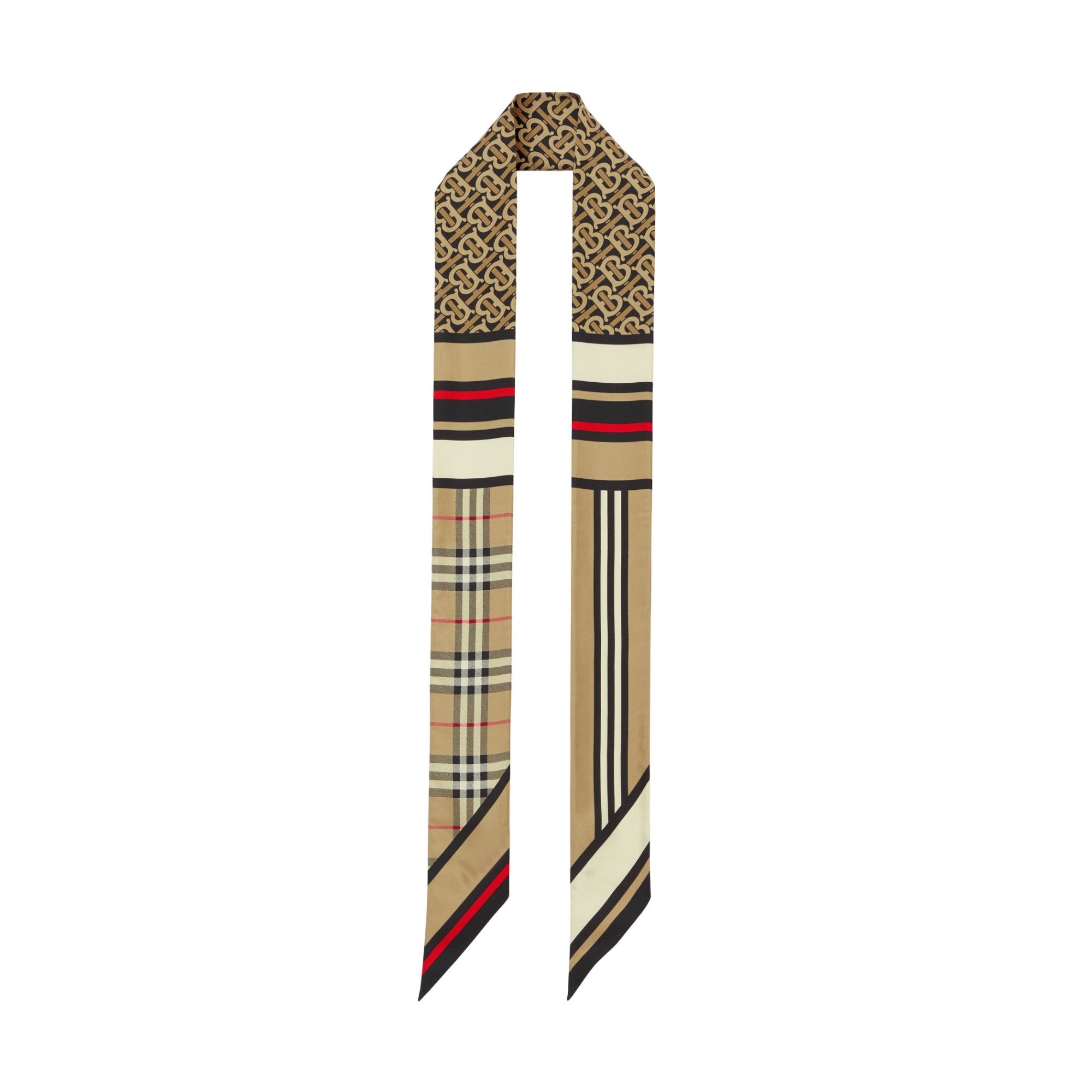 상품설명 : 이탈리아에서 제작된 실크 트윌 소재의 스키니 스카프. 토마스 버버리 모노그램, 버버리 체크 및 아이콘 스트라이프 프린트가 특징.##좁아지는 실루엣의 양 끝부분