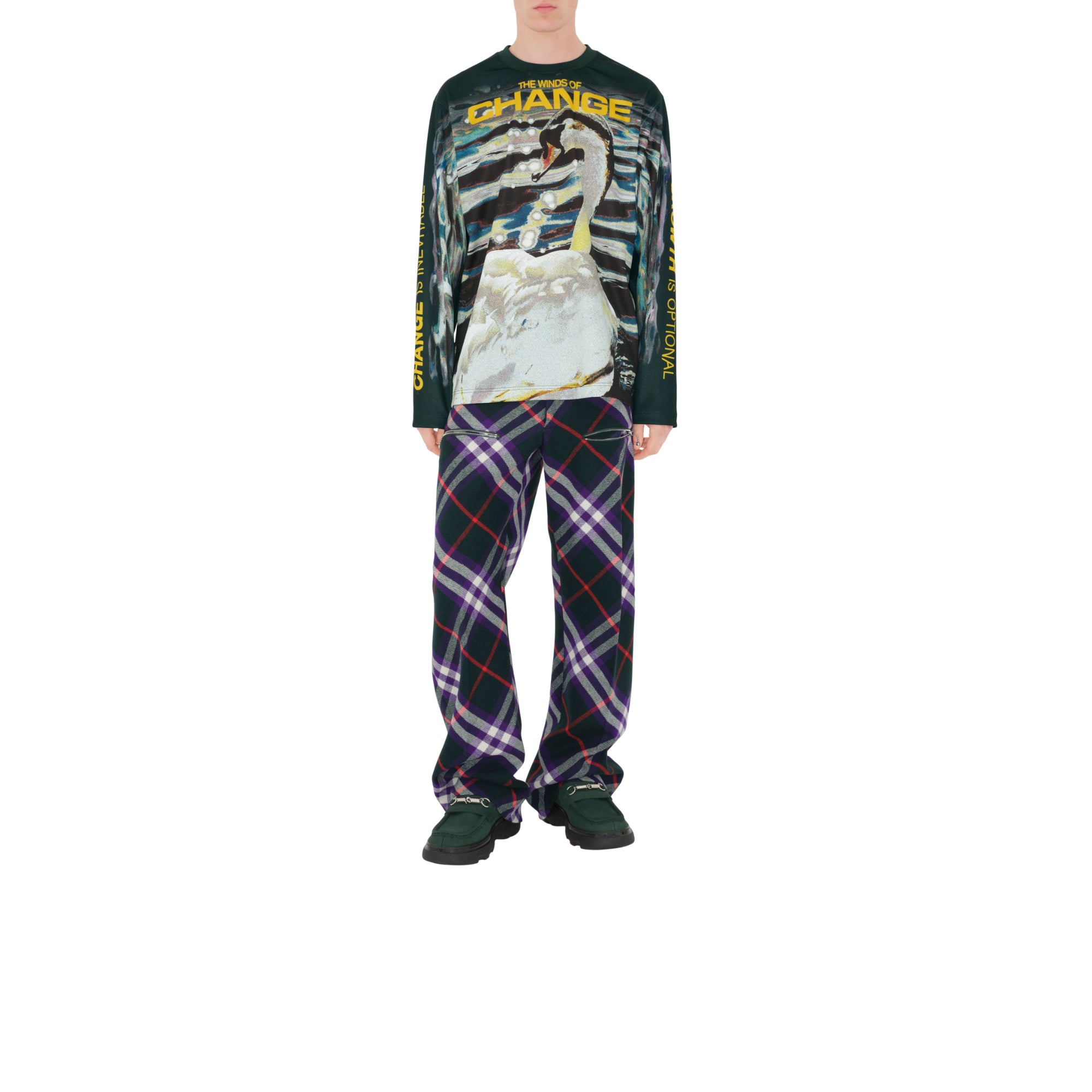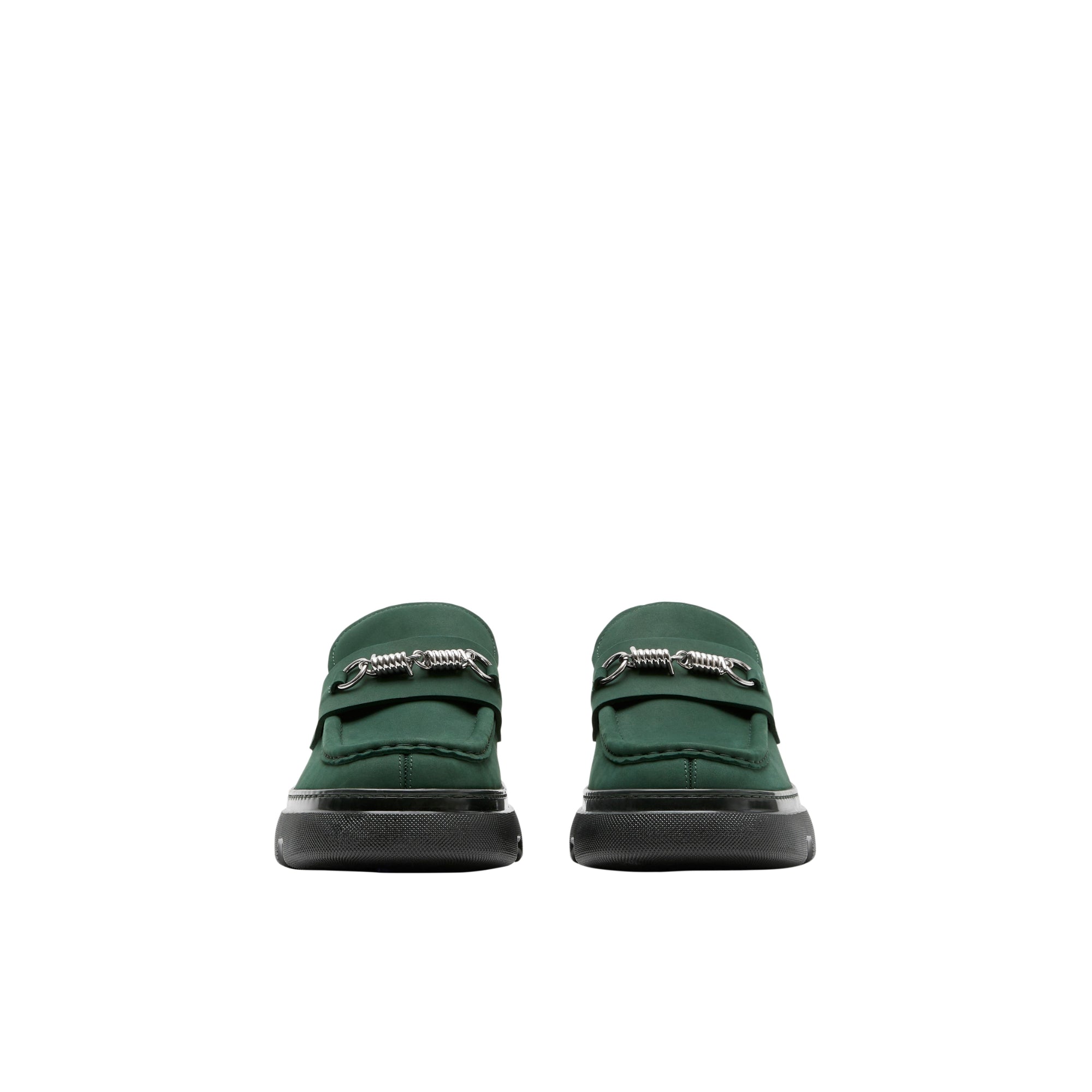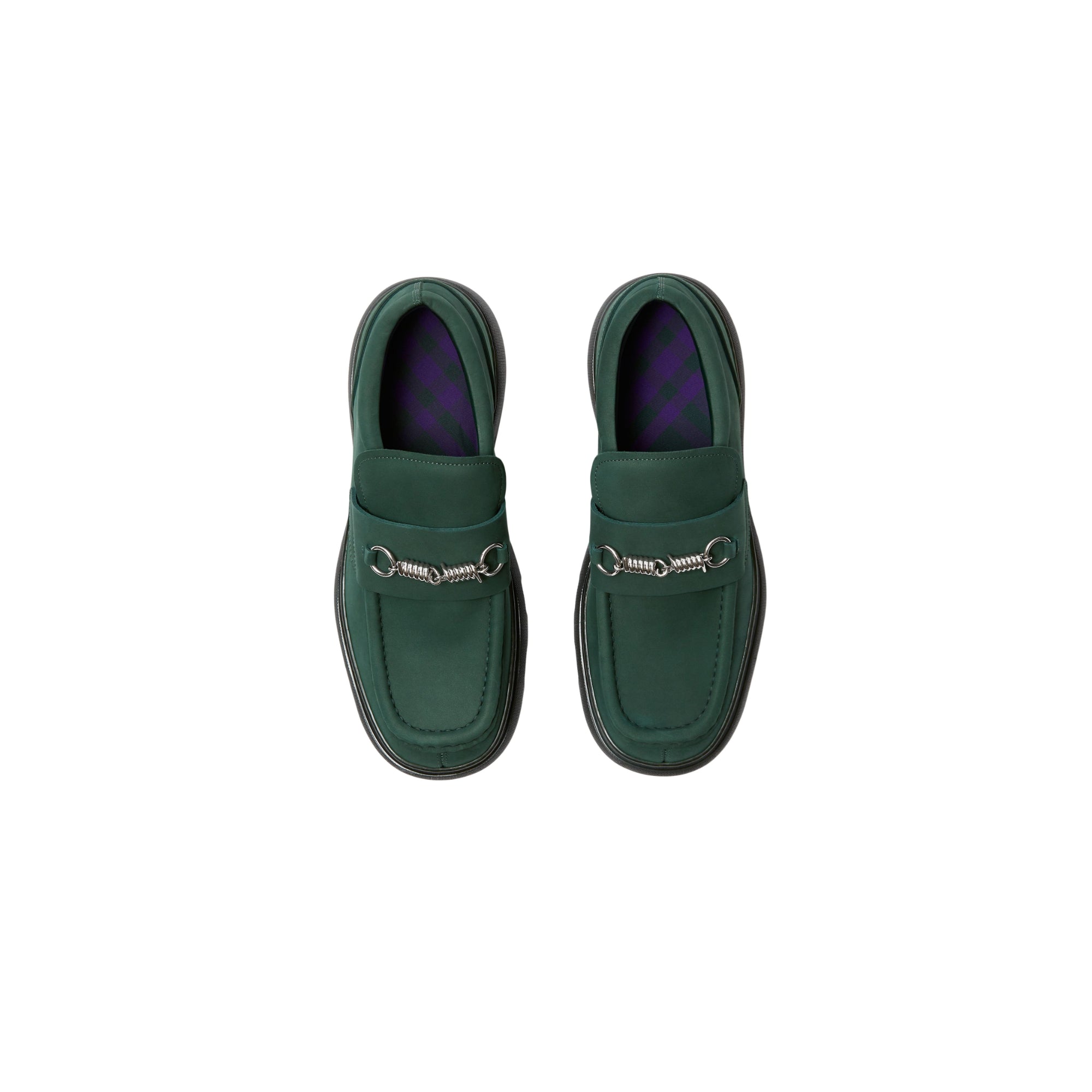 상품설명 : 누벅 소재로 이탈리아에서 제작된 로퍼. 독특한 와이어 하드웨어 디테일이 돋보이며 가죽 밑창에 엠보싱으로 연출된 기마상 디자인(Equestrian Knight Design, EKD)이 특징.##둥근 앞코#바브드 와이어 하드웨어#체크 안창#밑창의 버버리 레터링