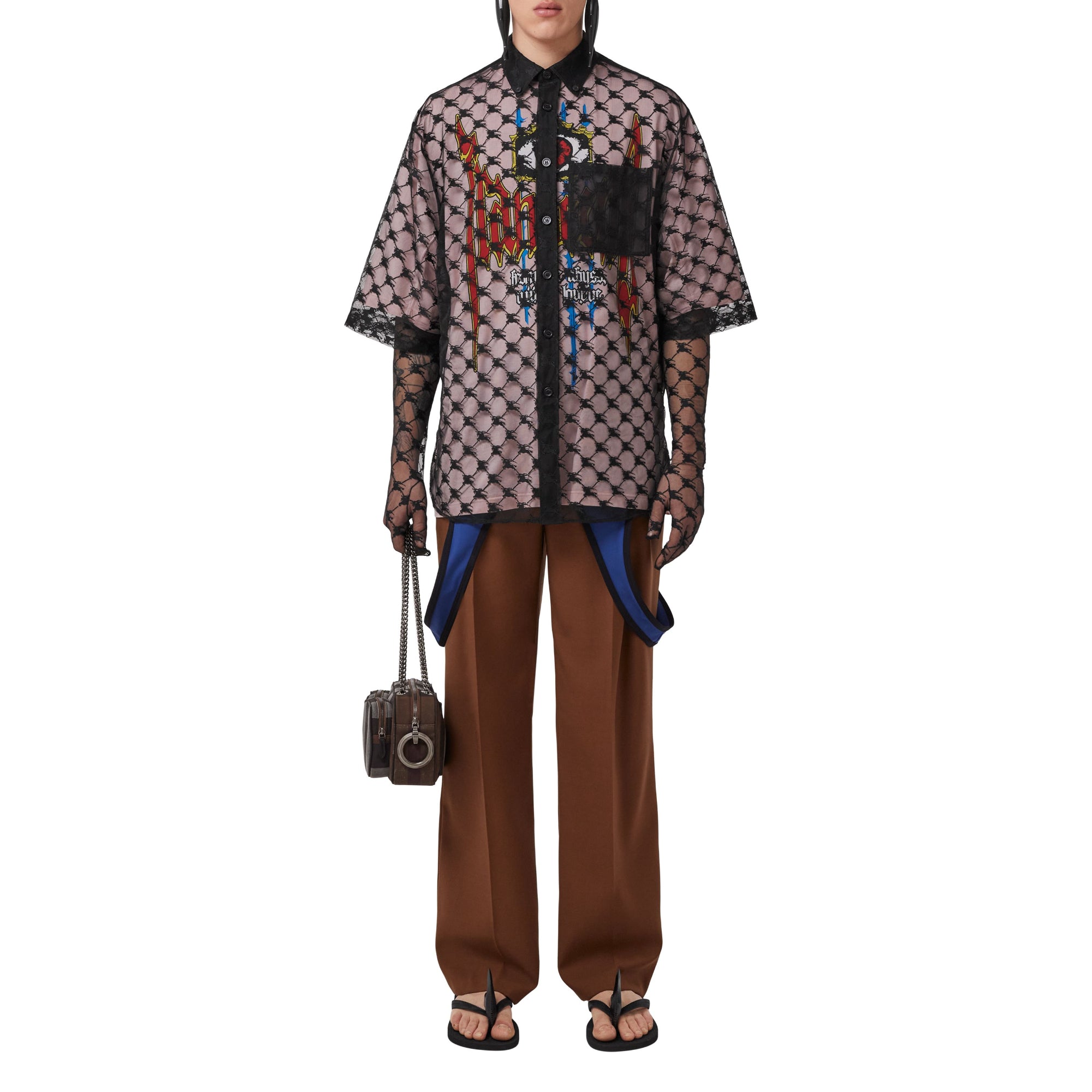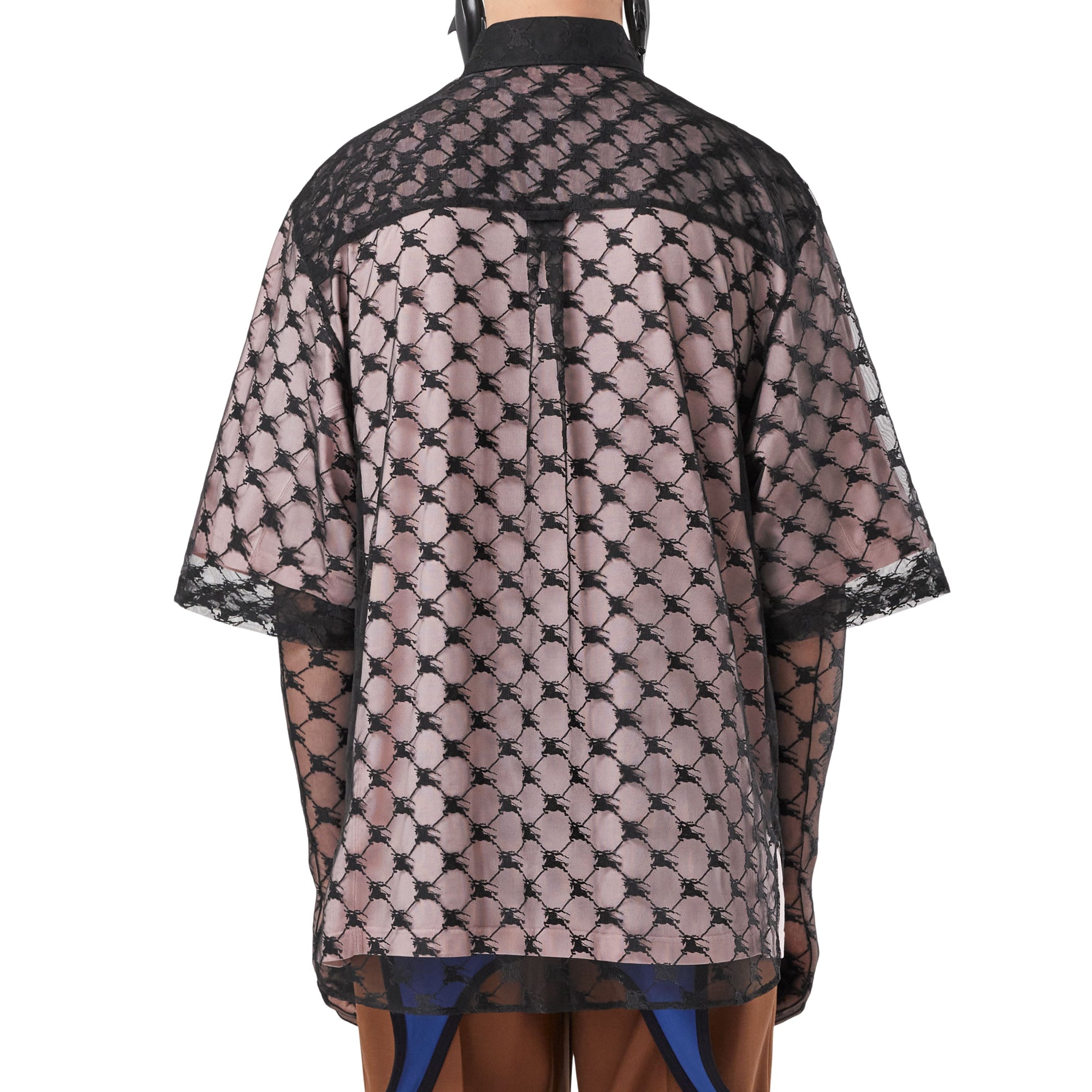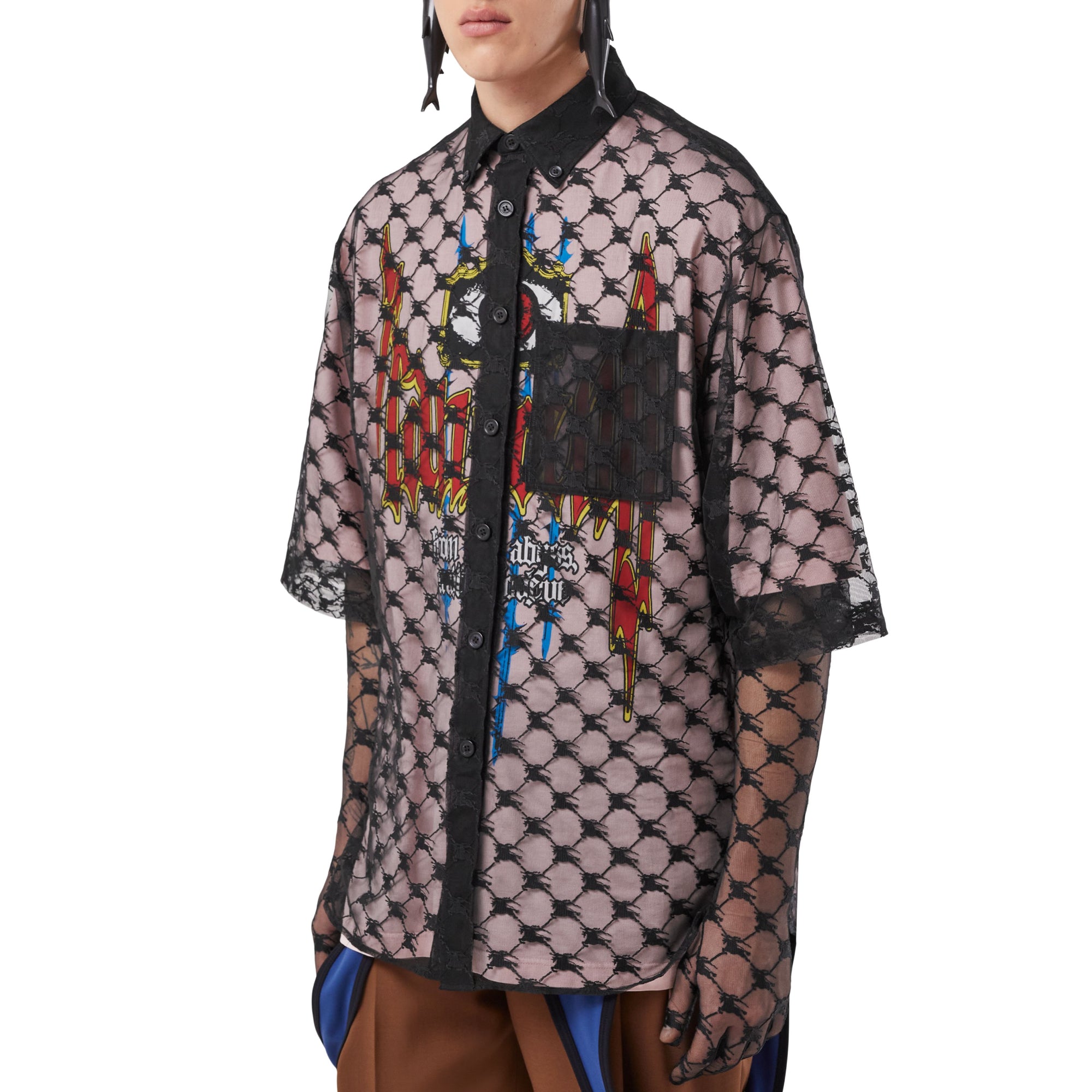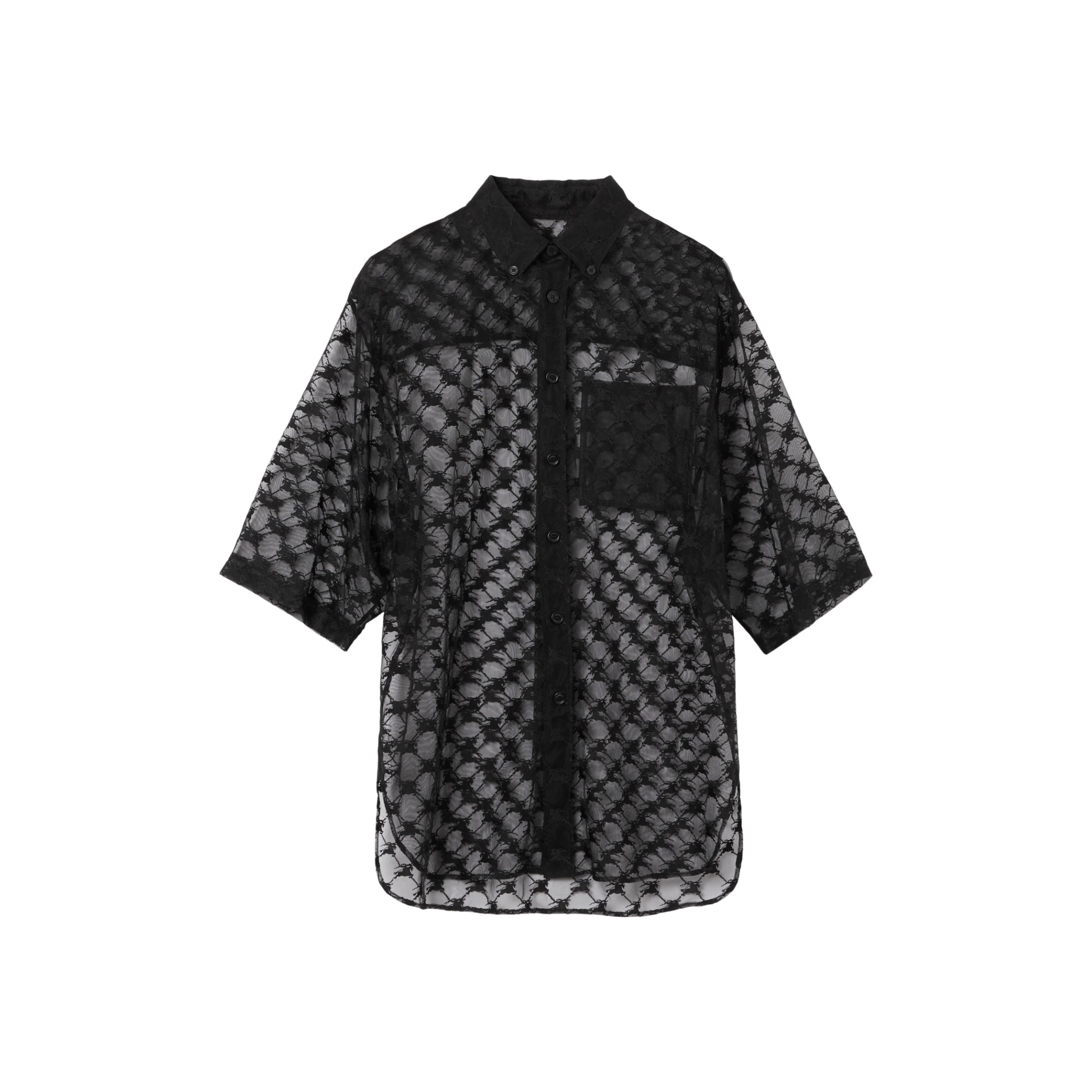 상품설명 : 신축성 있는 투명 레이스 소재의 반소매 셔츠. 버버리 아카이브 엠블럼을 현대적인 감각으로 재해석한 기마상 디자인 자수와 단정한 버튼 다운 칼라가 특징입니다. 2023 버버리 봄/여름 런웨이 컬렉션을 구성하는 아이템입니다.
