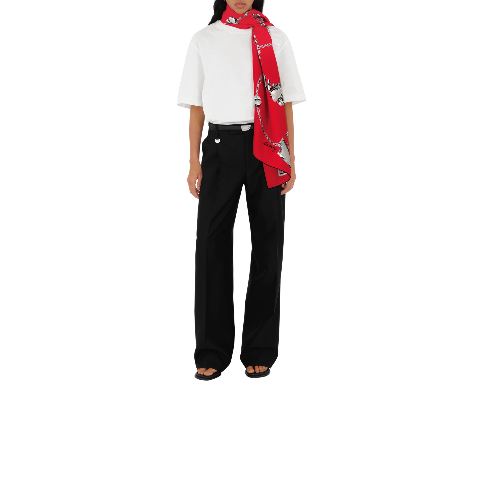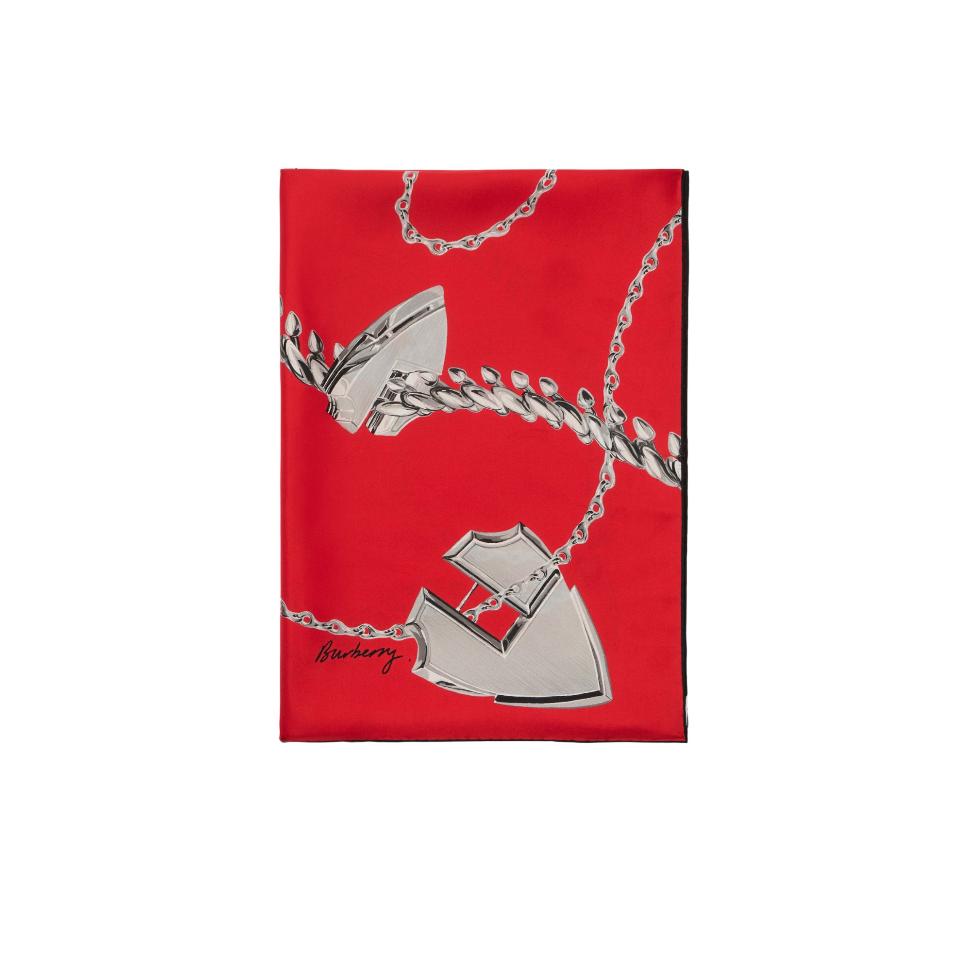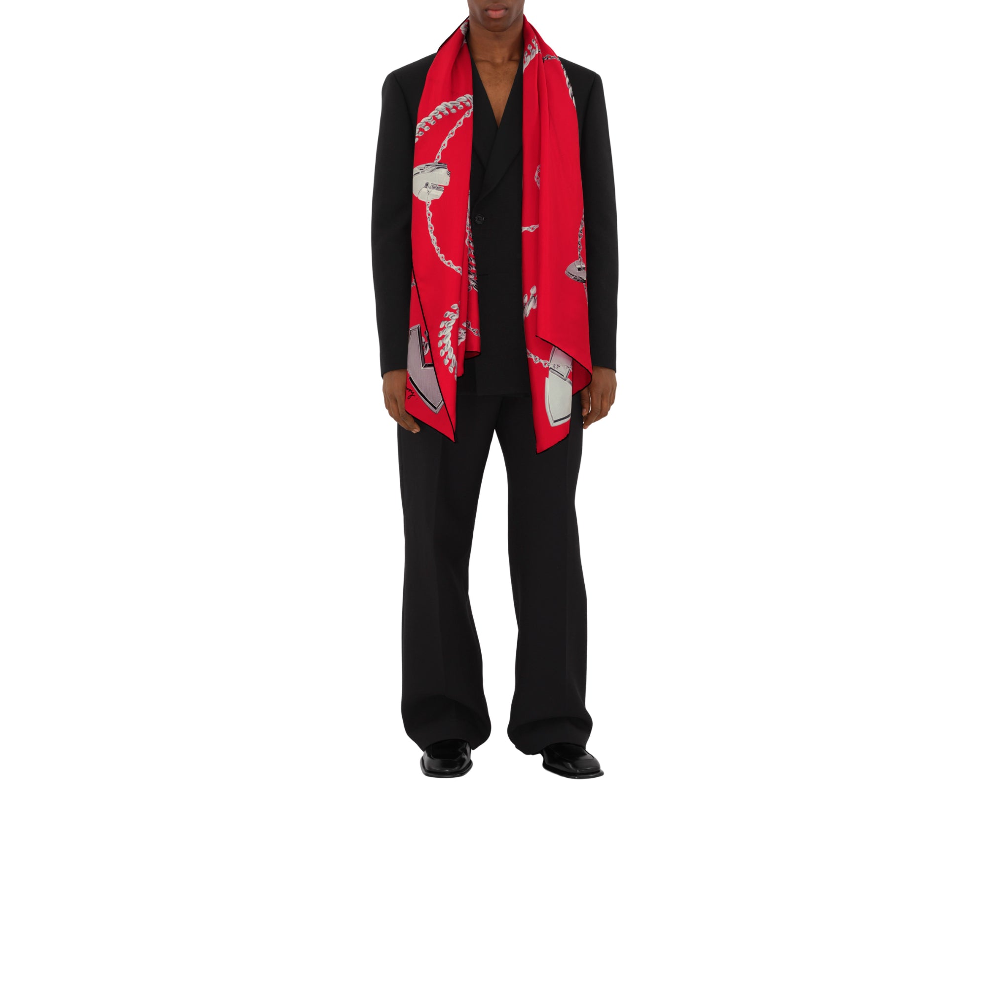 상품설명 : 실크 트윌 소재로 이탈리아에서 제작된 스카프. 수작업으로 그린 후 프린트로 완성된 버버리 주얼리 및 가방 하드웨어 아트워크가 특징.##직사각형#수작업으로 완성된 테두리#버버리 레터링 프린트