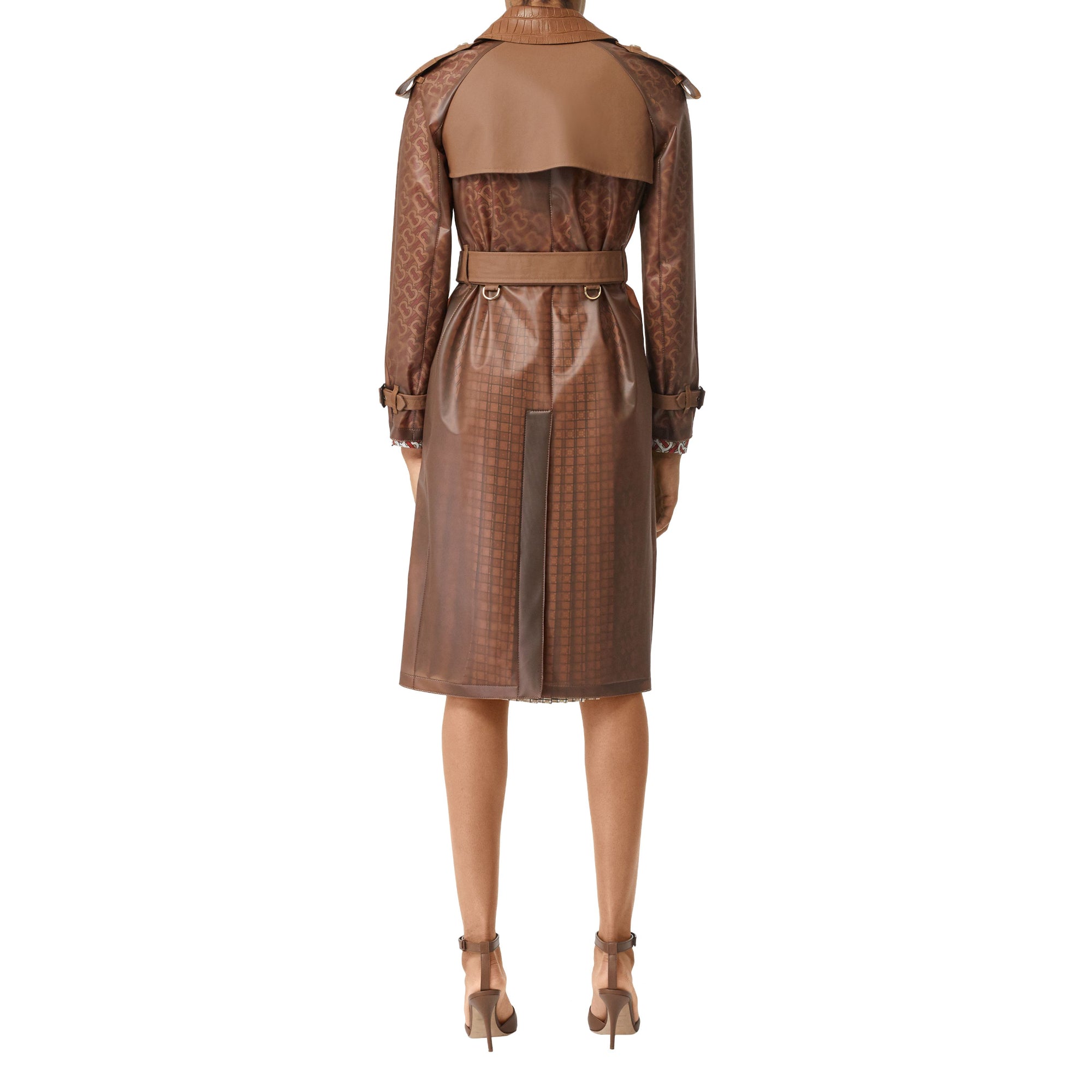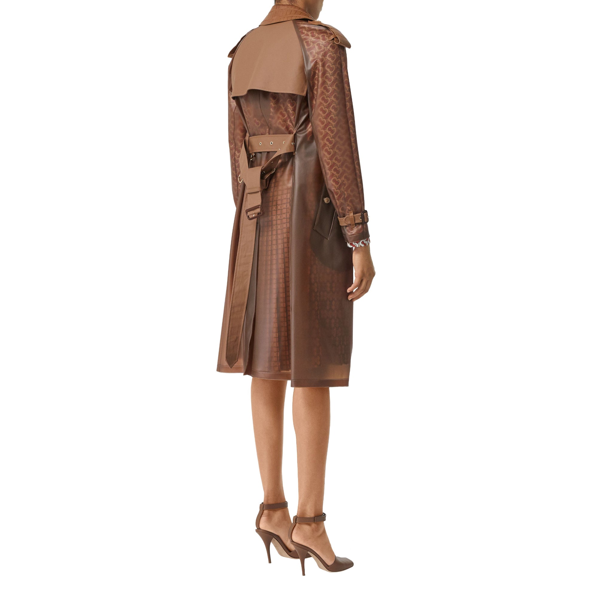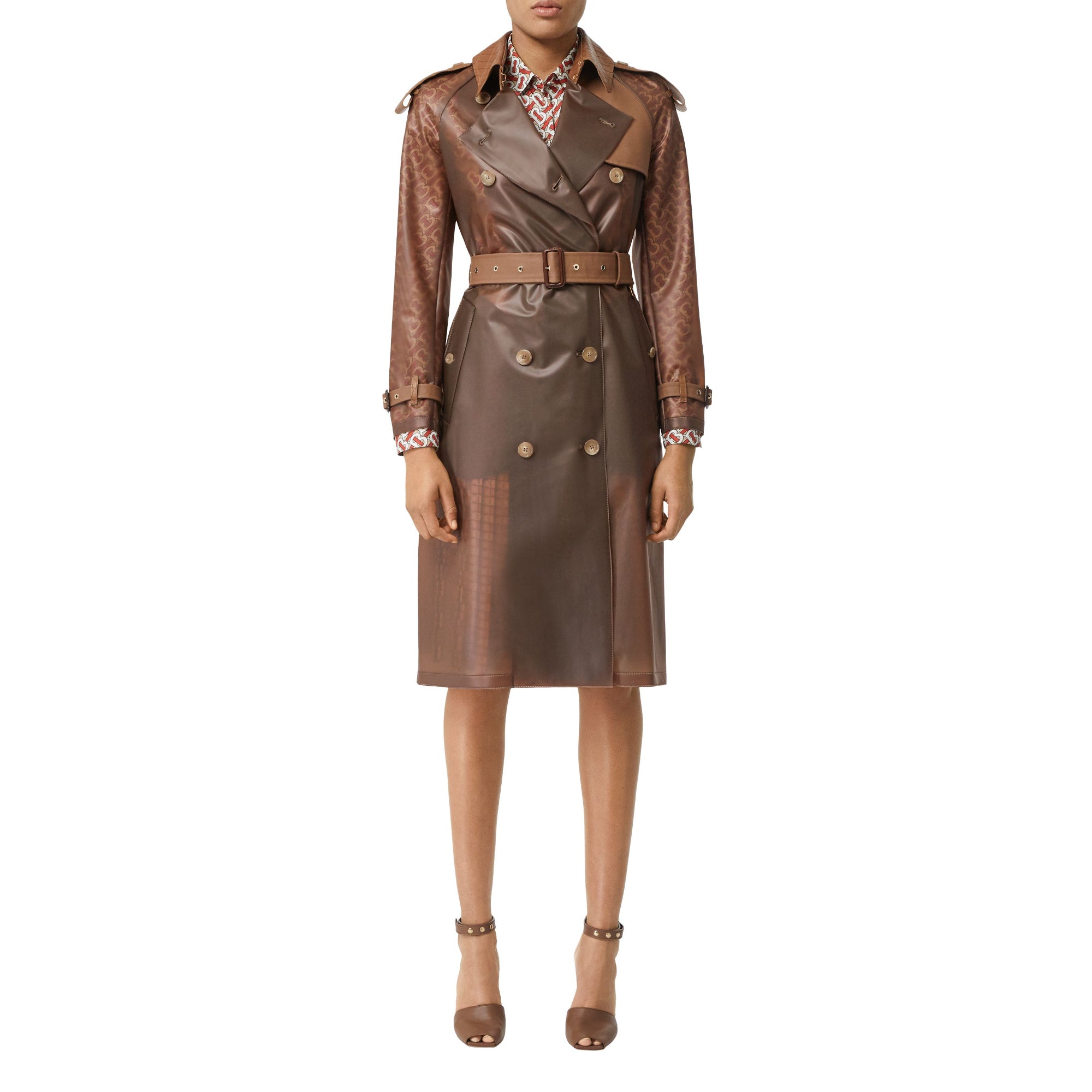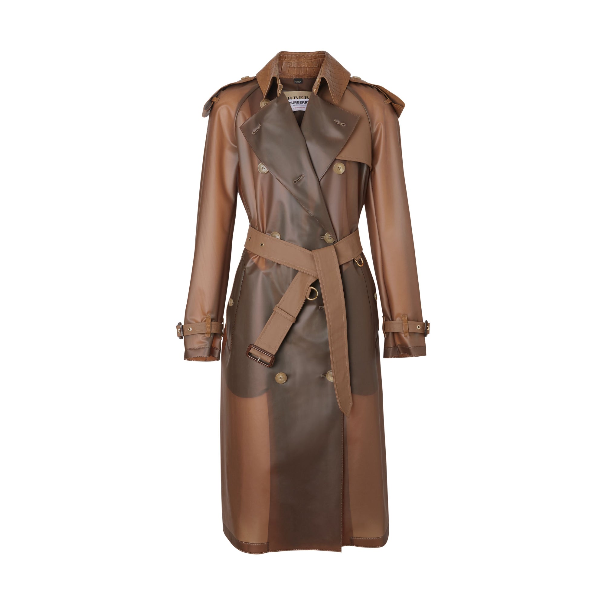 상품설명 : 부드러운 반투명 플라스틱 소재로 재해석된 생활 방수 기능의 트렌치코트. 악어 가죽 효과를 연출하는 엠보싱 가죽 옷깃과 견장이 특징입니다.