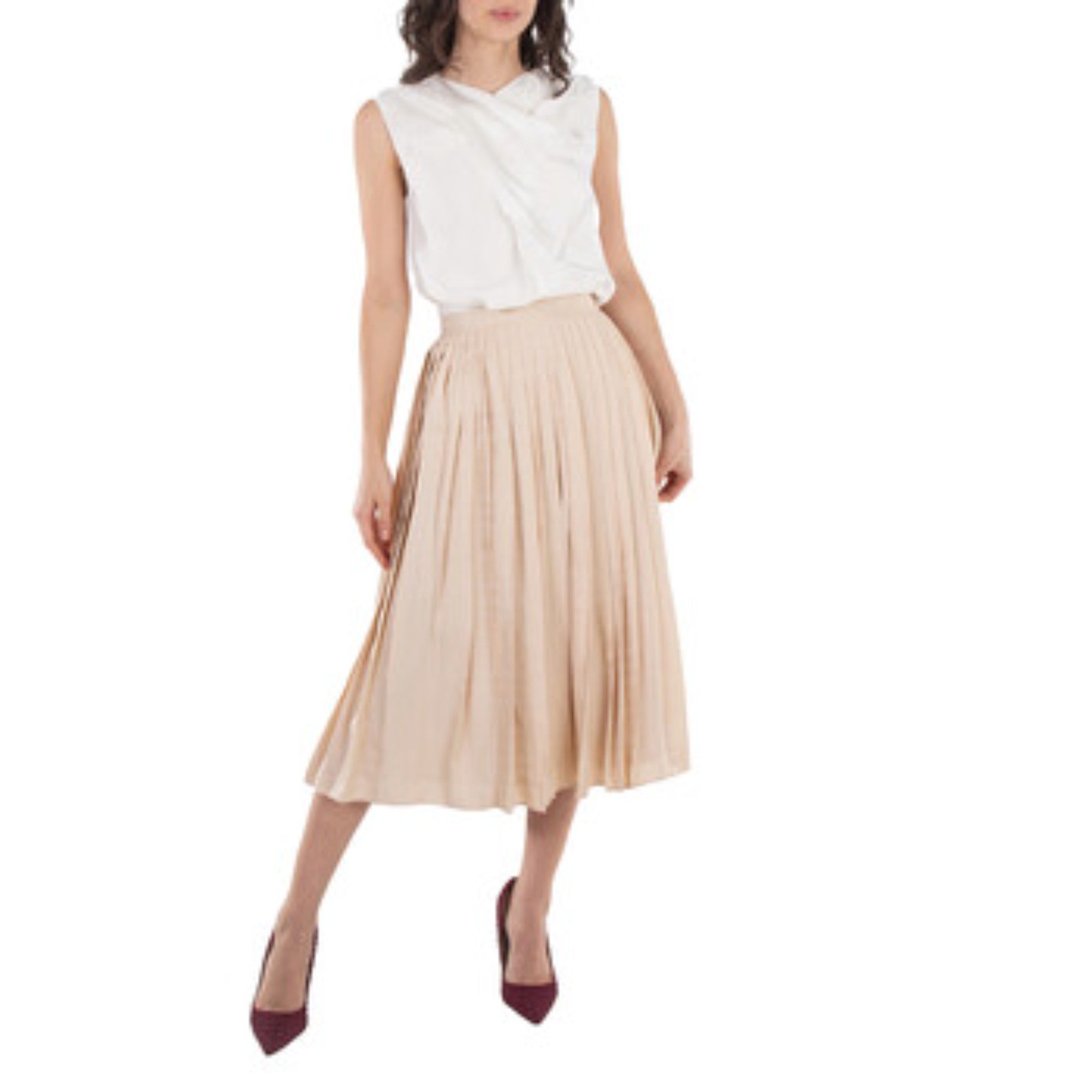 상품설명 : 비스코스 소재의 무릎 길이 플리츠 스커트. 자카드직으로 연출된 은은한 체크 패턴이 특징이며, 부드러운 실크 소재로 안감 처리되었습니다.