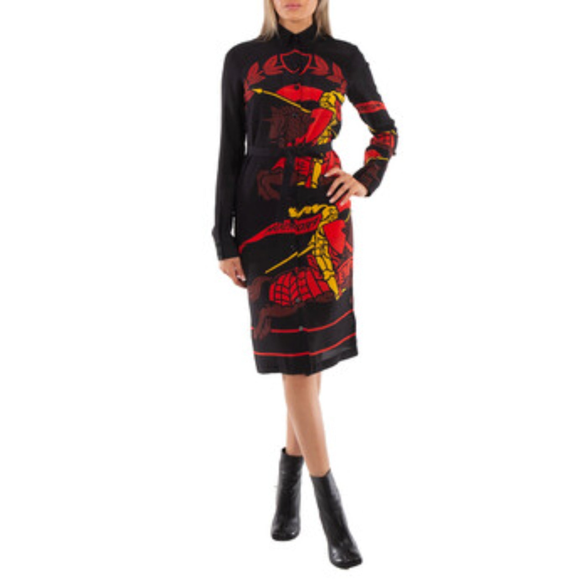 상품설명 : 이탈리아에서 제작된 실크 셔츠 드레스. 버버리 아카이브 엠블럼을 현대적으로 재해석한 기마상 디자인과 참나무 잎사귀 크레스트 프린트가 돋보입니다.​