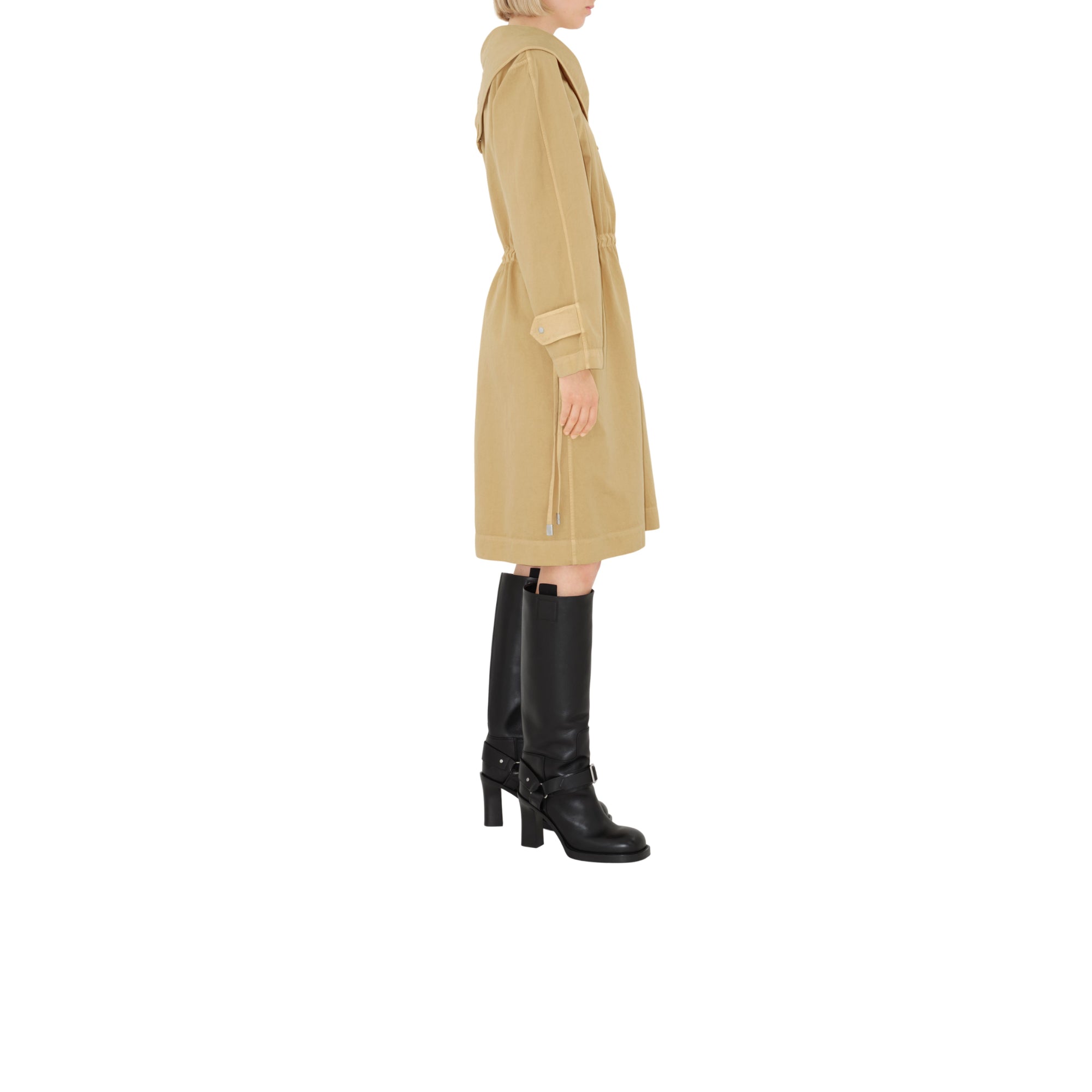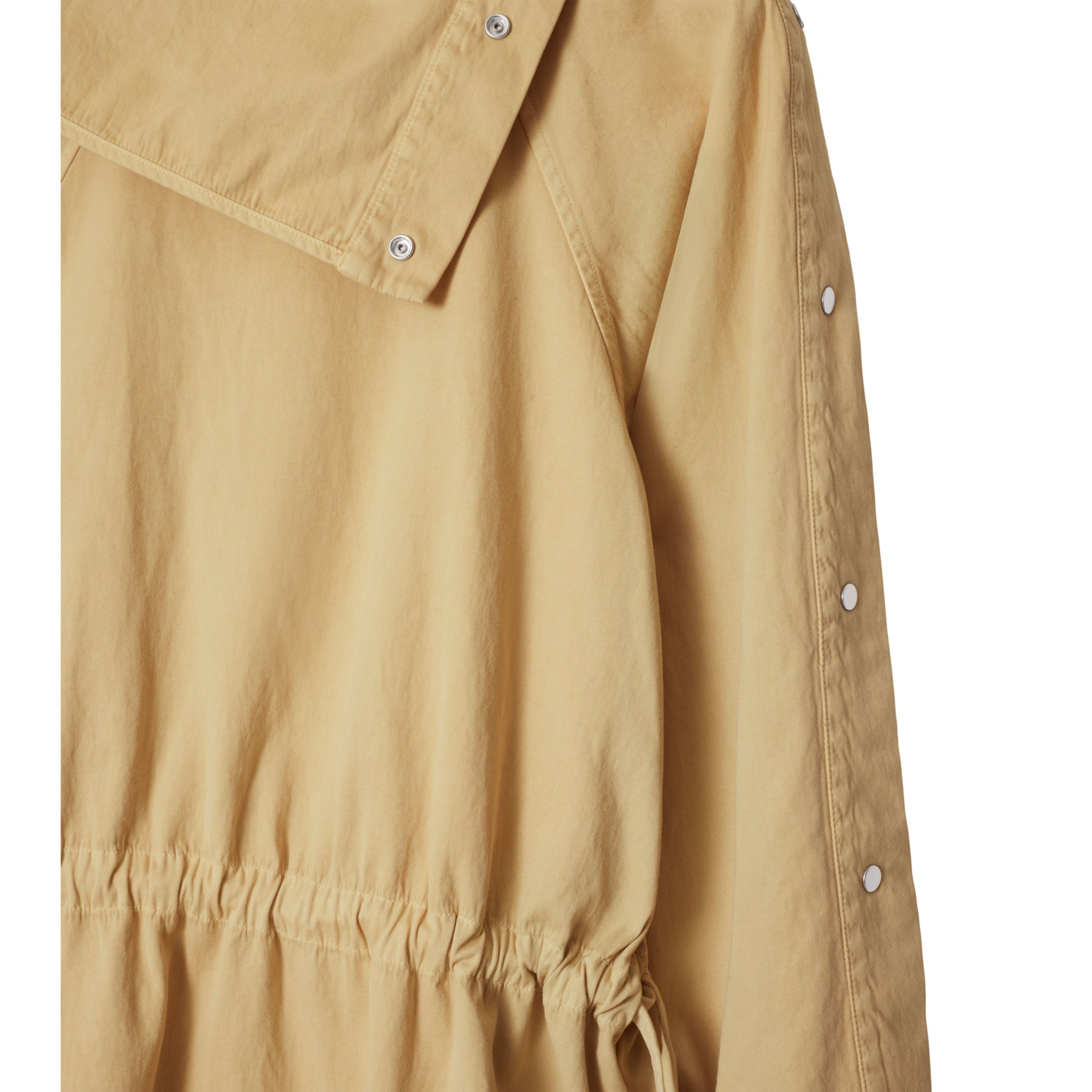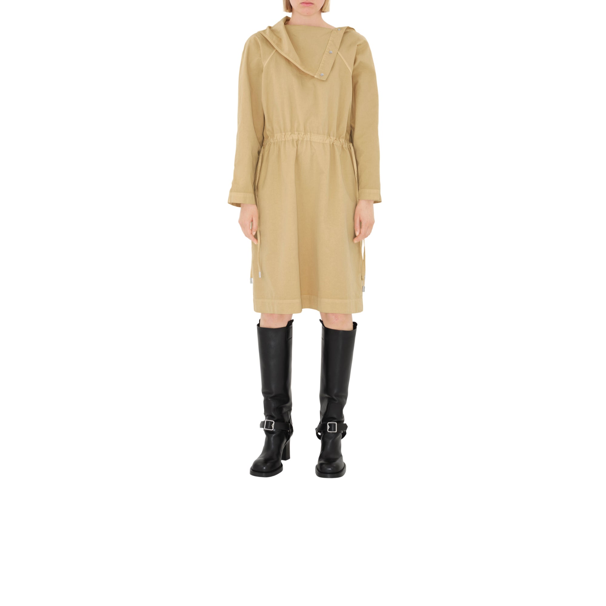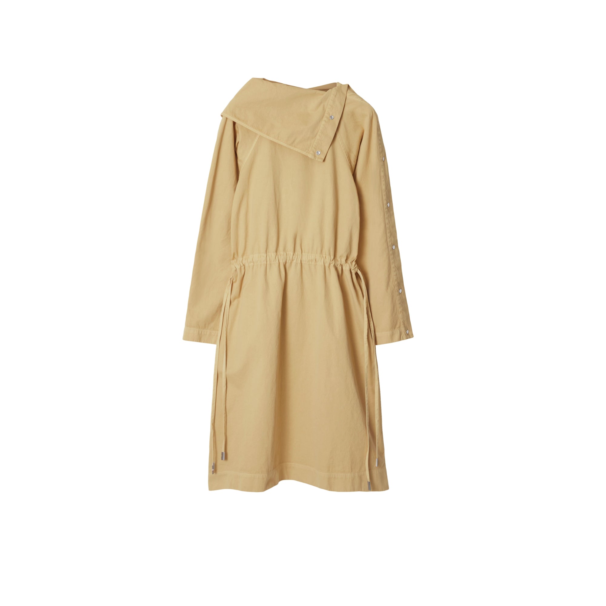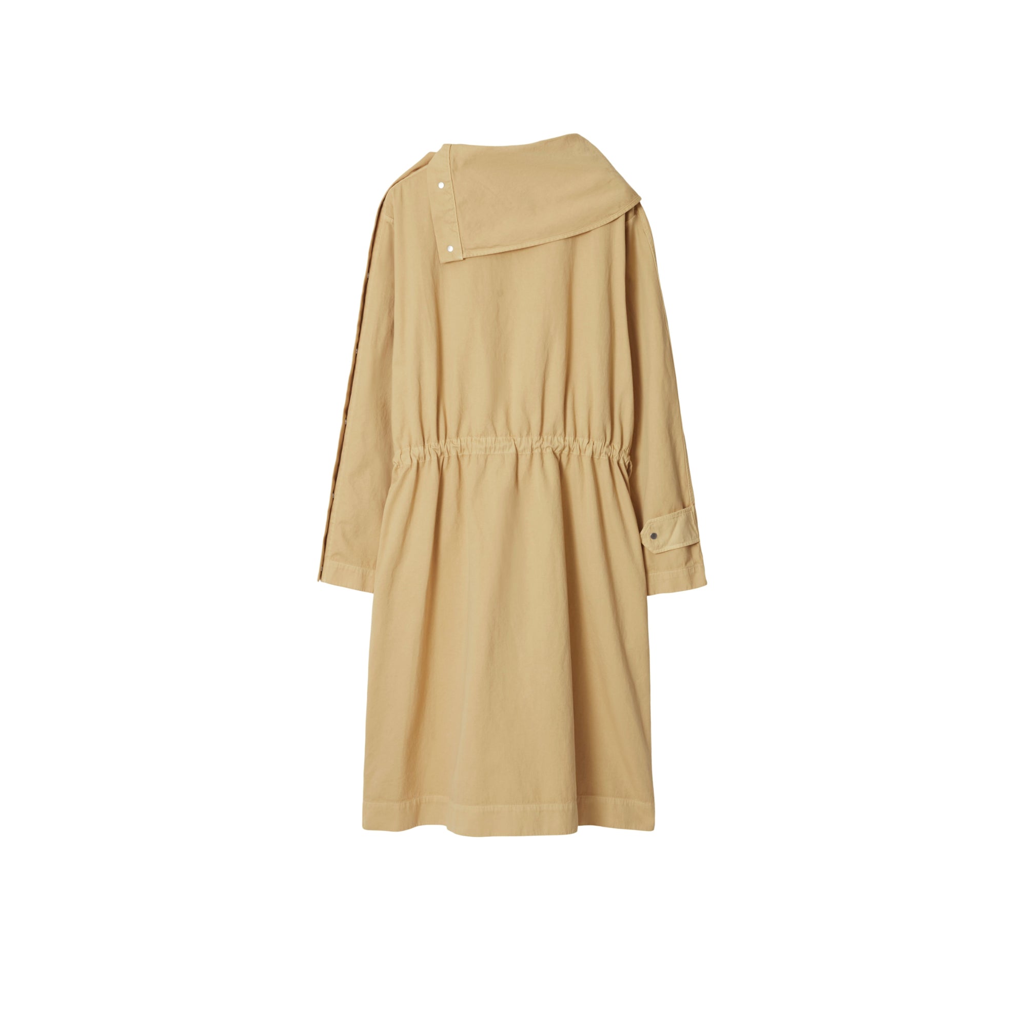 상품설명 : 가먼트다잉 처리된 이탈리안 면 혼방 소재의 오버사이즈핏 긴소매 드레스. 목선과 소매의 스냅 단추를 사용해 실루엣 조절 가능.##스냅 단추 여밈#허리의 드로스트링#측면의 슬립 포켓#한쪽 소매단의 스냅 단추 탭