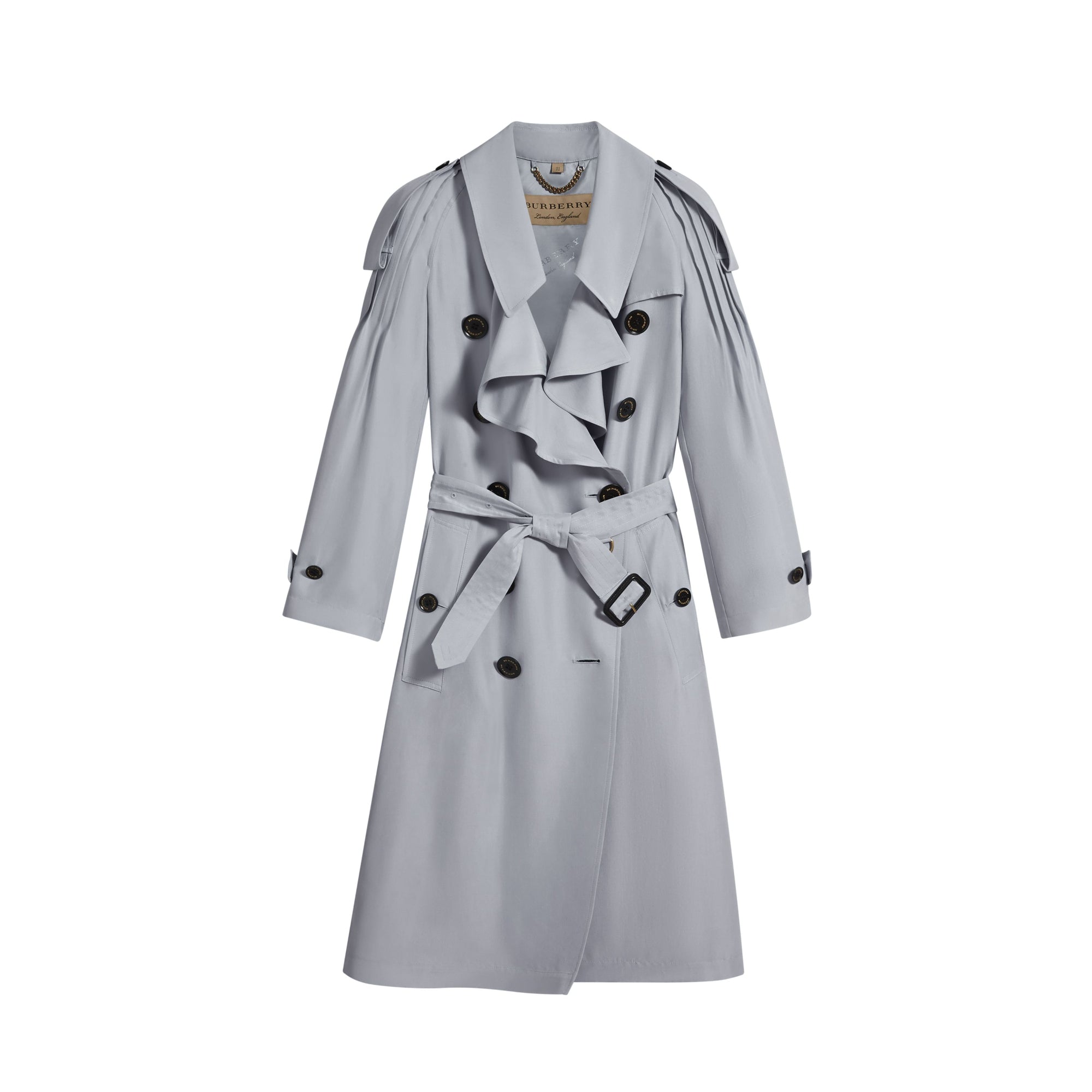 상품설명 : 이탈리아에서 직조된 실크 소재의 오버사이즈 트렌치코트. 부드러운 러플 여밈과 어깨의 핀턱 디테일이 돋보입니다. 맑은 날 허리의 벨트를 묶어 풍성한 실루엣을 강조하세요.