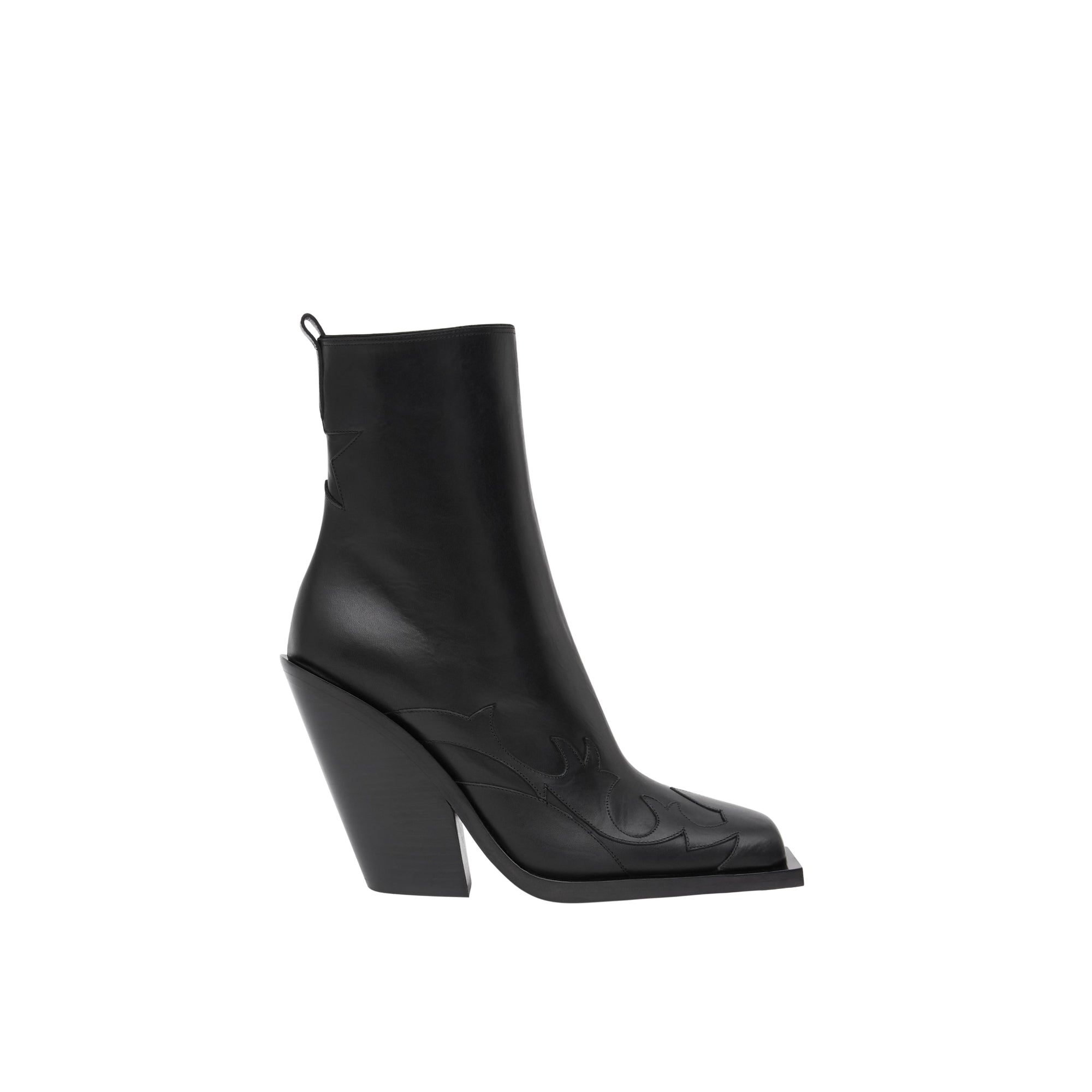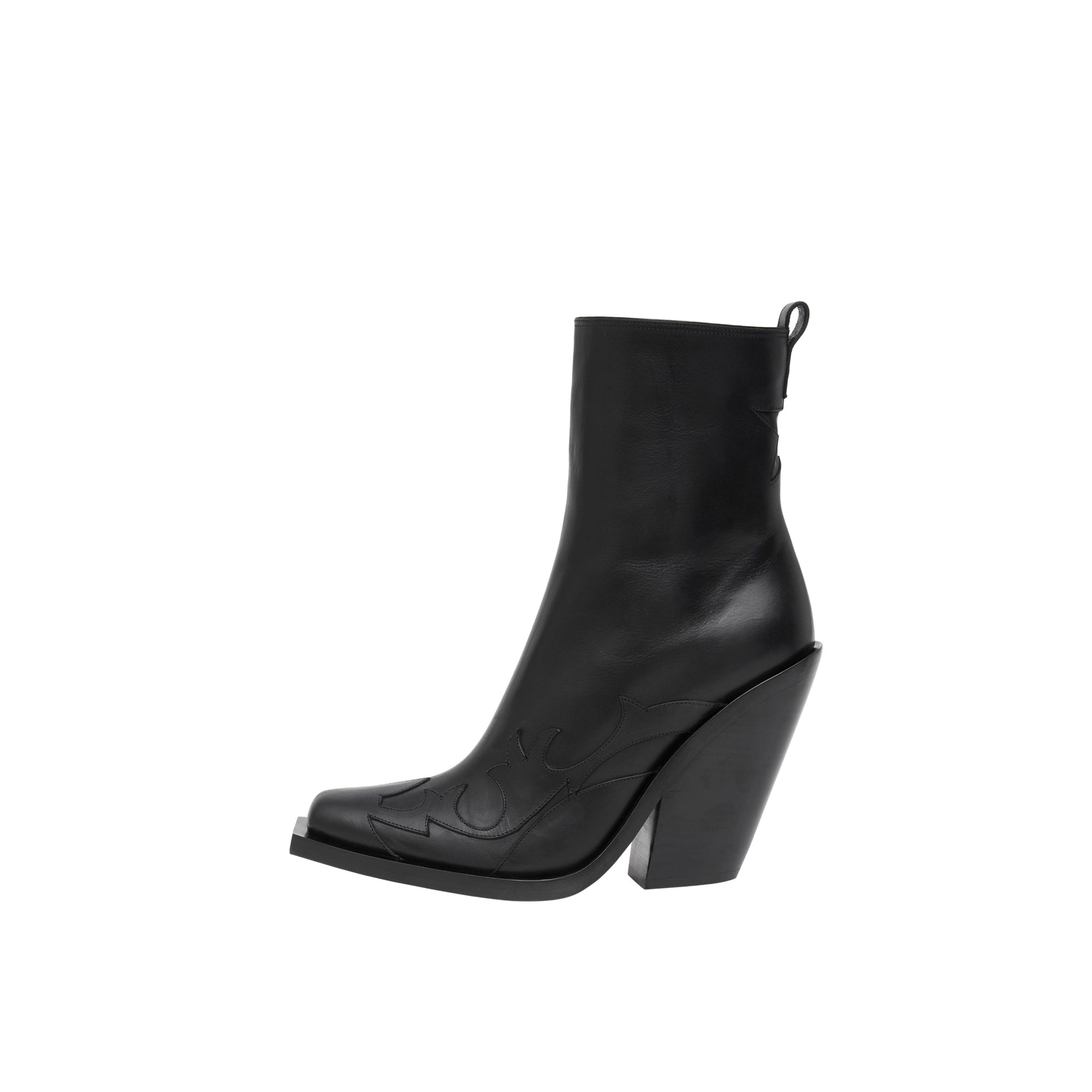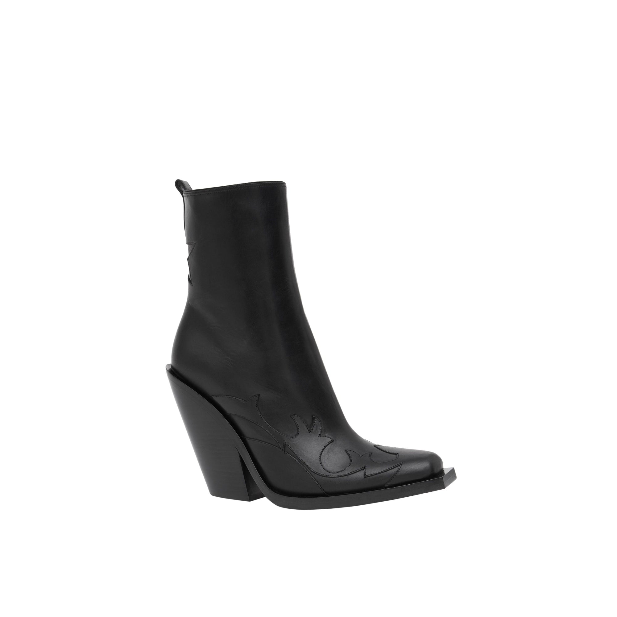 상품설명 : 이탈리아에서 태닝 처리된 가죽 소재의 스퀘어 토 앵클 부츠. 경사진 형태의 블록 힐 디자인이 특징이며, 그래픽한 디자인의 가죽 아플리케와 뒤쪽의 컷아웃 스타 모티프가 돋보입니다.