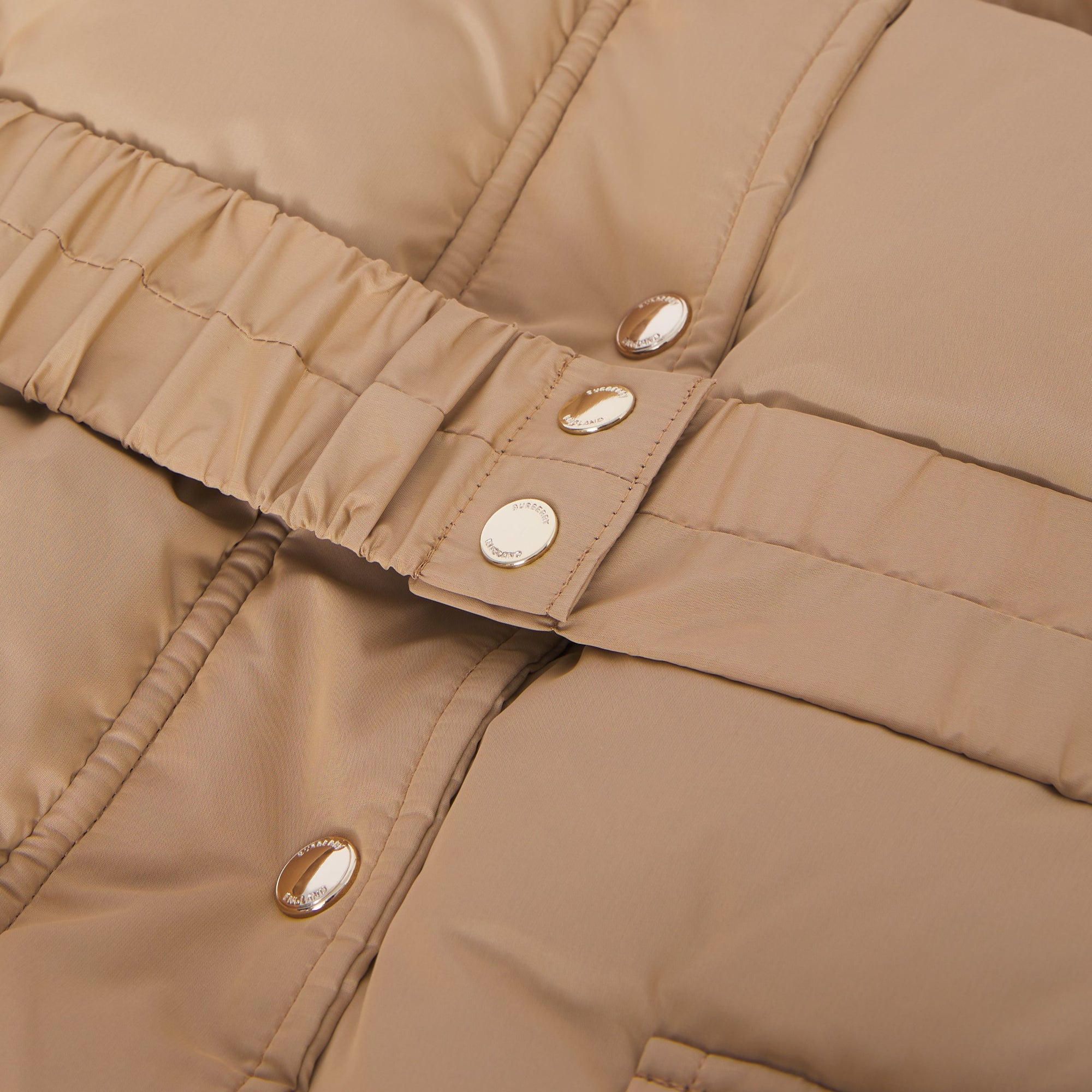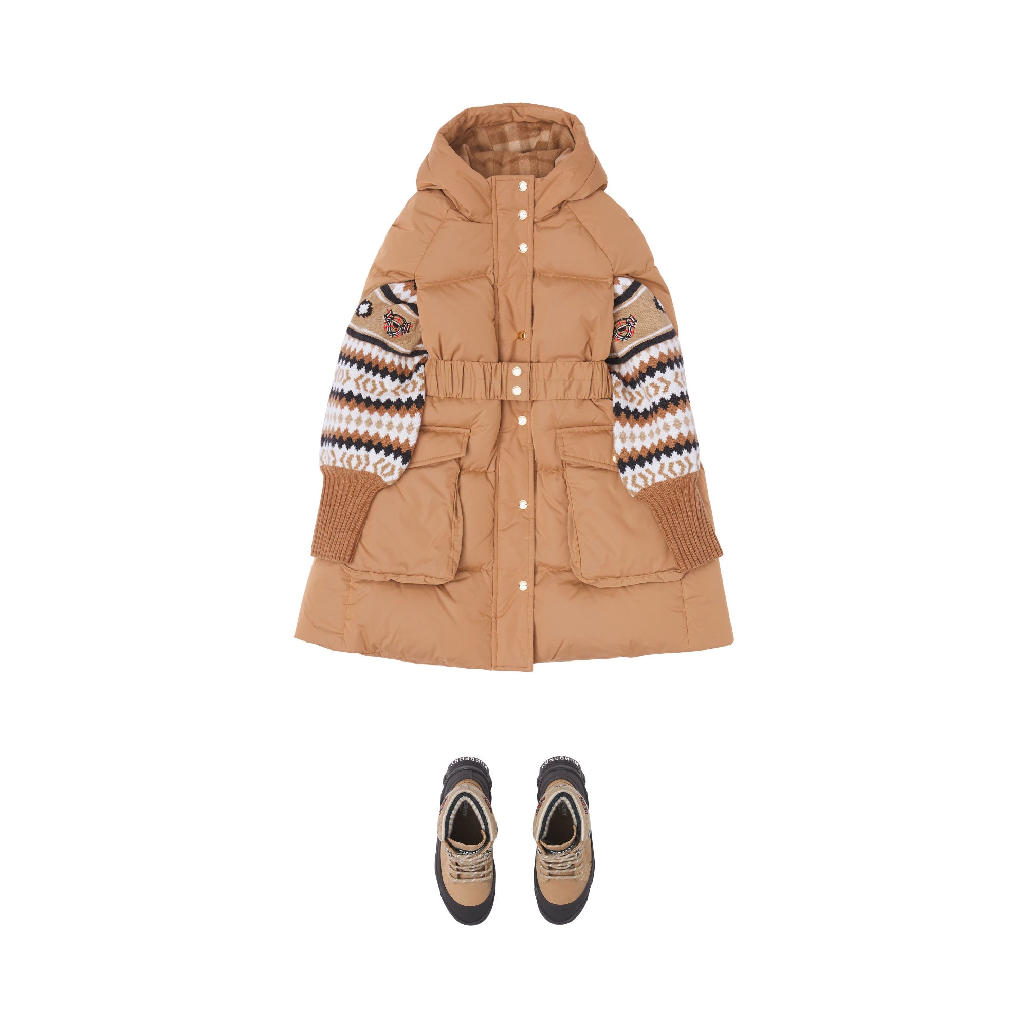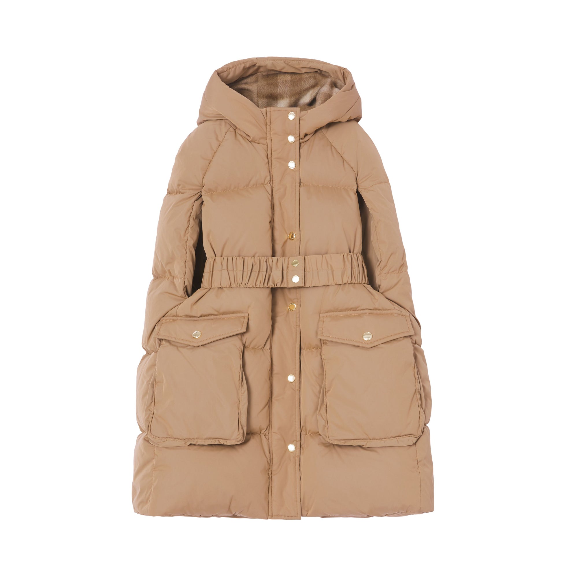 상품설명 : 나일론 소재의 포근한 후드 퍼퍼 케이프. 벨트와 플랩 포켓, 체크 안감 후드가 특징입니다.