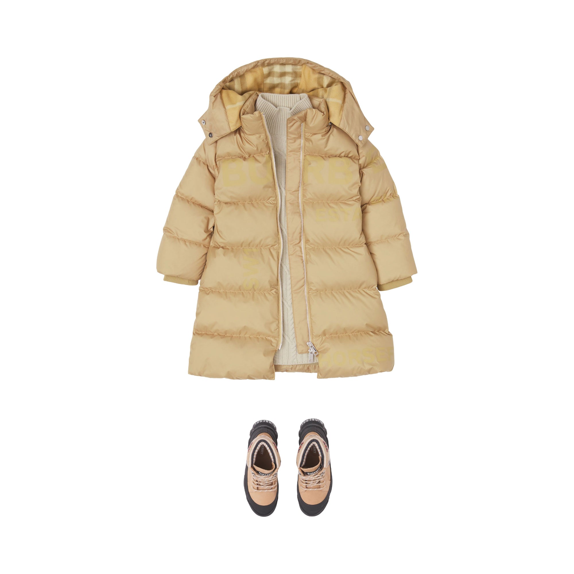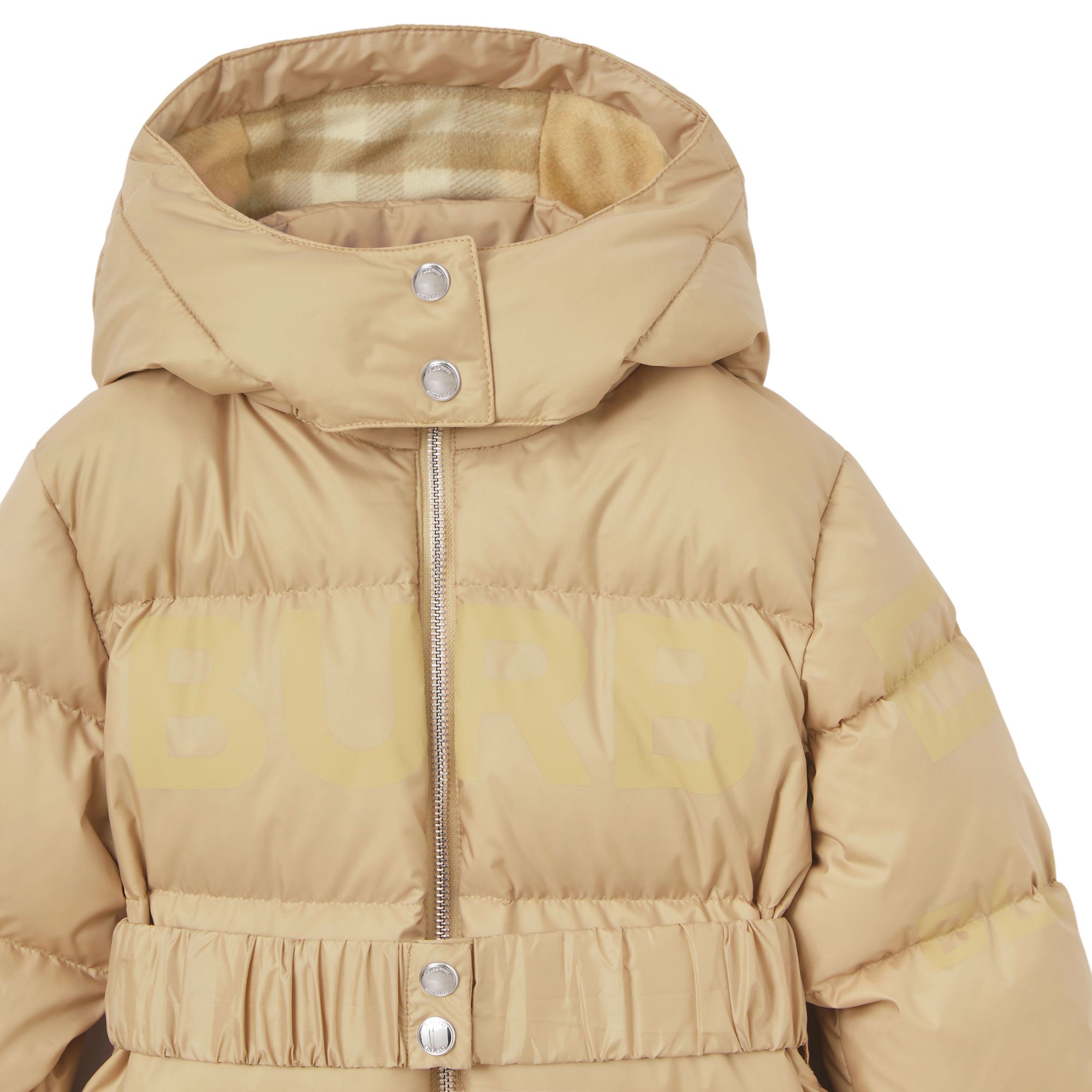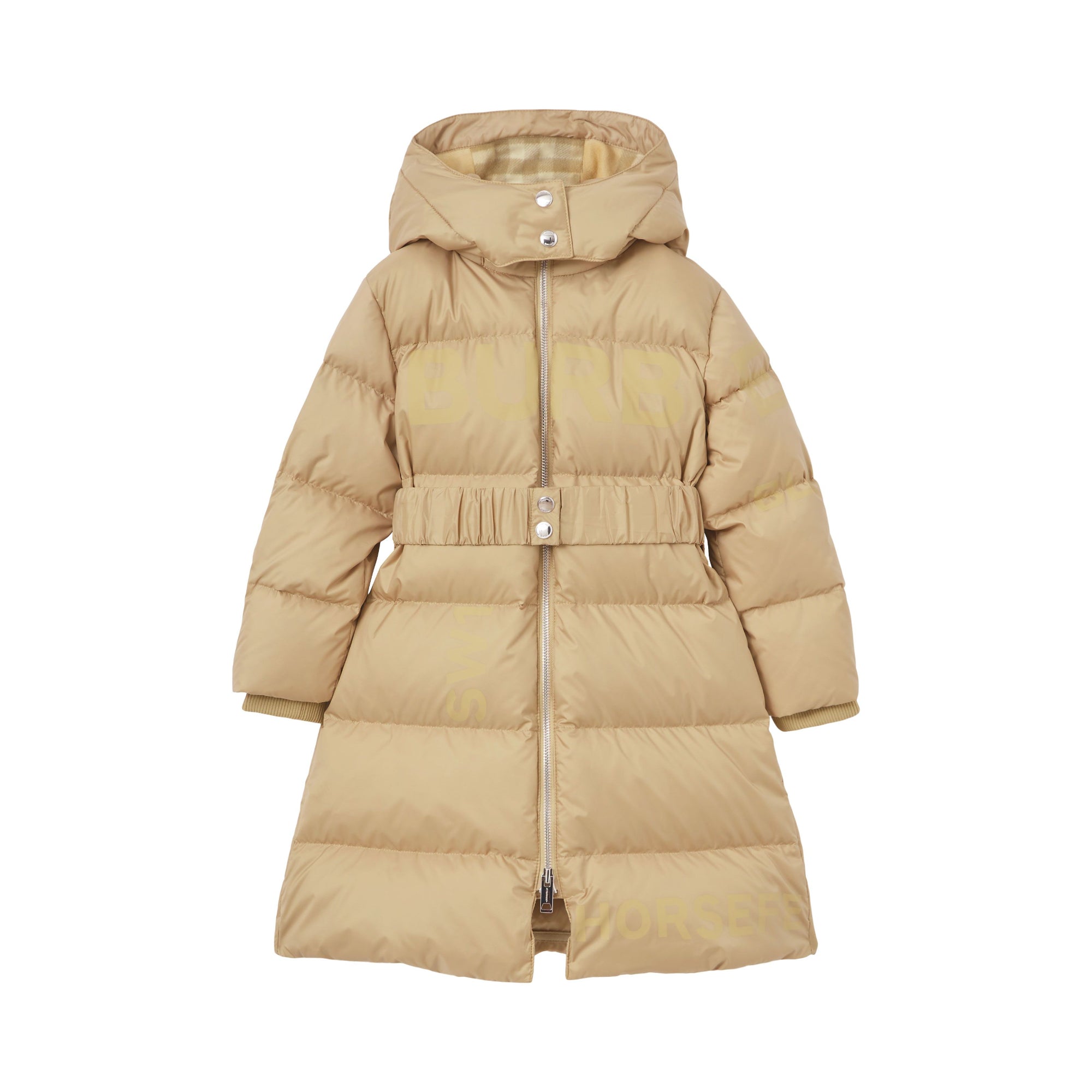 상품설명 : 발수 기능의 폴리에스테르 소재로 직조된 포근한 퍼퍼 코트. 벨트가 있는 디자인으로, 탈착 가능한 체크 안감 후드와 버버리 호스페리 프린트가 돋보입니다.