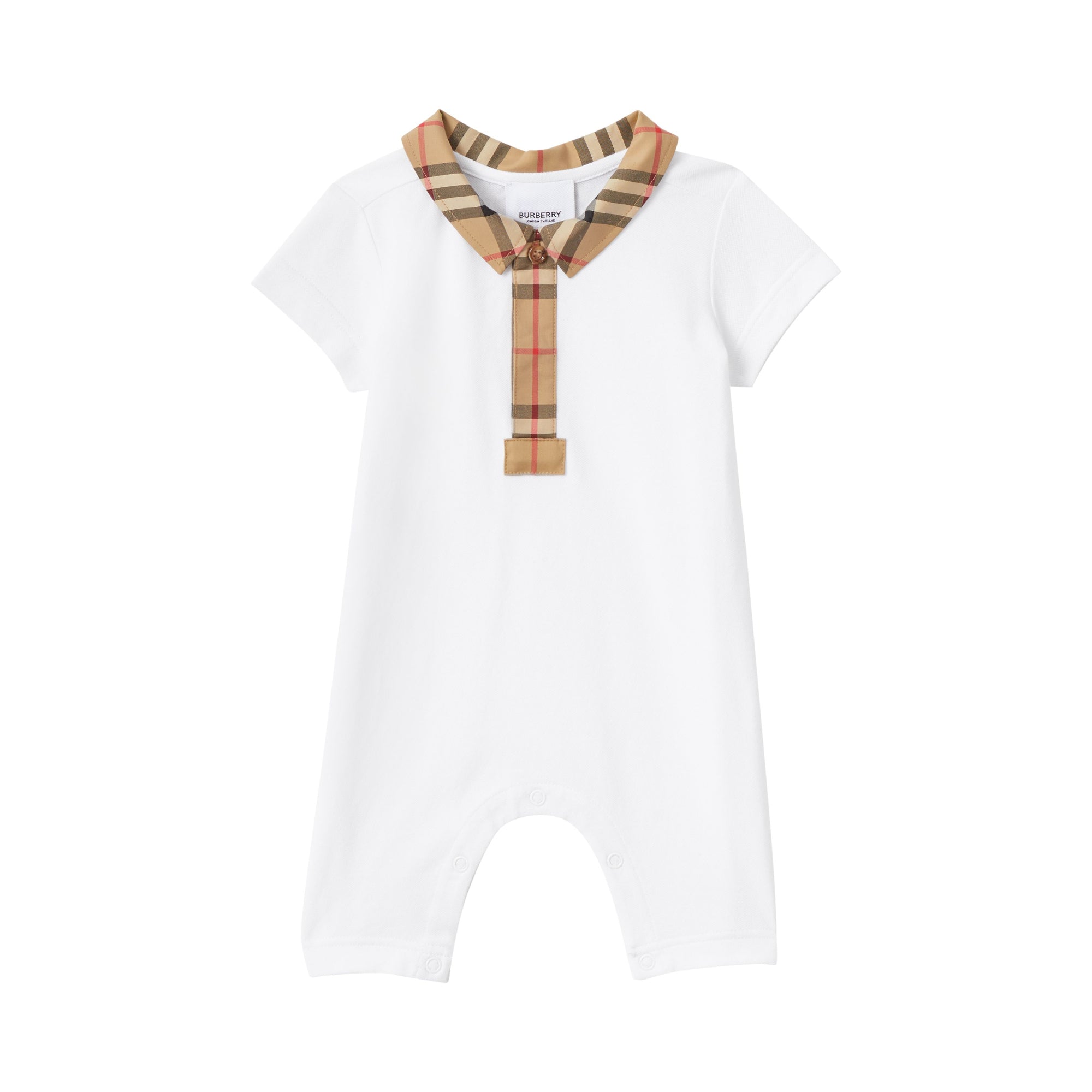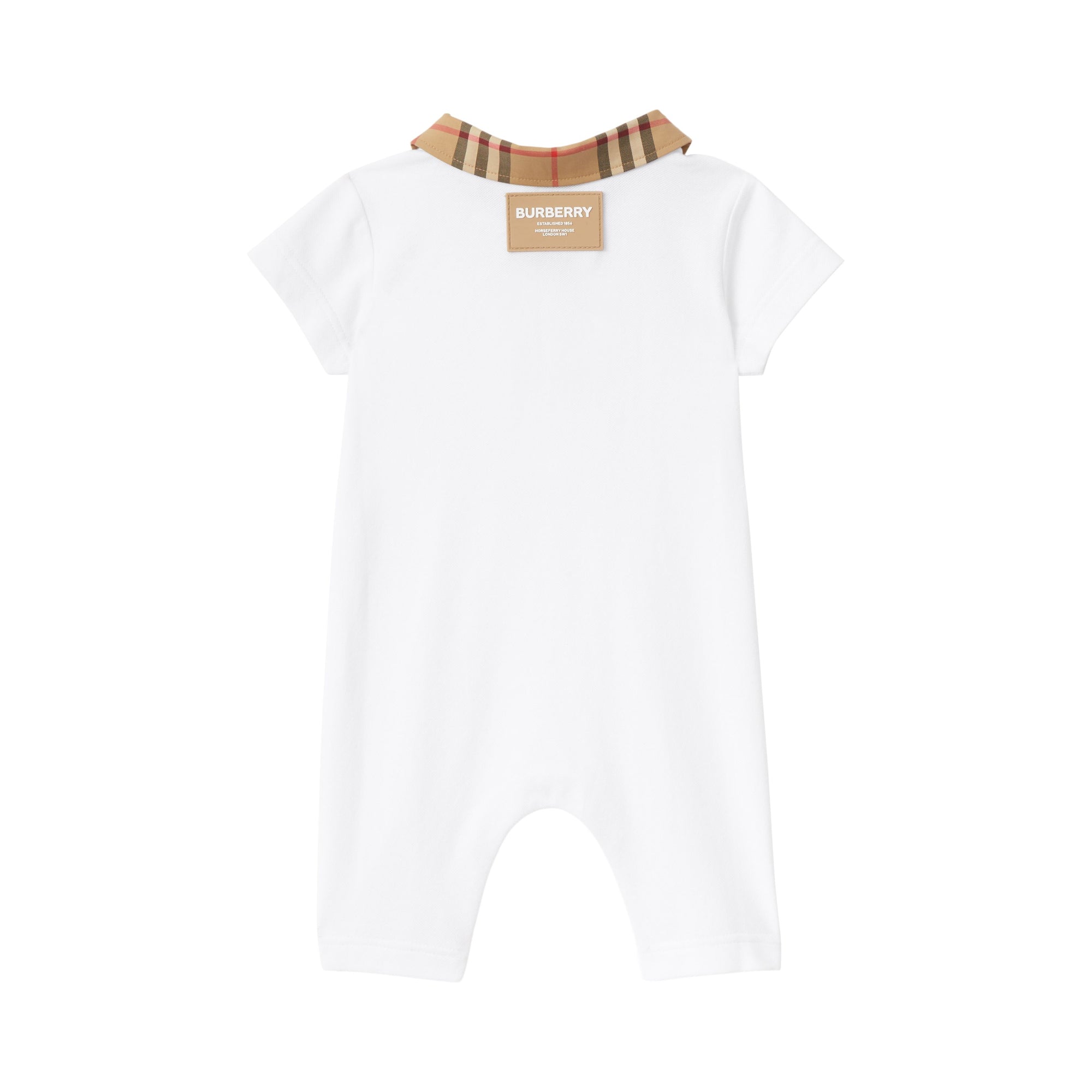 상품설명 : 면 피케 소재의 플레이수트. 체크 패턴이 연출된 트리밍 및 버버리 호스페리 모티프 아플리케가 돋보입니다.