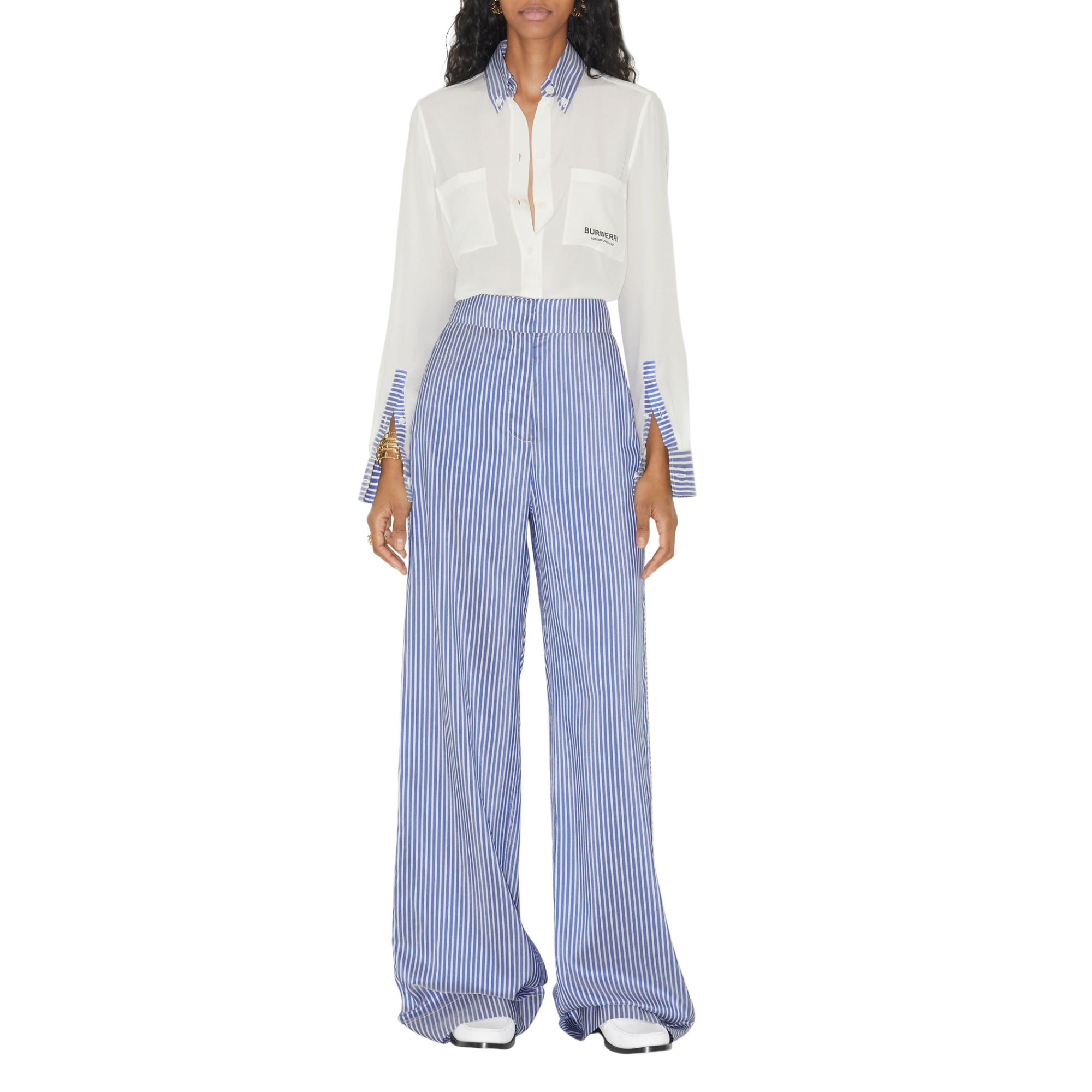 혼용률 : 레귤러핏. 정사이즈로 출시된 제품으로, 평소와 같은 사이즈를 선택할 것을 권장합니다.#셔츠 길이: 77cm. 본 치수는 영국 사이즈 6 기준입니다.#실크 100%#트리밍: 실크 100%#싱글 버튼 커프스#버튼 다운 칼라#가슴의 패치 포켓#곡선형 밑단#포켓의 버버리 레터링 프린트#전문 드라이클리닝#수입품
