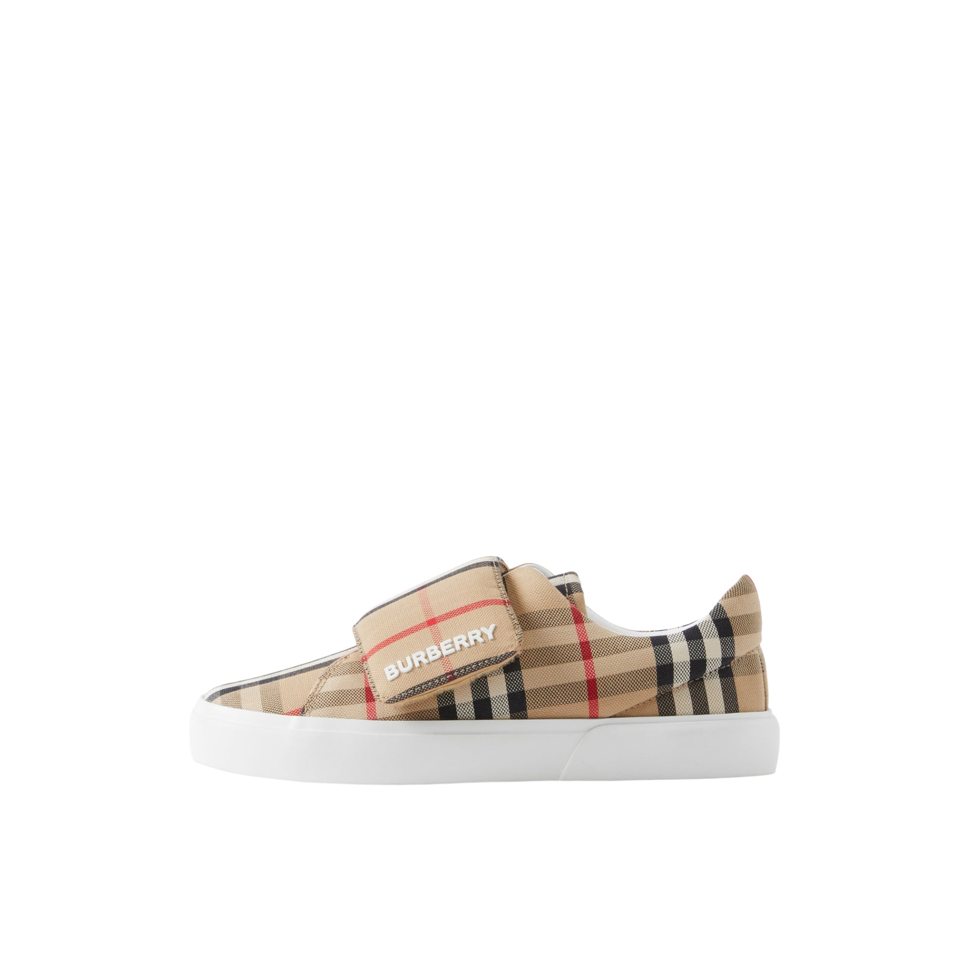 혼용률 : 겉감: 면 100%*#안감: 면 70%, 폴리아미드 15%, 폴리에틸렌 15%#밑창: 고무 100%#벨크로 스트랩 여밈#스트랩의 버버리 양각 레터링#수입품##*오가닉 면 포함.