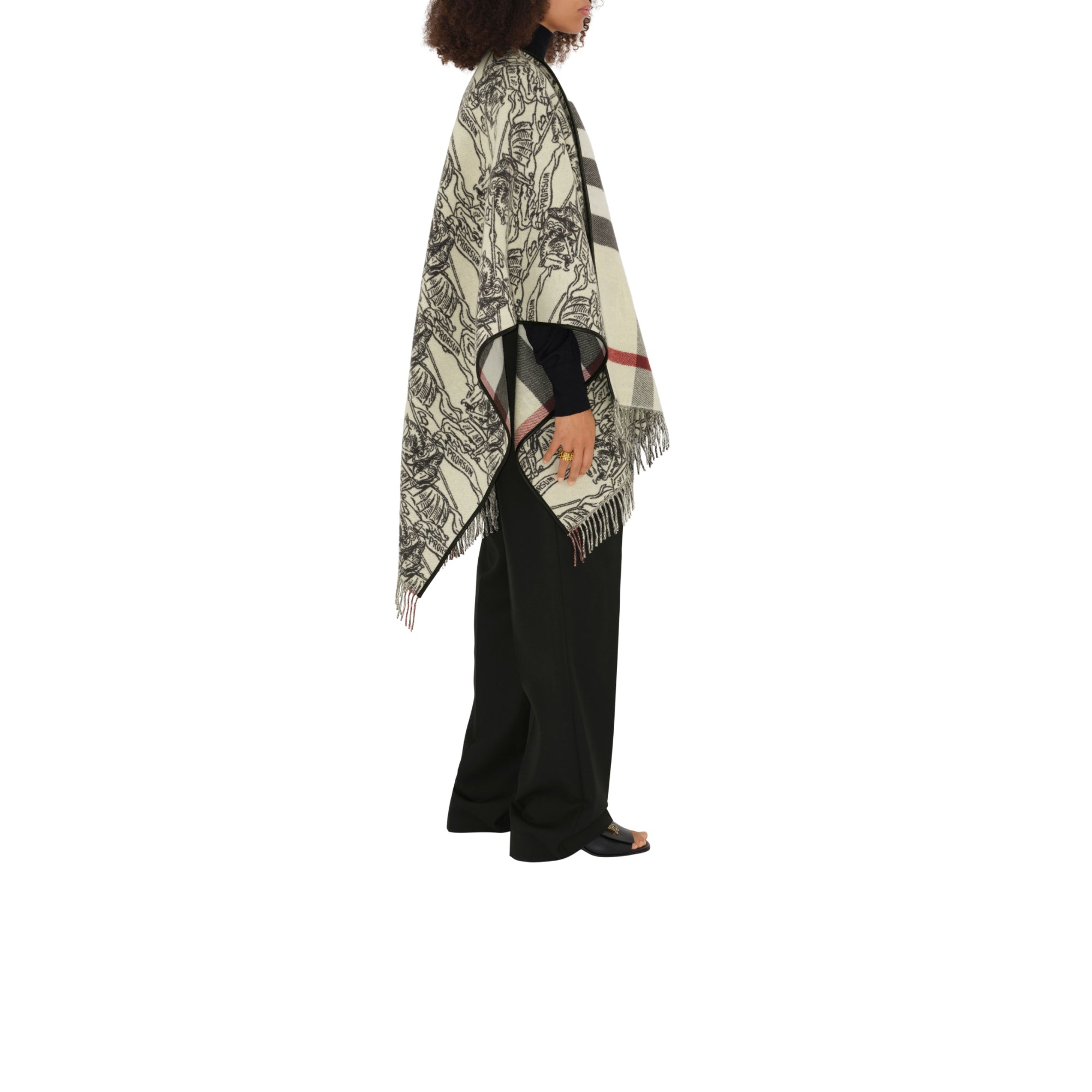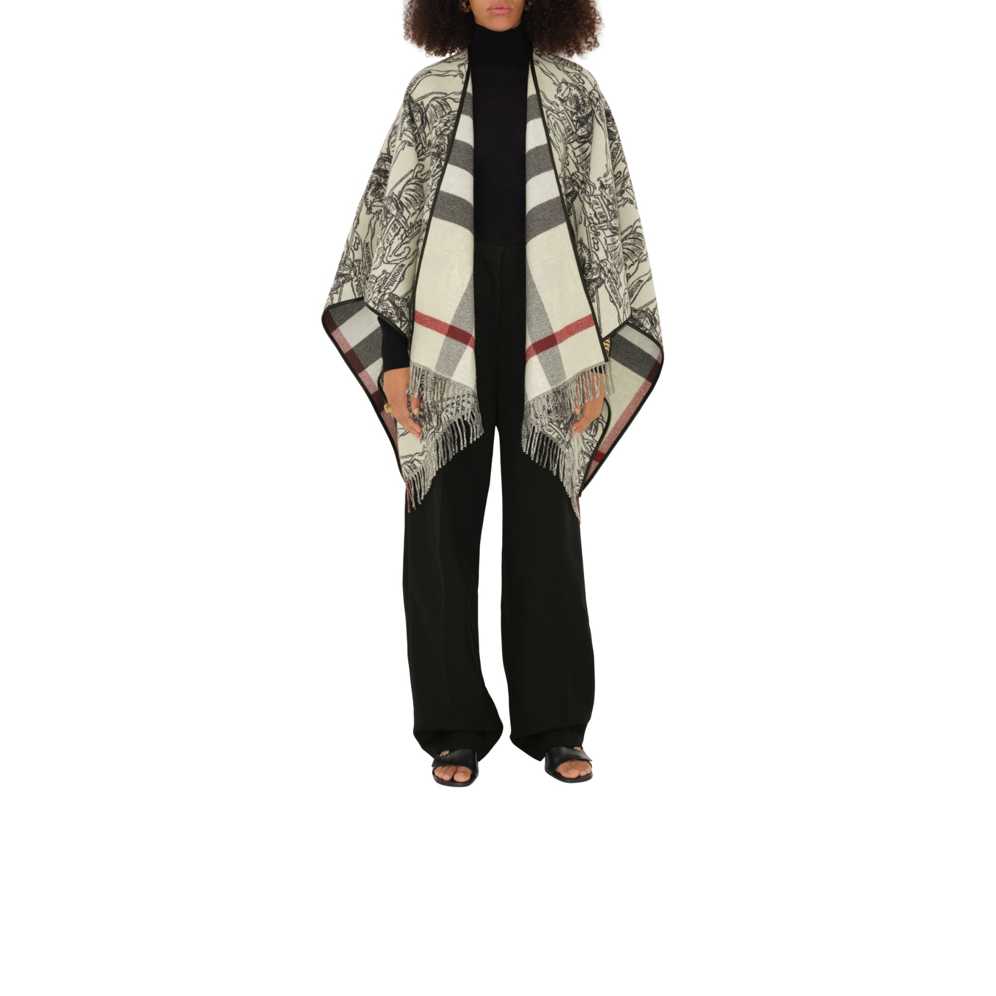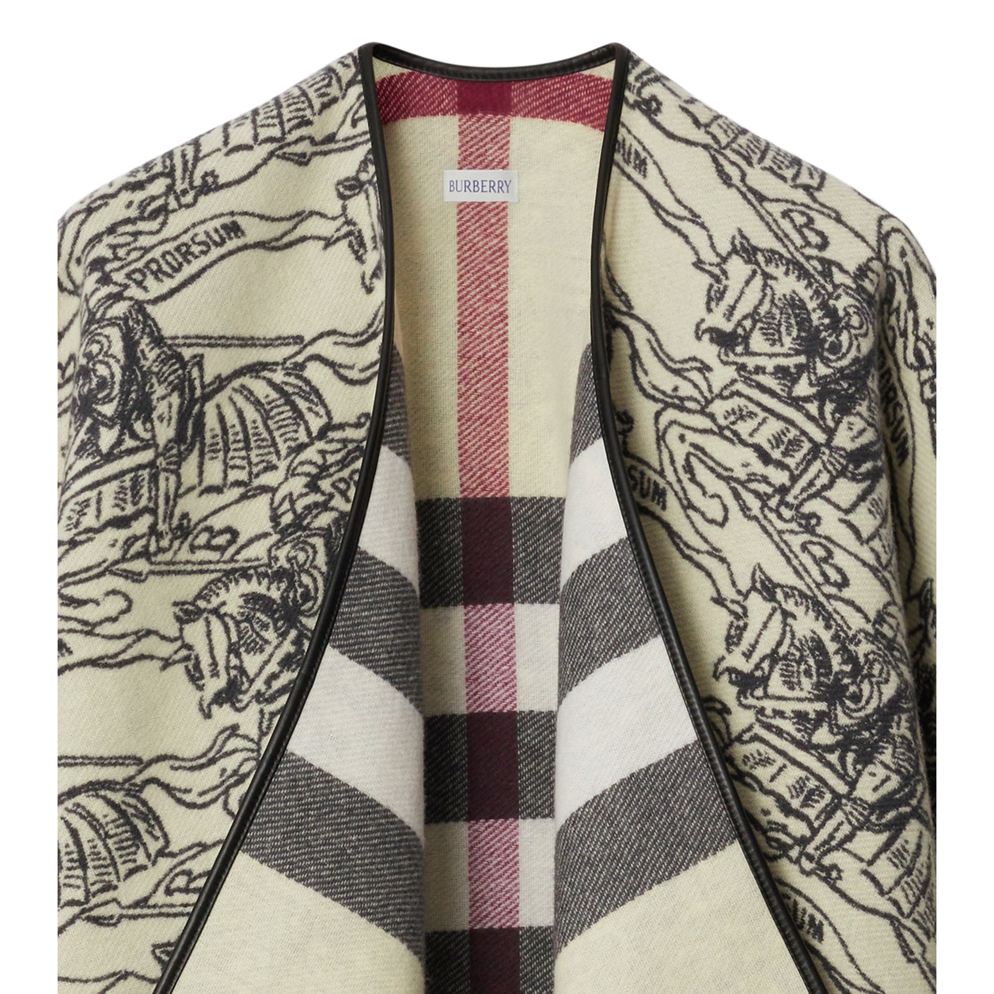 상품설명 : 자카드직 울 소재로 이탈리아에서 제작된 케이프. 기마상 디자인(Equestrian Knight Design, EKD)이 돋보이는 한쪽 면과 버버리 체크의 반대면으로 구성된 양면 아이템. 부드러운 가죽 소재의 트리밍 디테일이 특징.##양 가장자리의 프린지 디테일