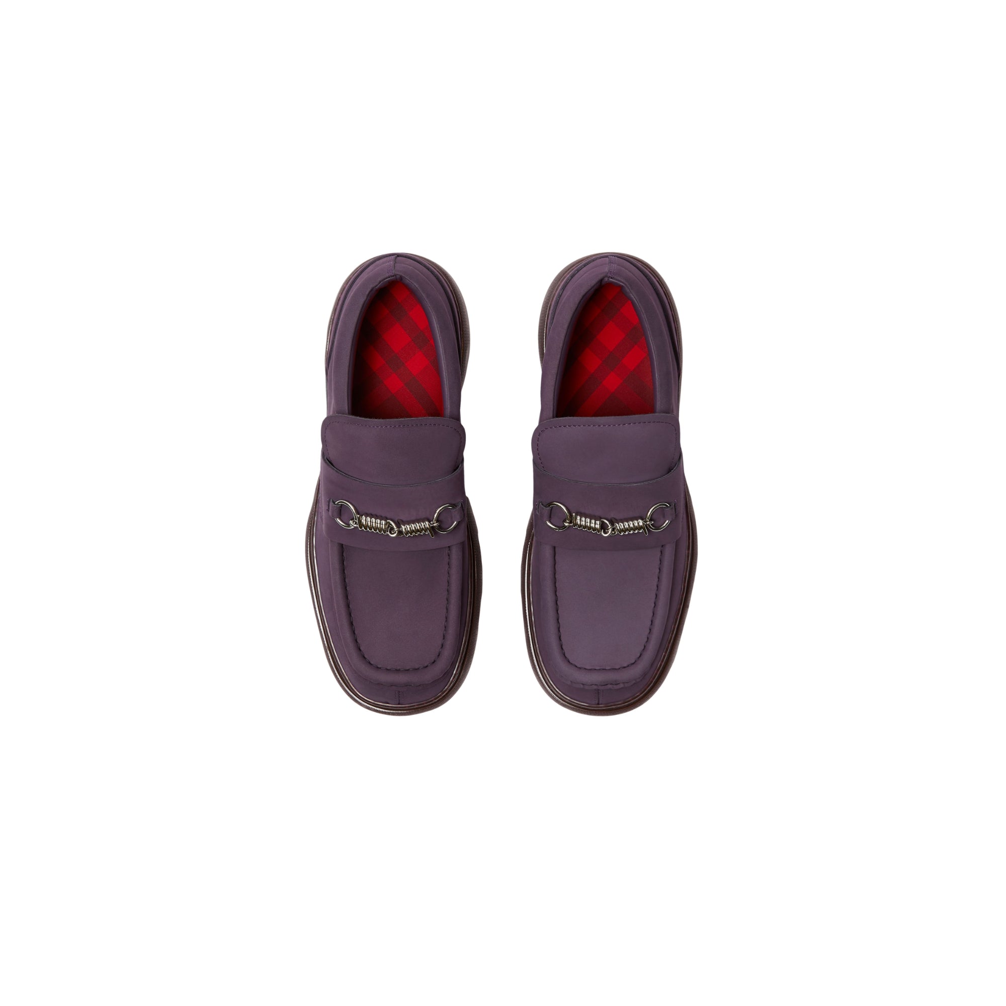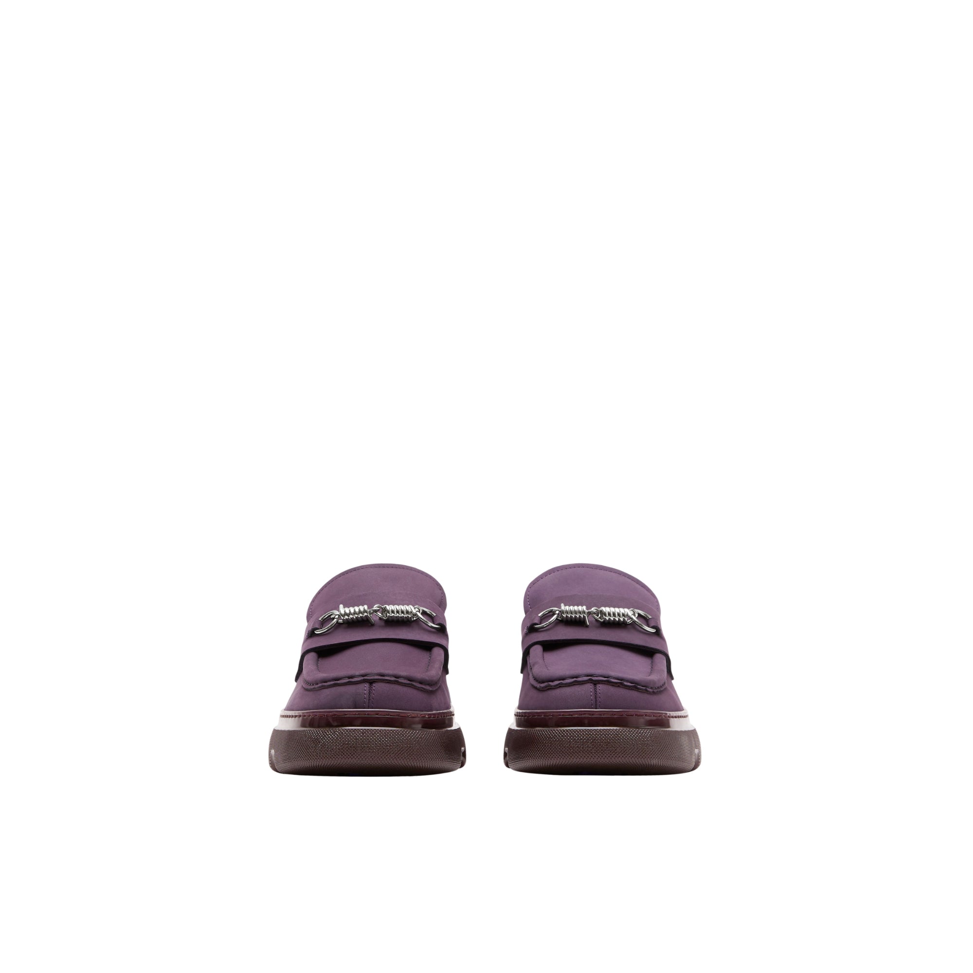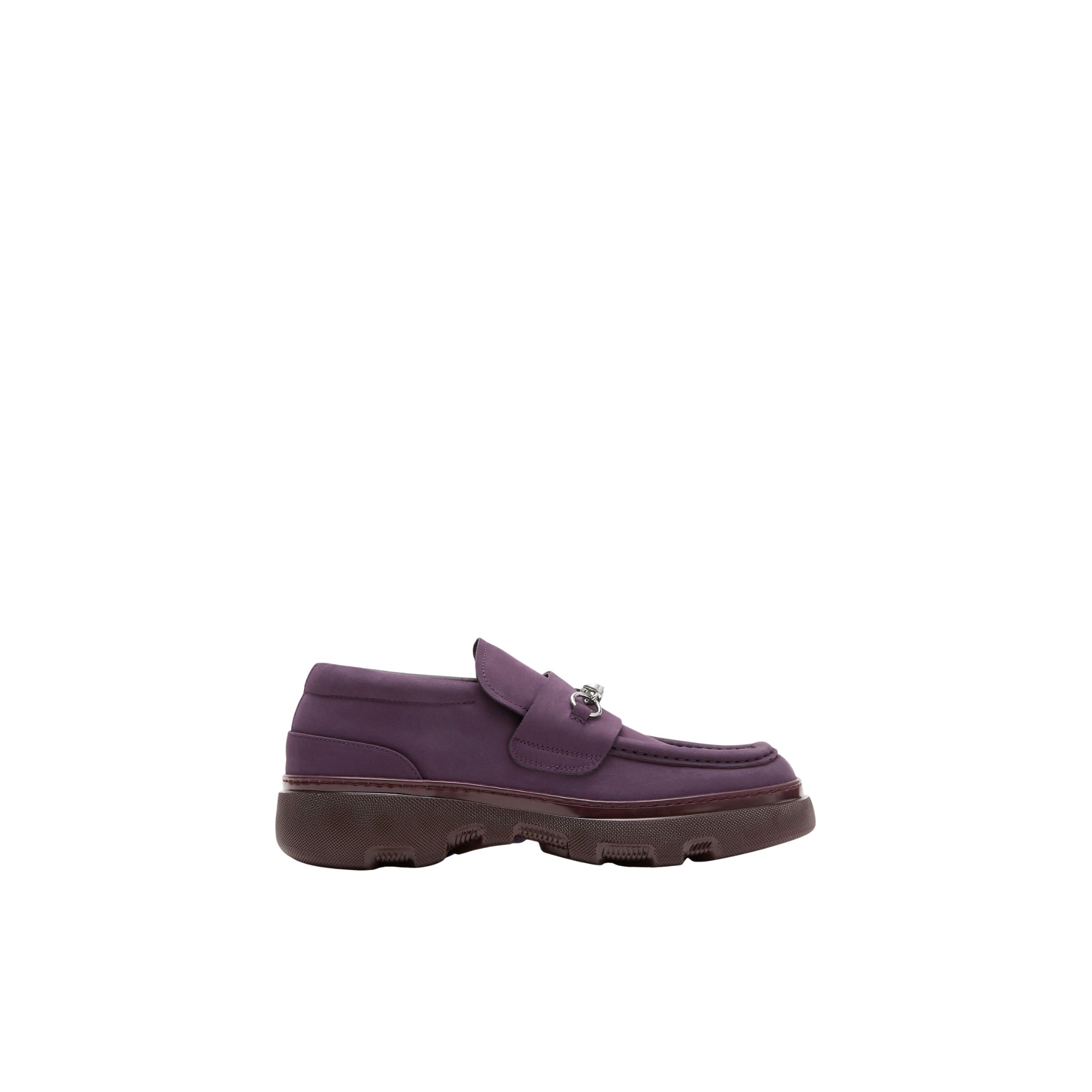 상품설명 : 누벅 소재로 이탈리아에서 제작된 로퍼. 독특한 와이어 하드웨어 디테일이 돋보이며 가죽 밑창에 엠보싱으로 연출된 기마상 디자인(Equestrian Knight Design, EKD)이 특징.​##둥근 앞코#바브드 와이어 하드웨어#체크 안창#밑창의 버버리 레터링