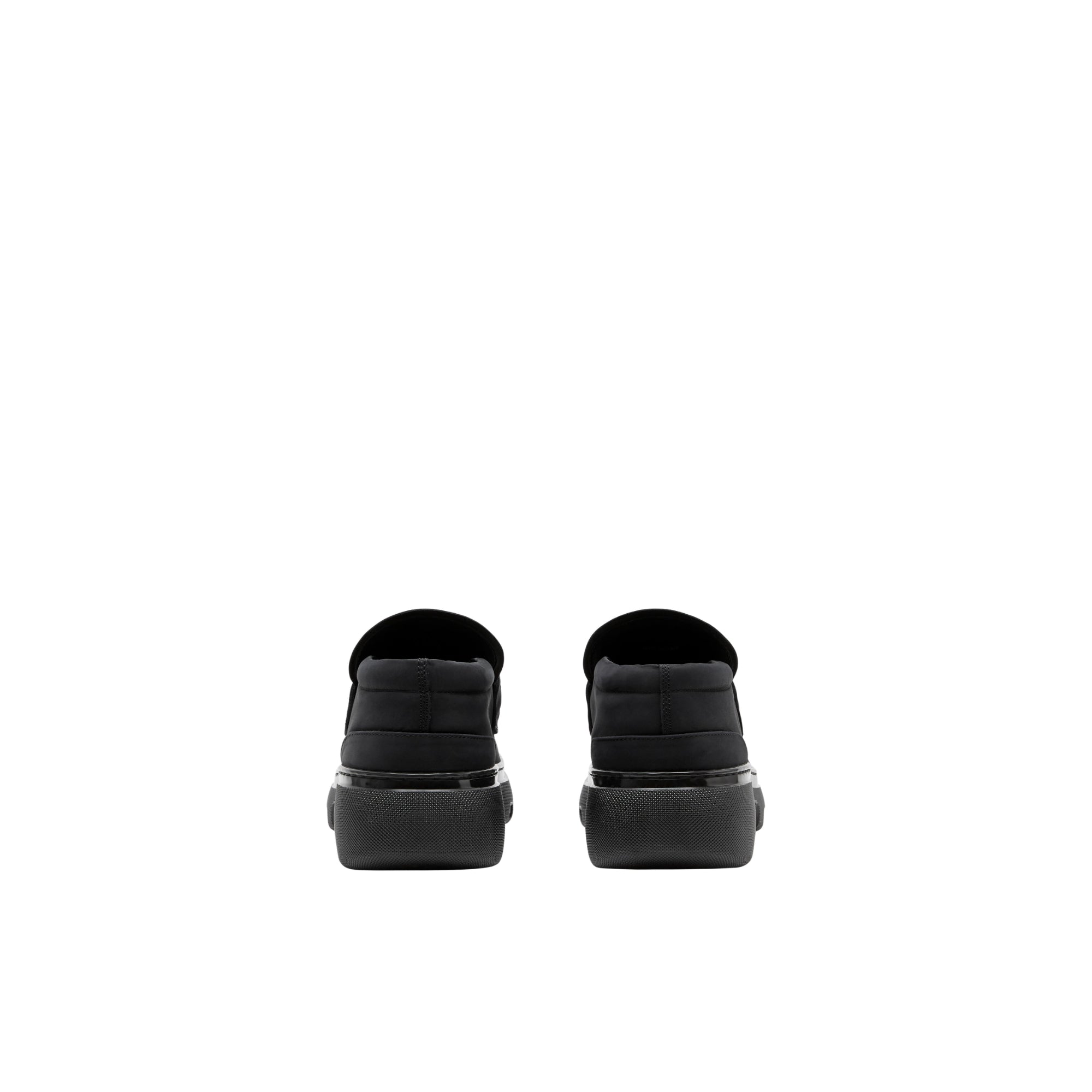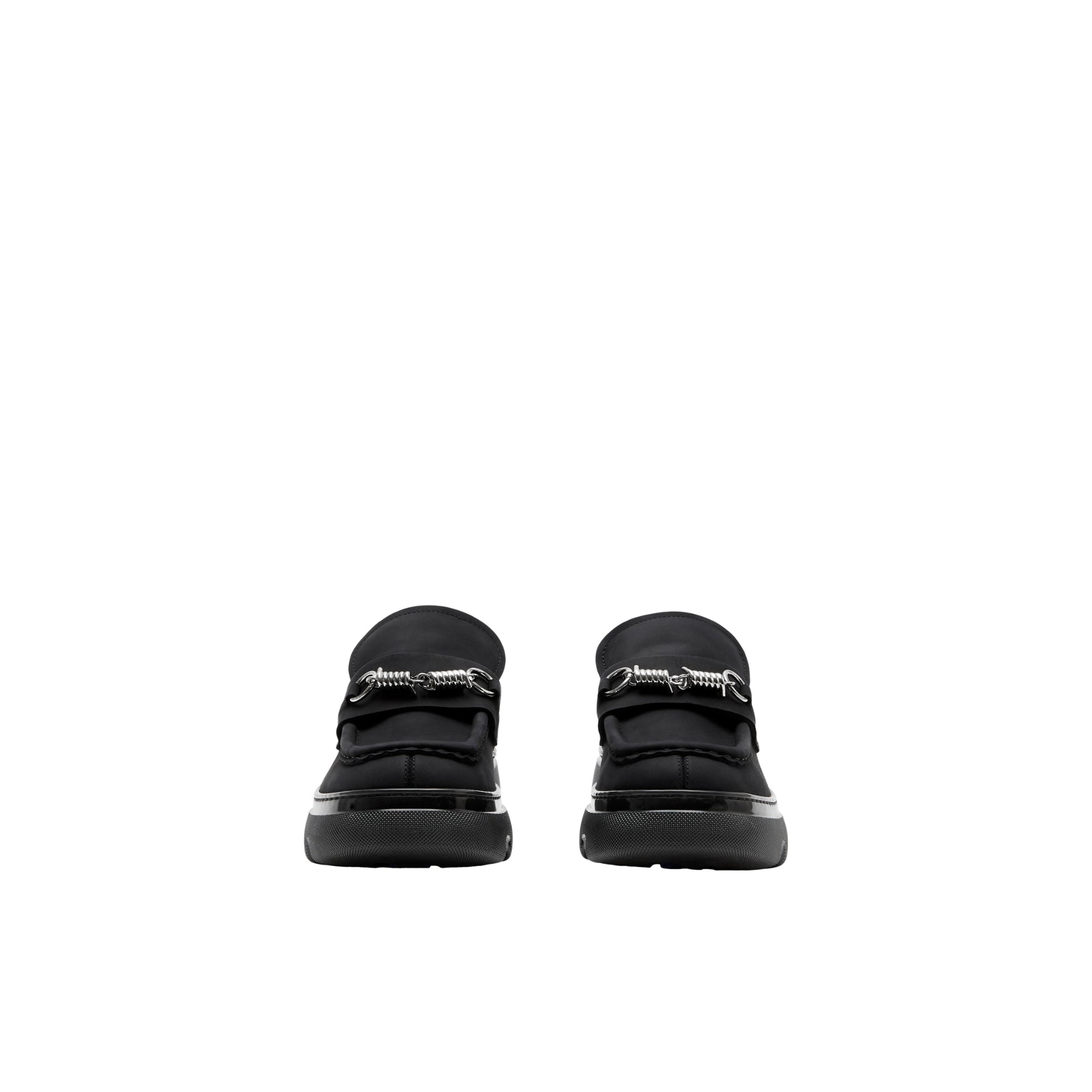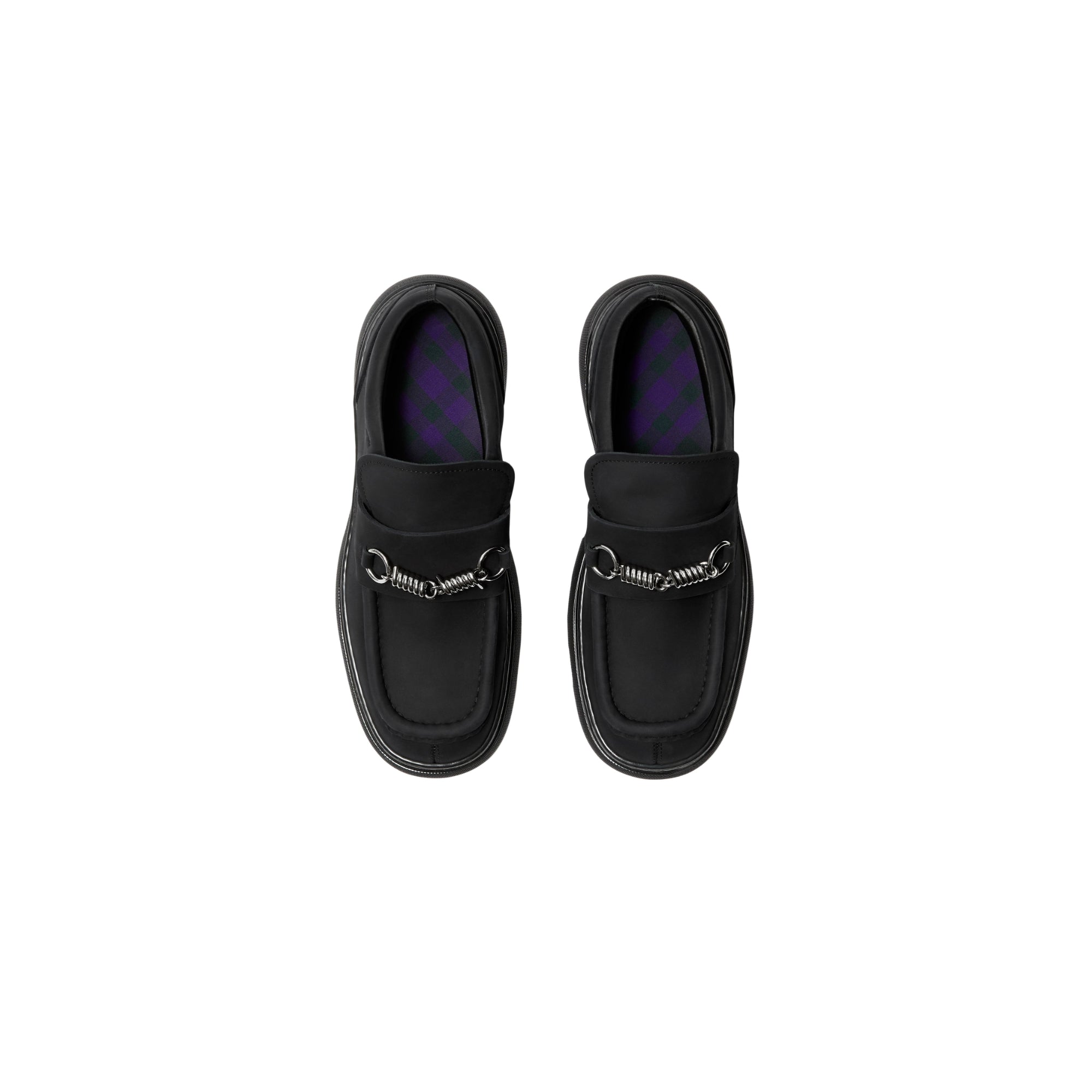 상품설명 : 누벅 소재로 이탈리아에서 제작된 로퍼. 독특한 와이어 하드웨어 디테일이 돋보이며 밑창에 몰딩 처리된 아카이브 버버리 레터링이 특징.##둥근 앞코#바브드 와이어 디테일#체크 안창#밑창의 버버리 레터링