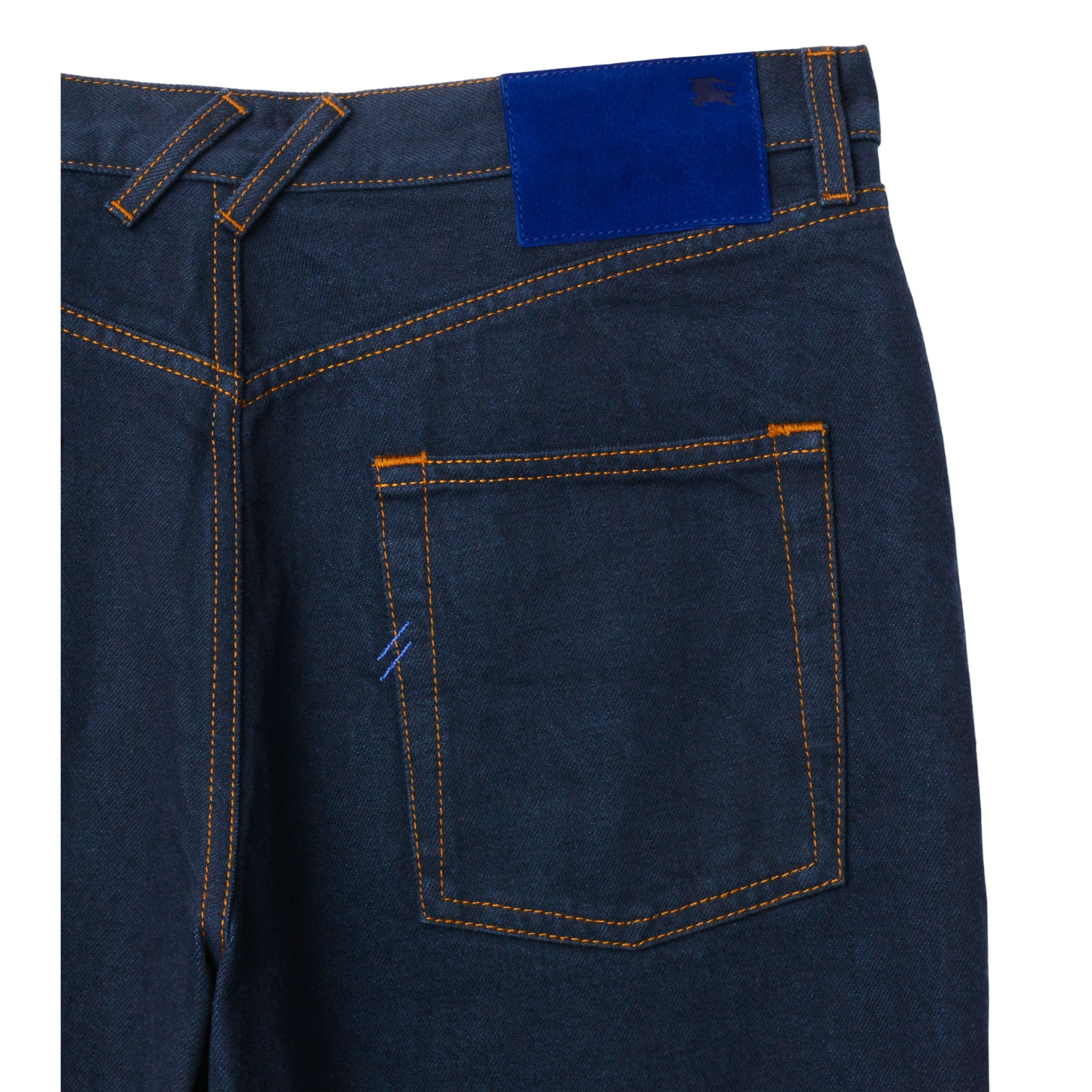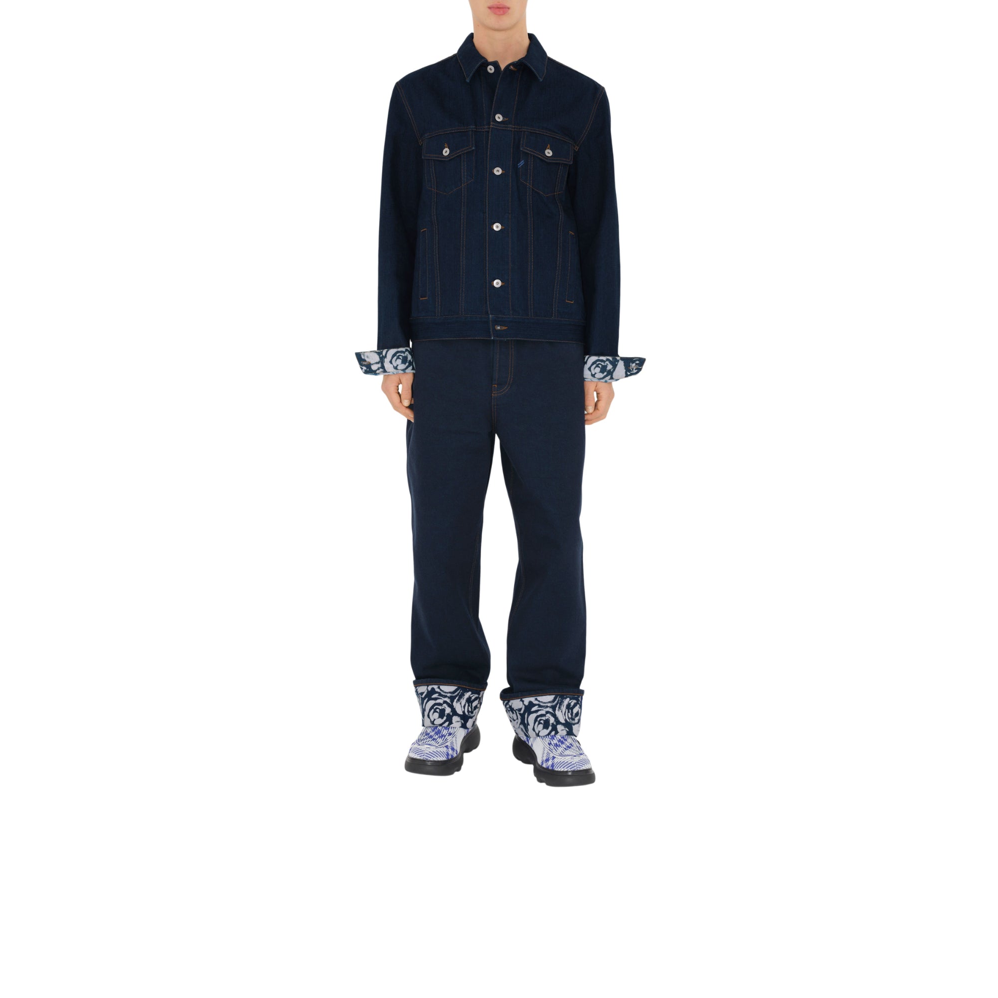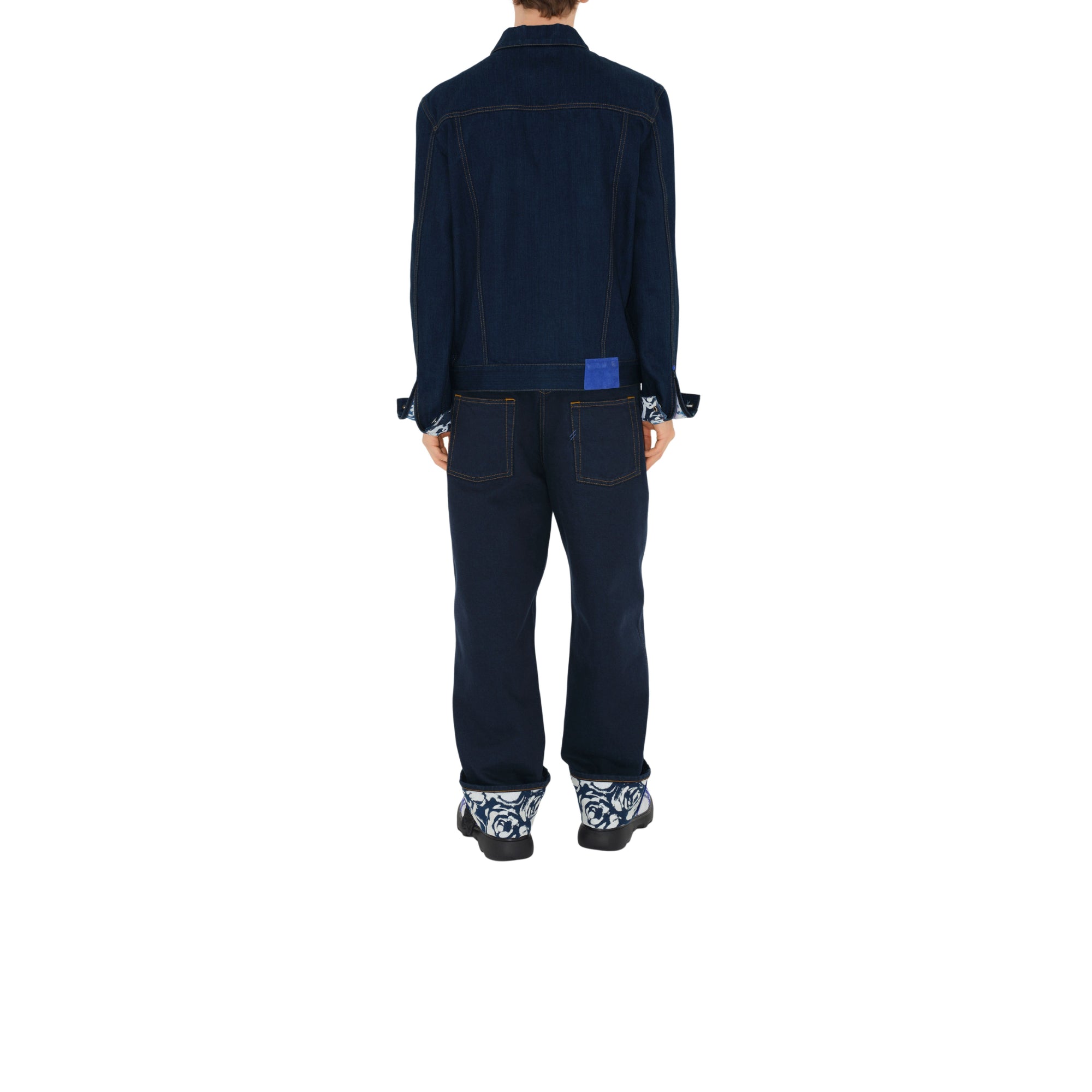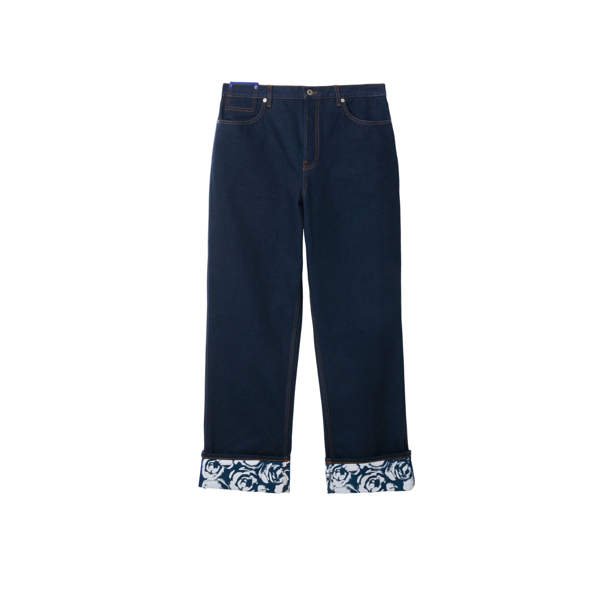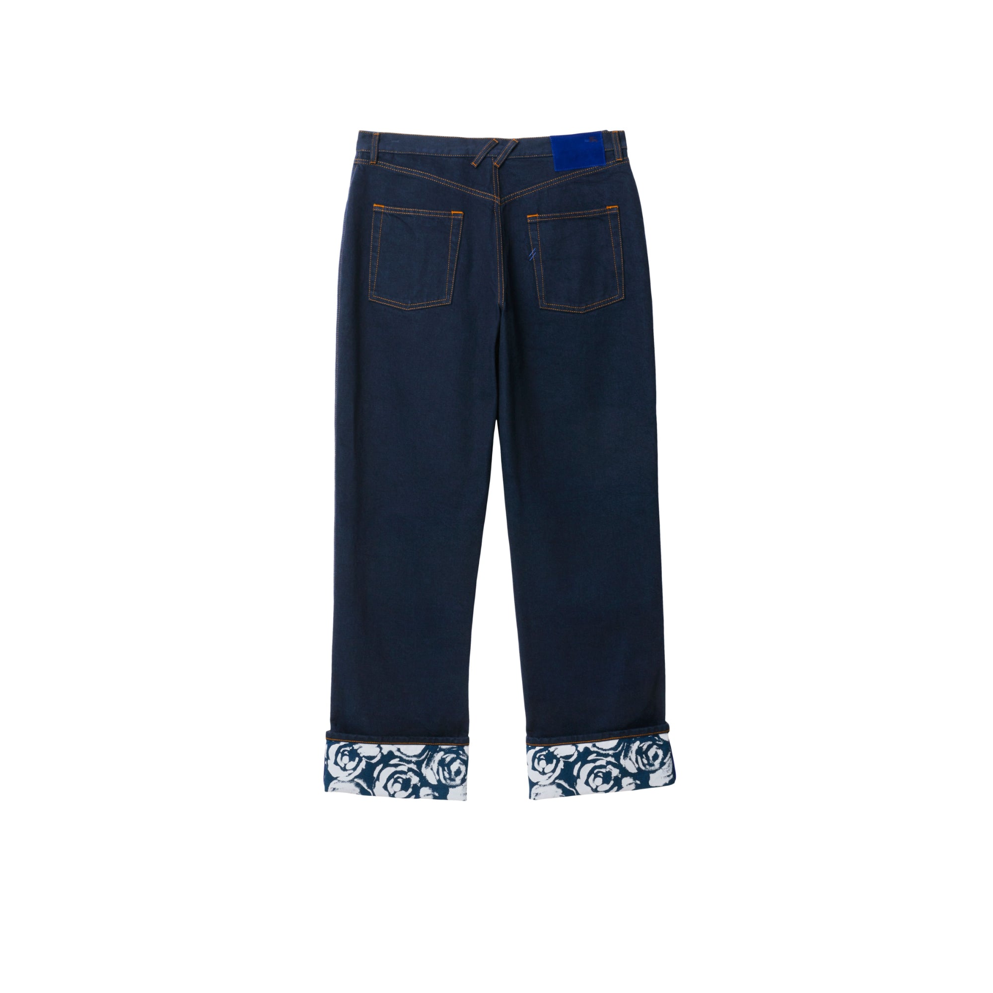 상품설명 : 중량감 있는 재패니즈 데님 소재의 레귤러핏 진. 5포켓 디자인 및 밑단의 로즈 프린트 안감이 특징.##단추 여밈#뒷면 스웨이드 패치의 기마상 디자인(Equestrian Knight Design, EKD)