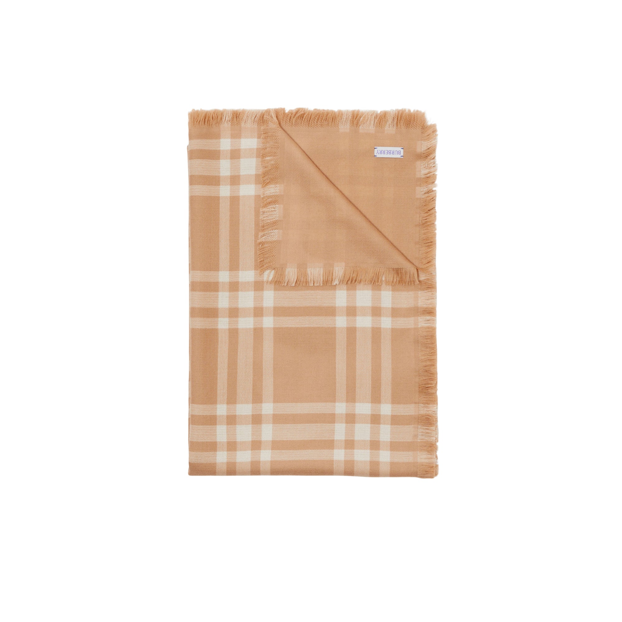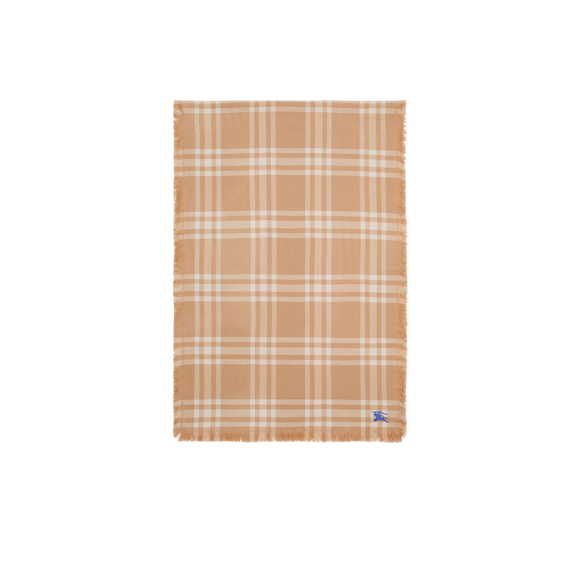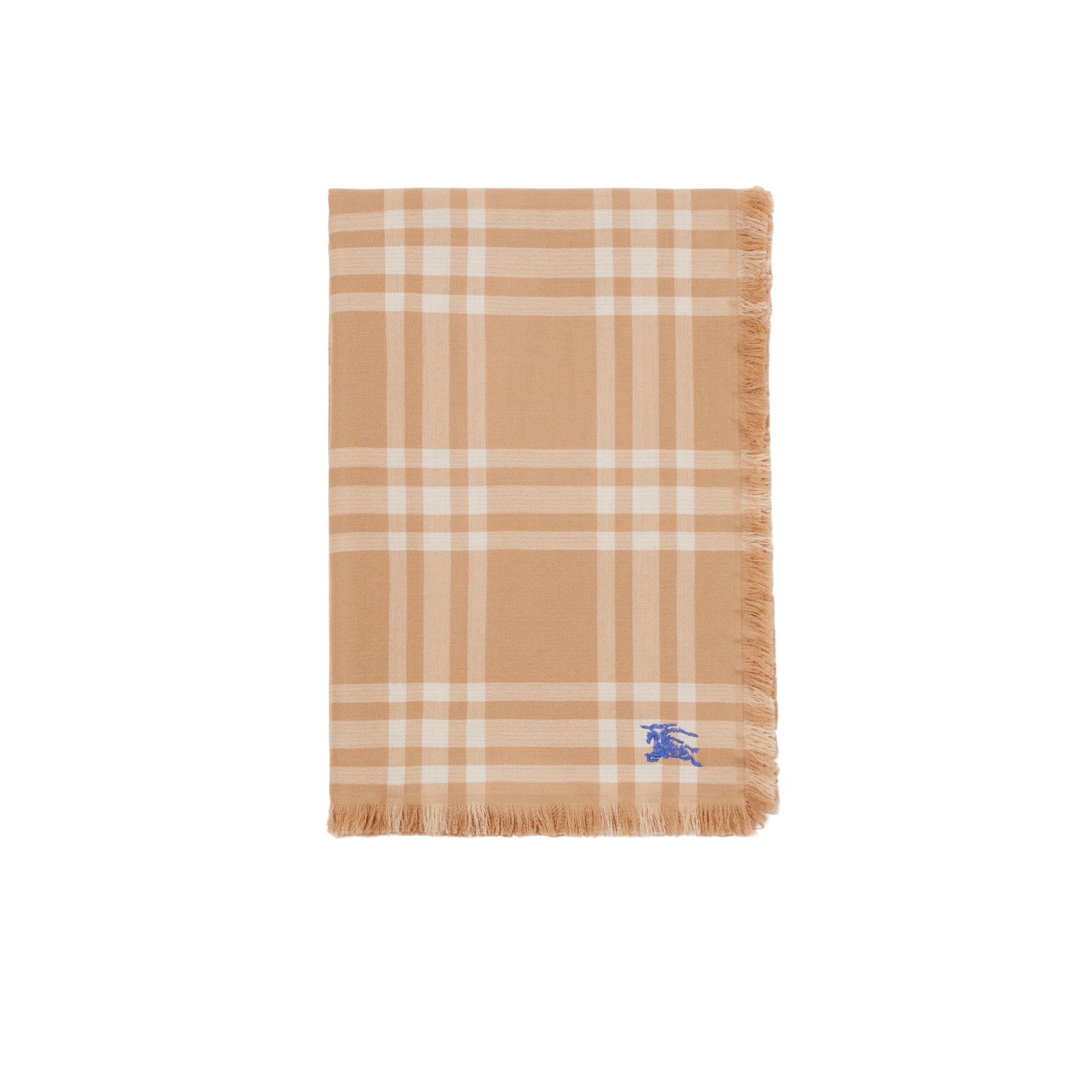 상품설명 : 가벼운 울 실크 혼방 소재로 이탈리아에서 제작된 스카프. 프린지 디테일이 돋보이며, 체크가 연출된 한쪽 면과 단색의 반대면으로 구성된 양면 디자인.##직사각형#가장자리의 아이래쉬 프린지 디테일#기마상 디자인(Equestrian Knight Design, EKD) 자수