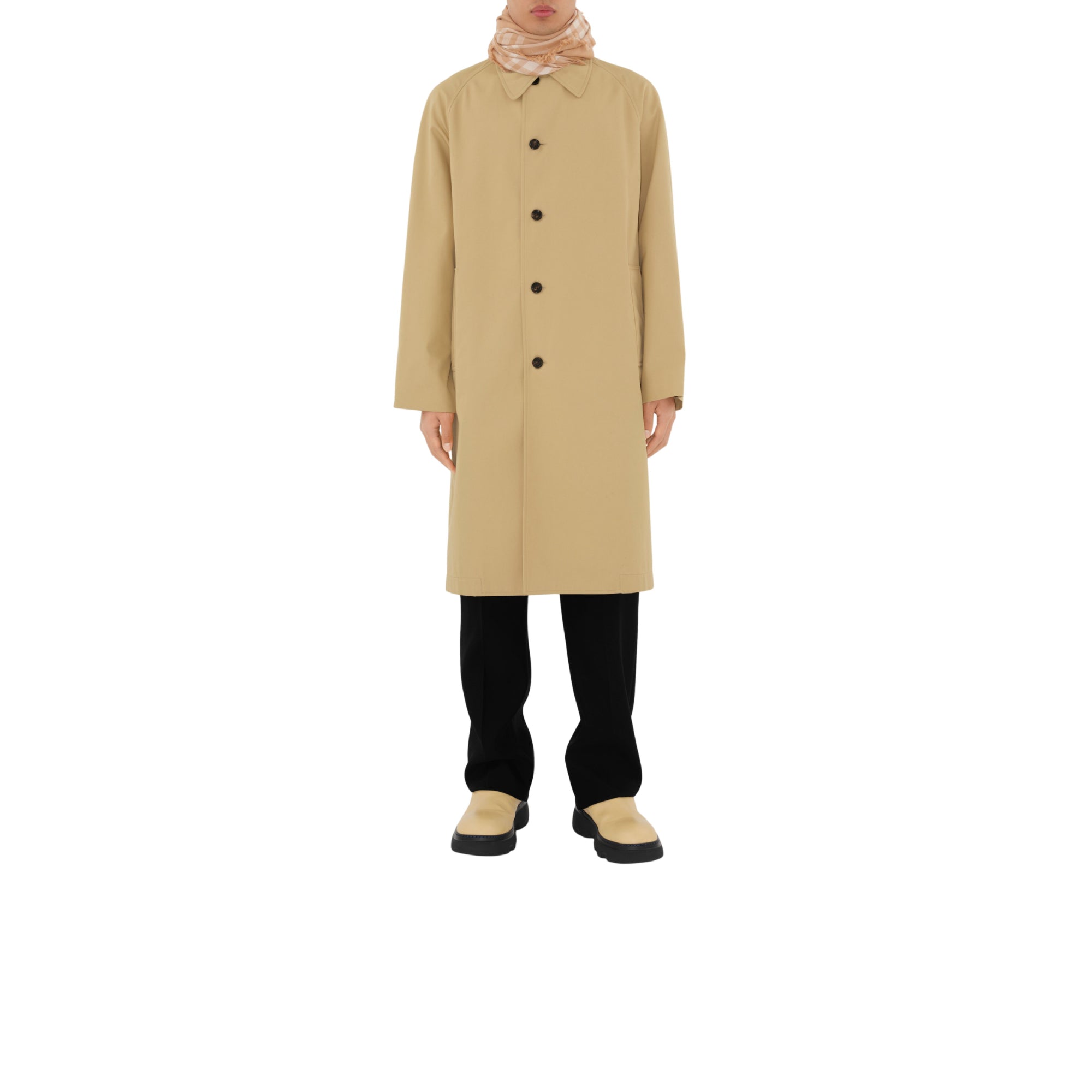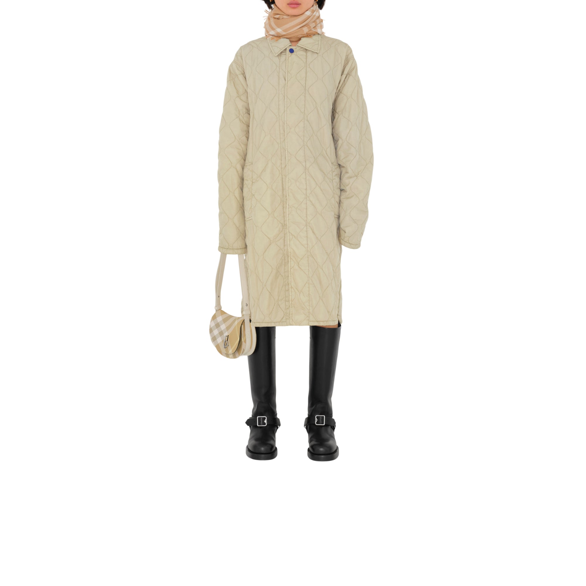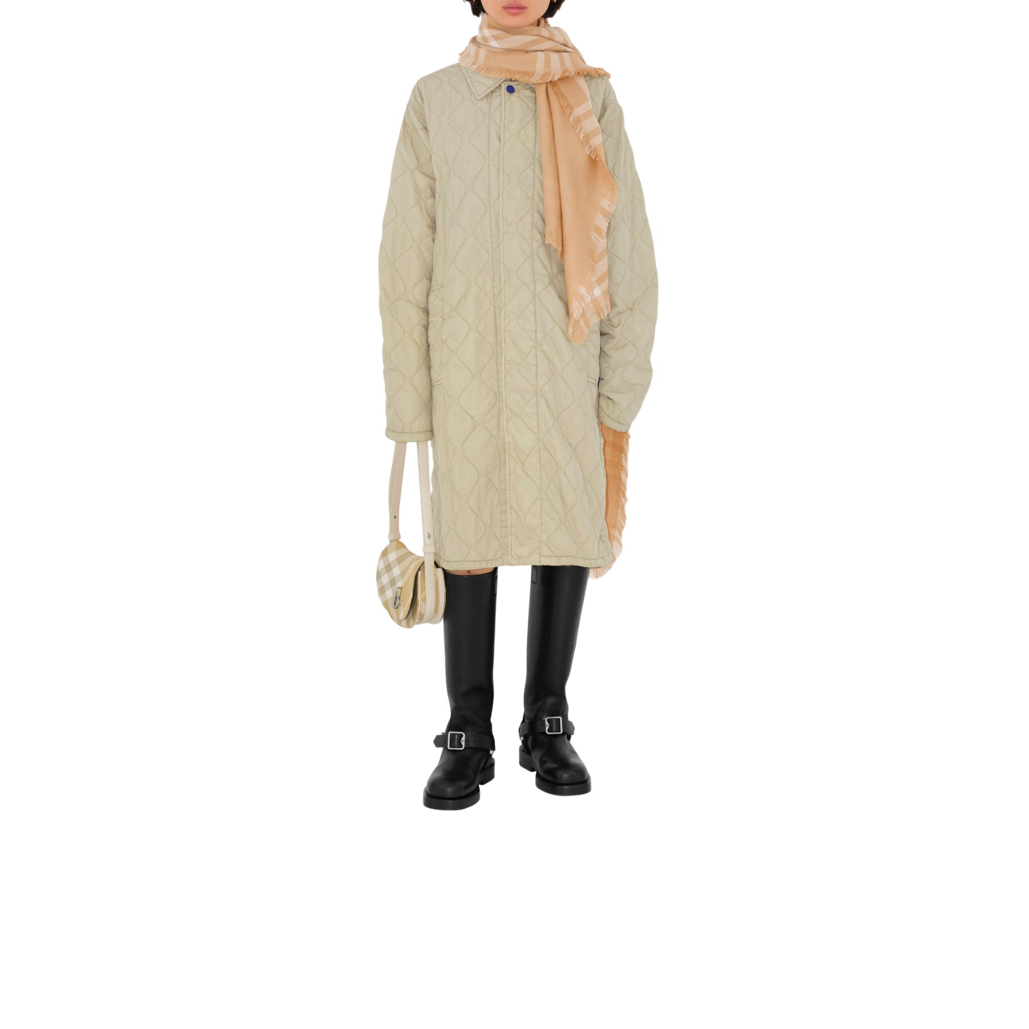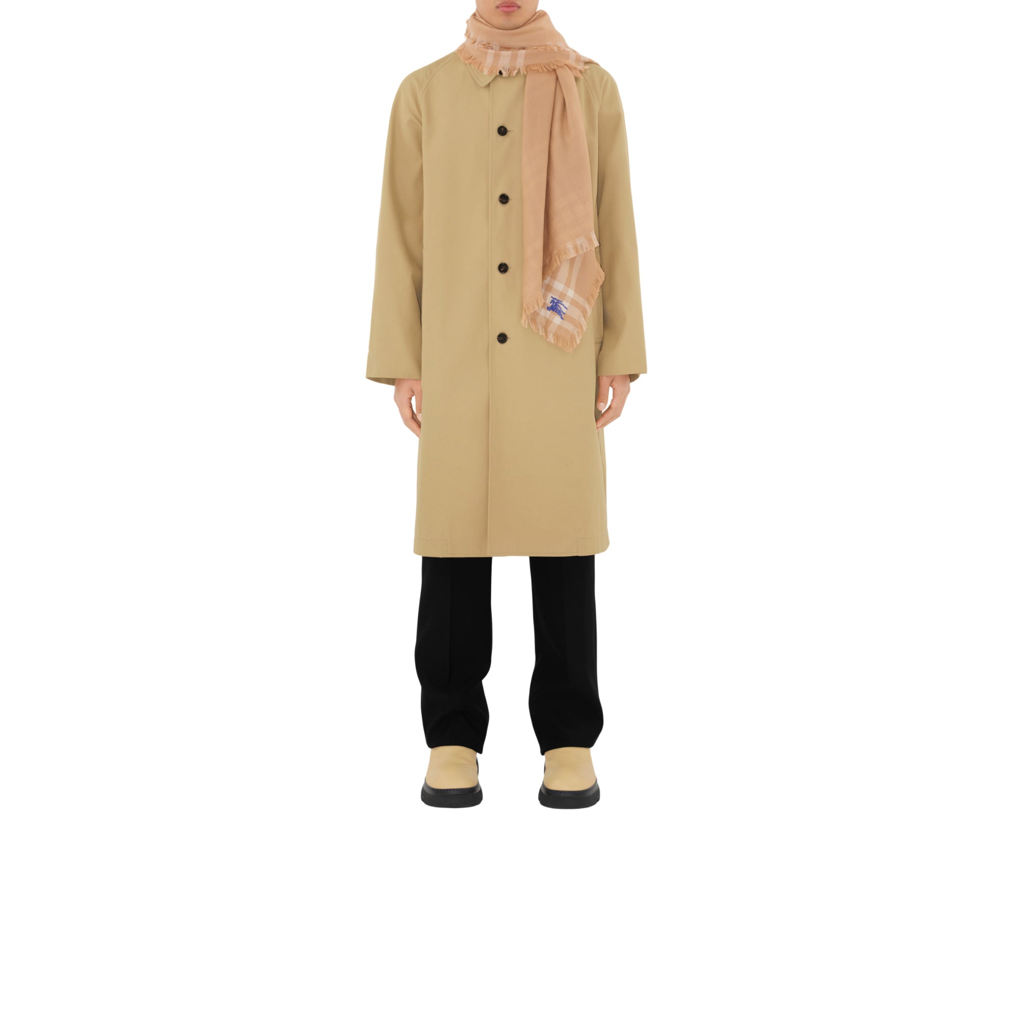 상품설명 : 가벼운 울 실크 혼방 소재로 이탈리아에서 제작된 스카프. 프린지 디테일이 돋보이며, 체크가 연출된 한쪽 면과 단색의 반대면으로 구성된 양면 디자인.##직사각형#가장자리의 아이래쉬 프린지 디테일#기마상 디자인(Equestrian Knight Design, EKD) 자수