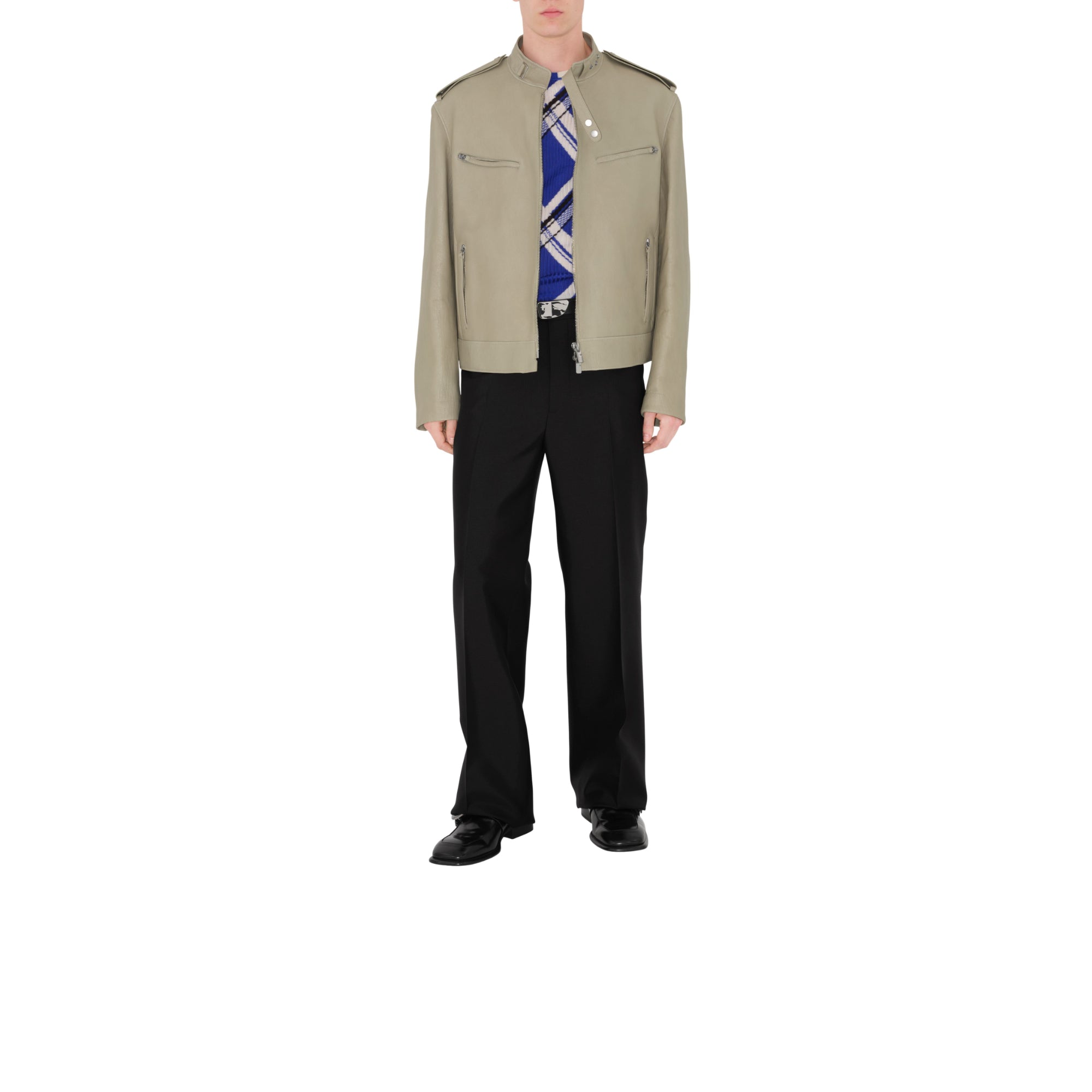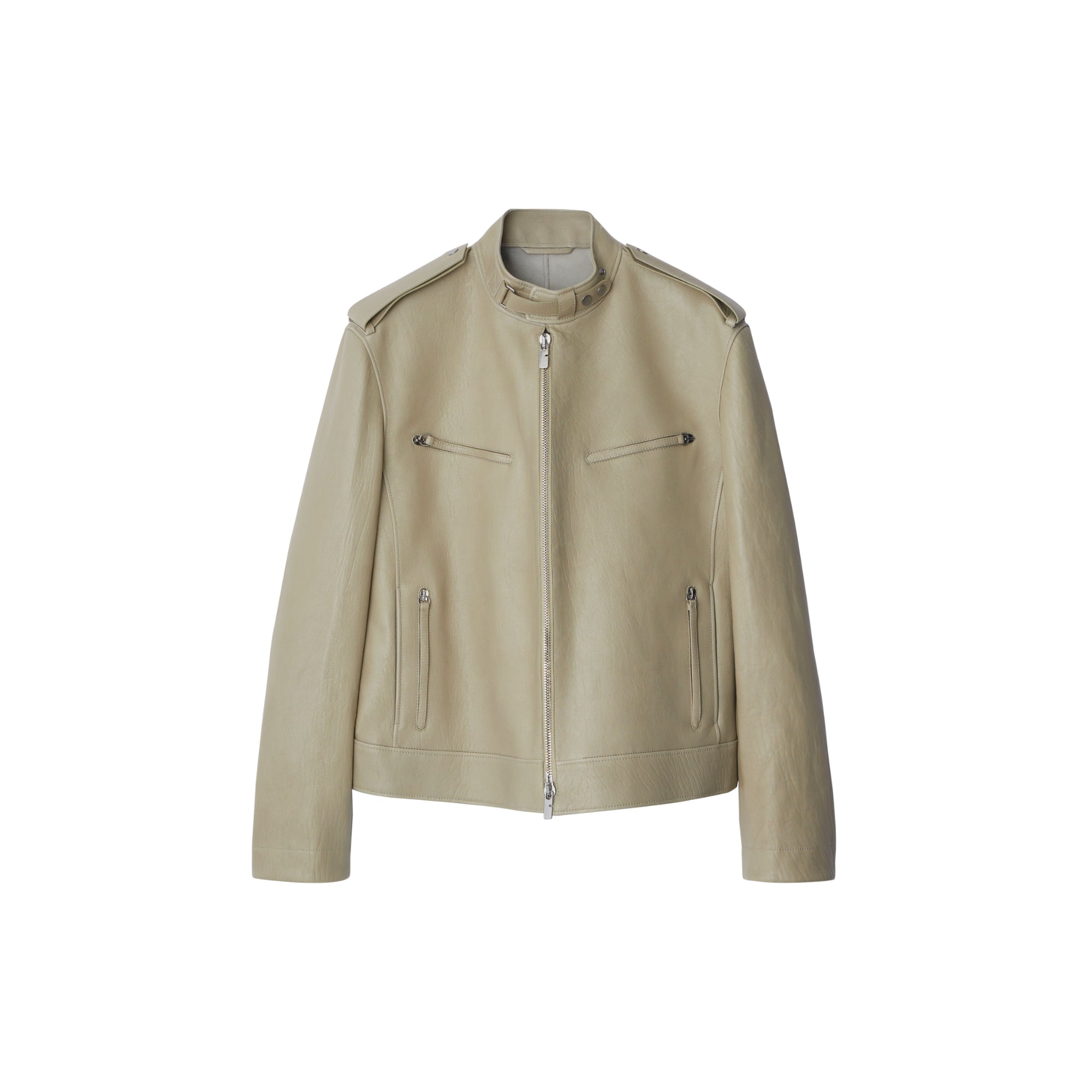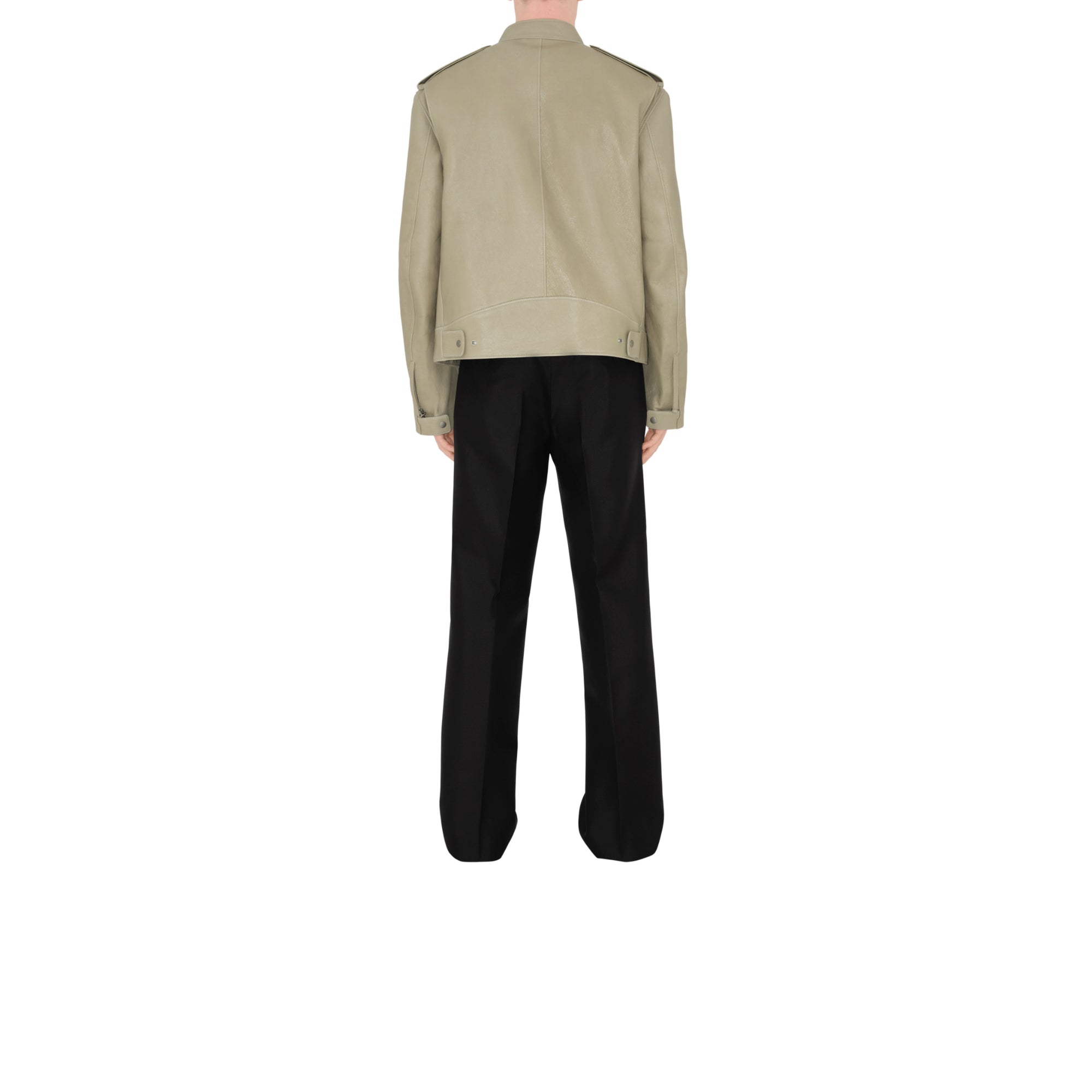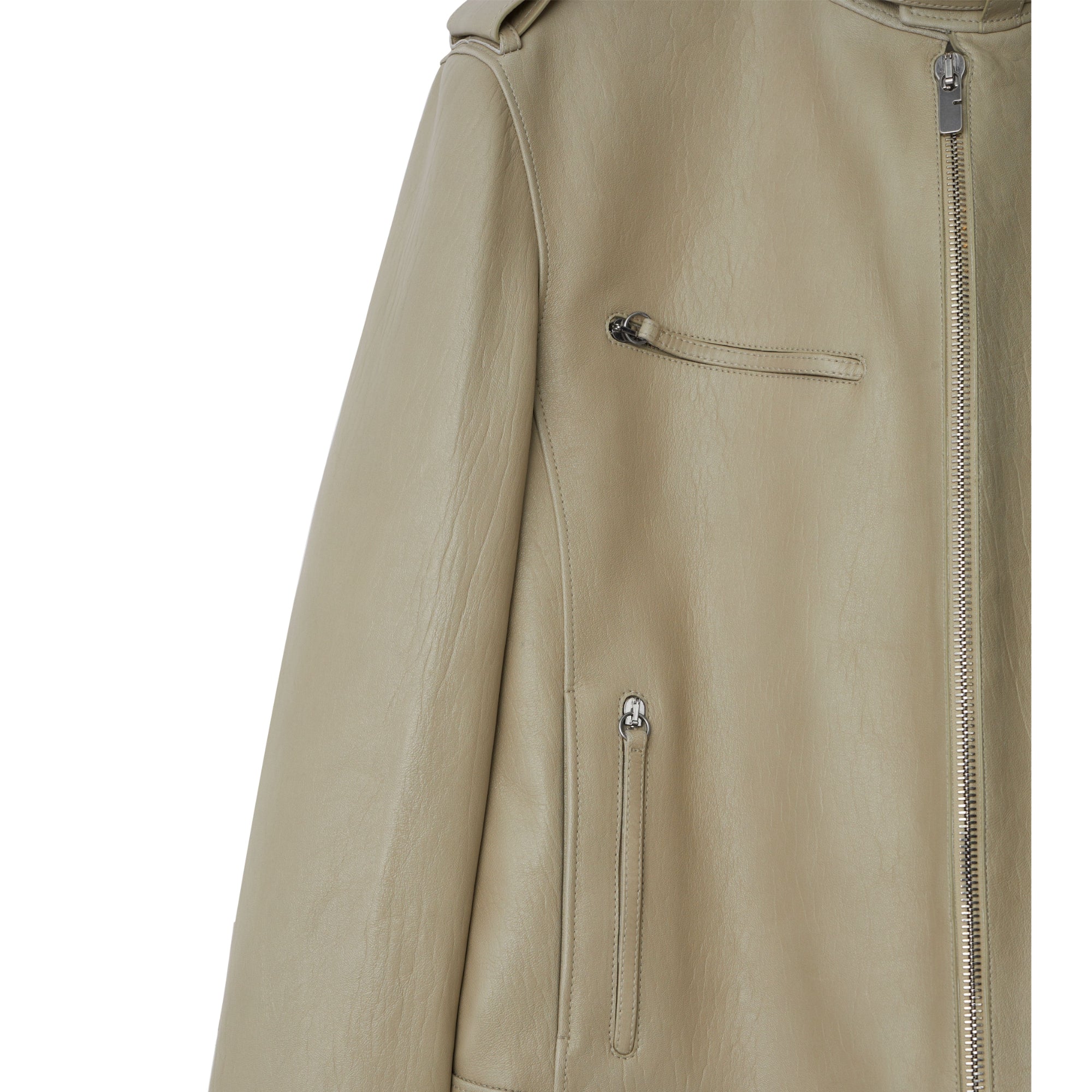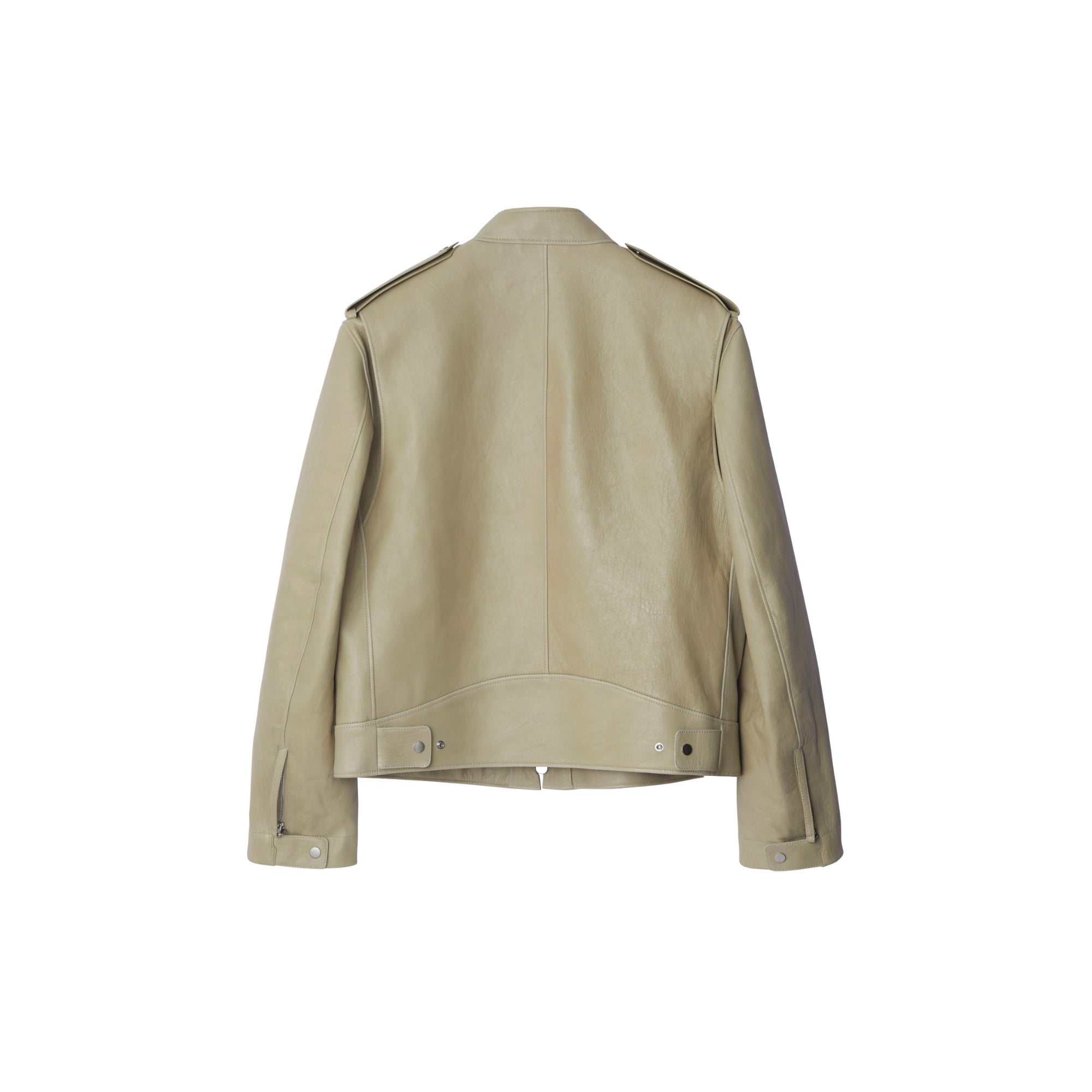 상품설명 : 부드러운 가죽 소재로 이탈리아에서 제작된 레귤러핏의 바이커 재킷. 측면 탭의 스냅 단추를 사용해 허리선 조절 가능.##양방향 지퍼 여밈#스냅 단추 디테일의 탭 칼라#견장의 스냅 단추#가슴의 지퍼 포켓, 측면의 지퍼 포켓#커프스의 스냅 단추 및 지퍼 디테일