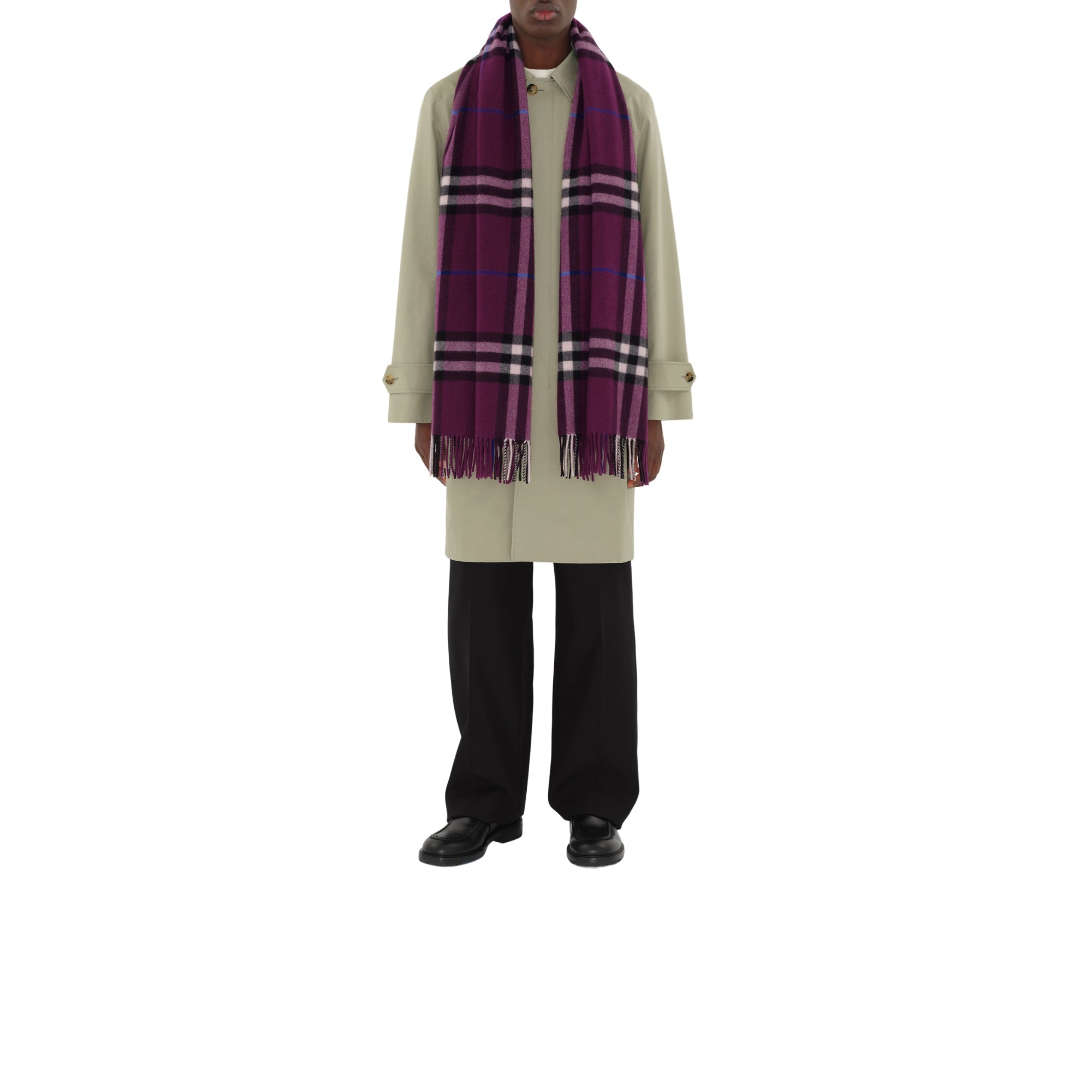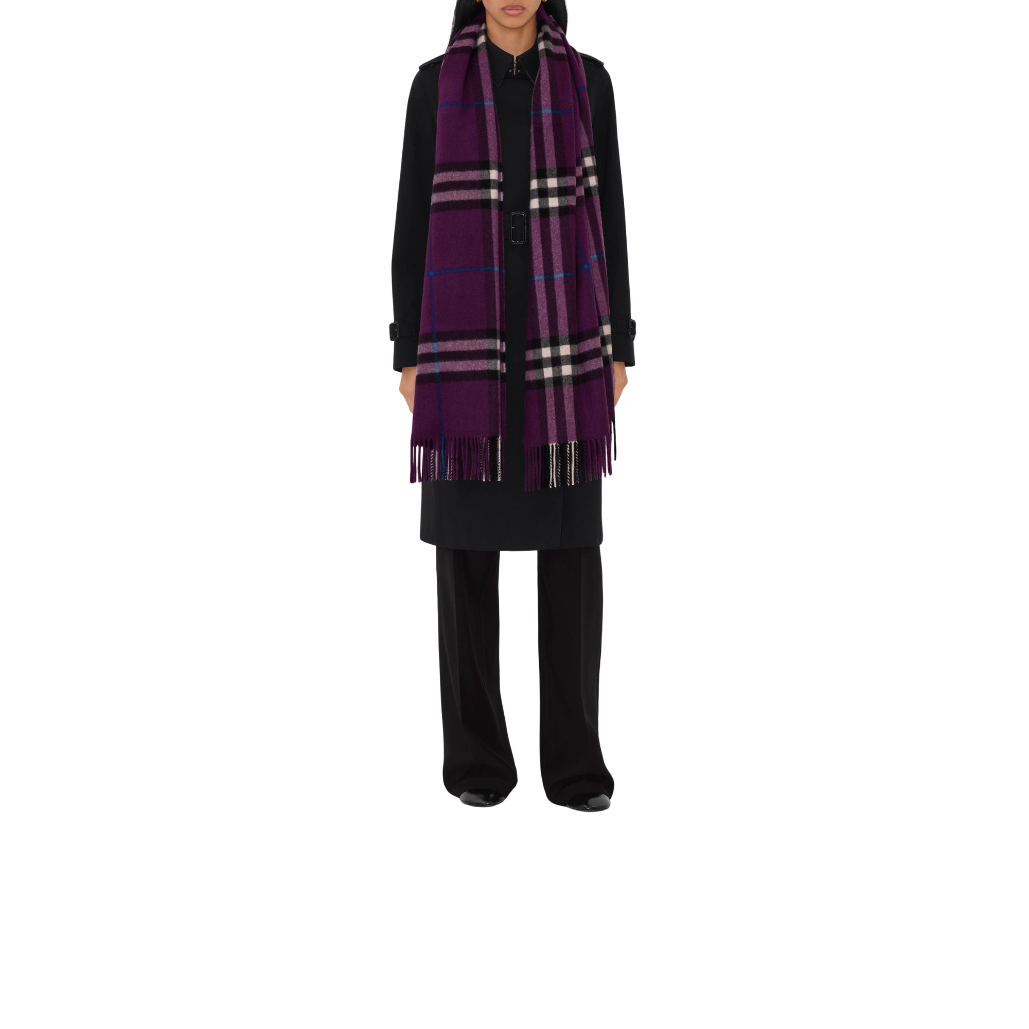 상품설명 : 1797년 설립된 스코틀랜드 직물 공장에서 제작된 버버리 체크 캐시미어 스카프. 전통 베틀로 직조된 원단을 현지의 천연수로 세척한 후, 말린 티젤 꽃을 사용해 표면을 브러싱 처리하여 캐시미어 특유의 자연스러운 광택과 매우 부드러운 촉감이 특징. 두 차례 추가 워싱을 통해 풍성한 질감이 완성됨.##직사각형#양 가장자리의 프린지 디테일