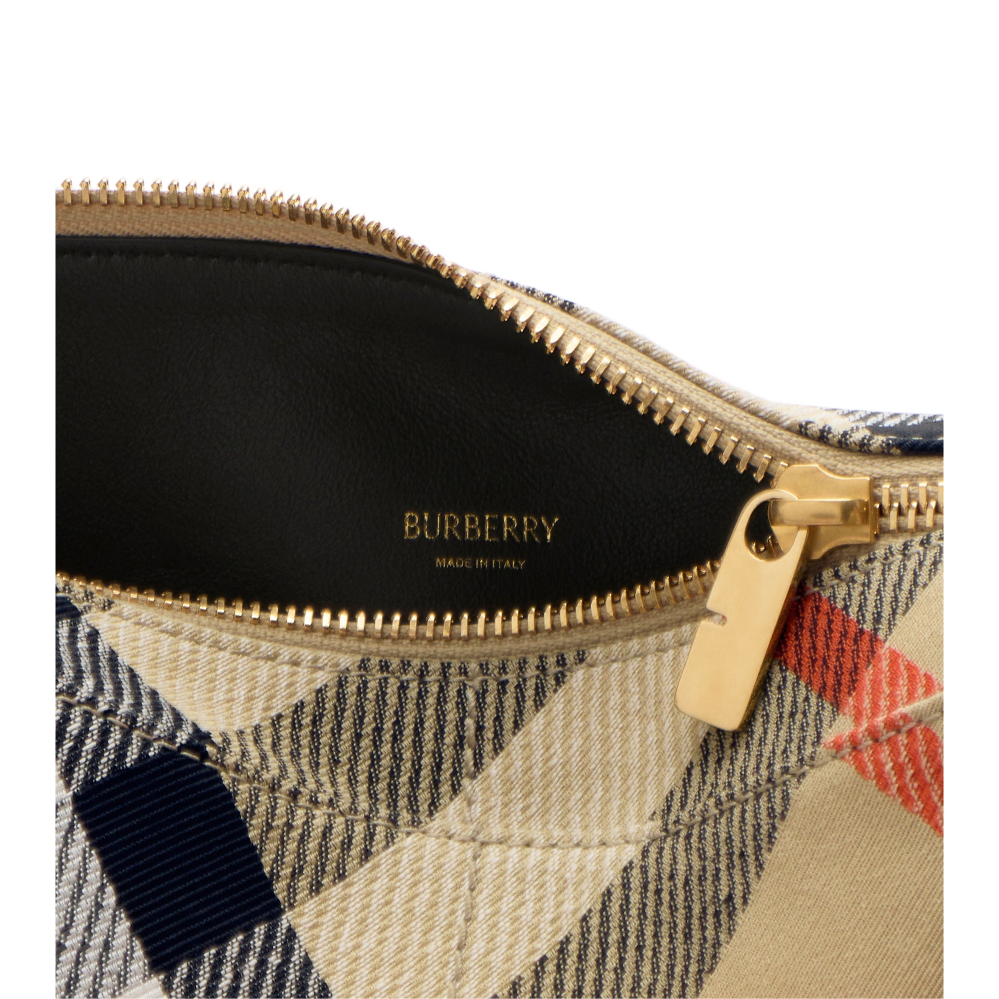 상품설명 : 자카드직 버버리 체크가 돋보이는 면 혼방 소재로 이탈리아에서 제작된 지퍼 여밈 가방. B 모양 하드웨어에서 비롯된 박시한 실루엣, 스무드 가죽 안감 및 기하학적인 스티치 디테일이 특징. 스트랩을 조절해 크로스바디 백 또는 숄더 백으로 착용 가능.##조절 가능한 가죽 스트랩#지퍼 여밈#외부의 자석 여밈 슬립 포켓#수작업으로 마감칠된 테두리#브러시드 메탈 하드웨어#가죽 안감#더스트 백이 함께 제공됩니다.