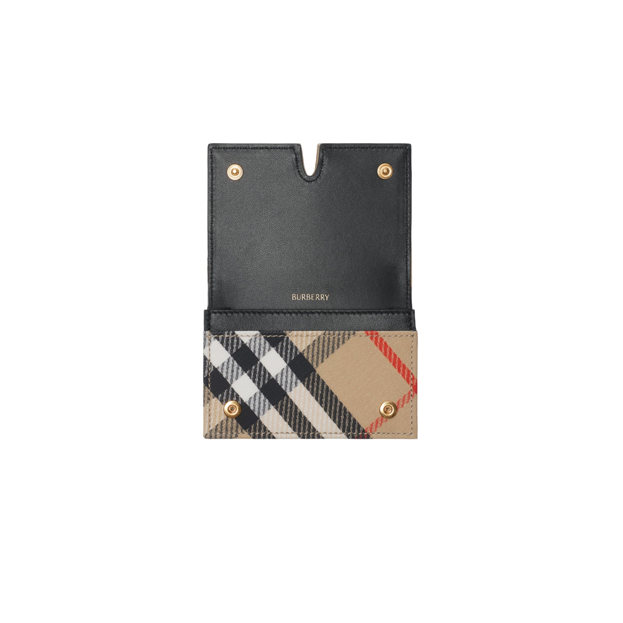 상품설명 : 버버리 체크가 자카드직으로 연출된 코팅 면 혼방 소재의 카드 케이스. 명함과 카드를 보관할 수 있는 사이즈로, 스냅 단추와 기하학적인 스티치 디테일이 특징.##스냅 단추 여밈의 접이식 플랩#카드 수납칸 2개#외부의 슬립 포켓, 내부의 슬립 포켓#수작업으로 마감칠된 테두리#브러시드 메탈 하드웨어#더스트 백이 함께 제공됩니다.