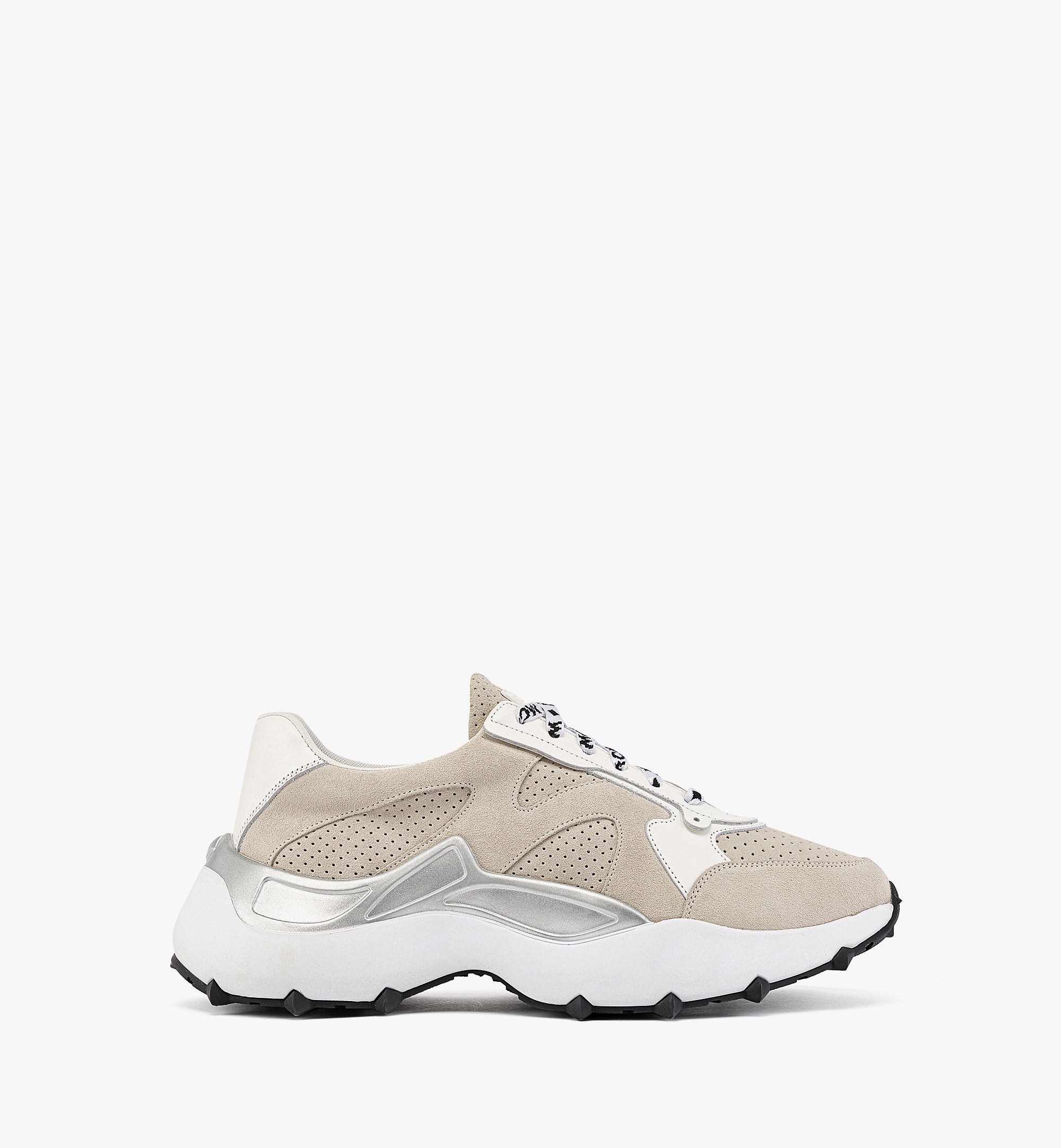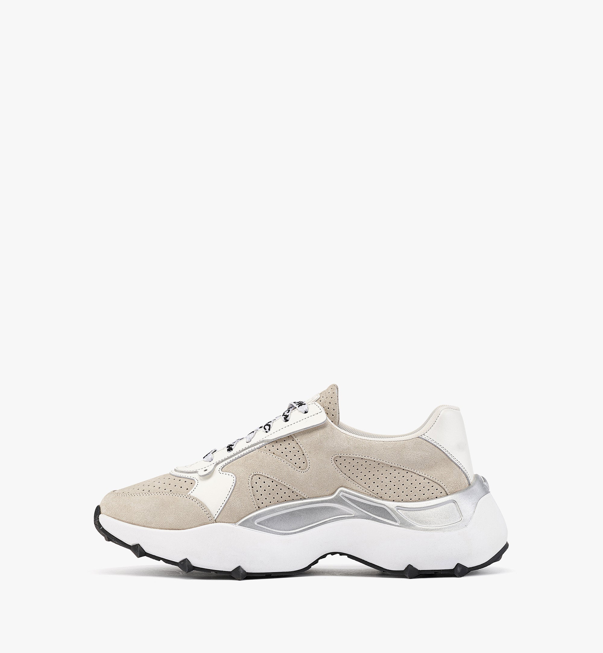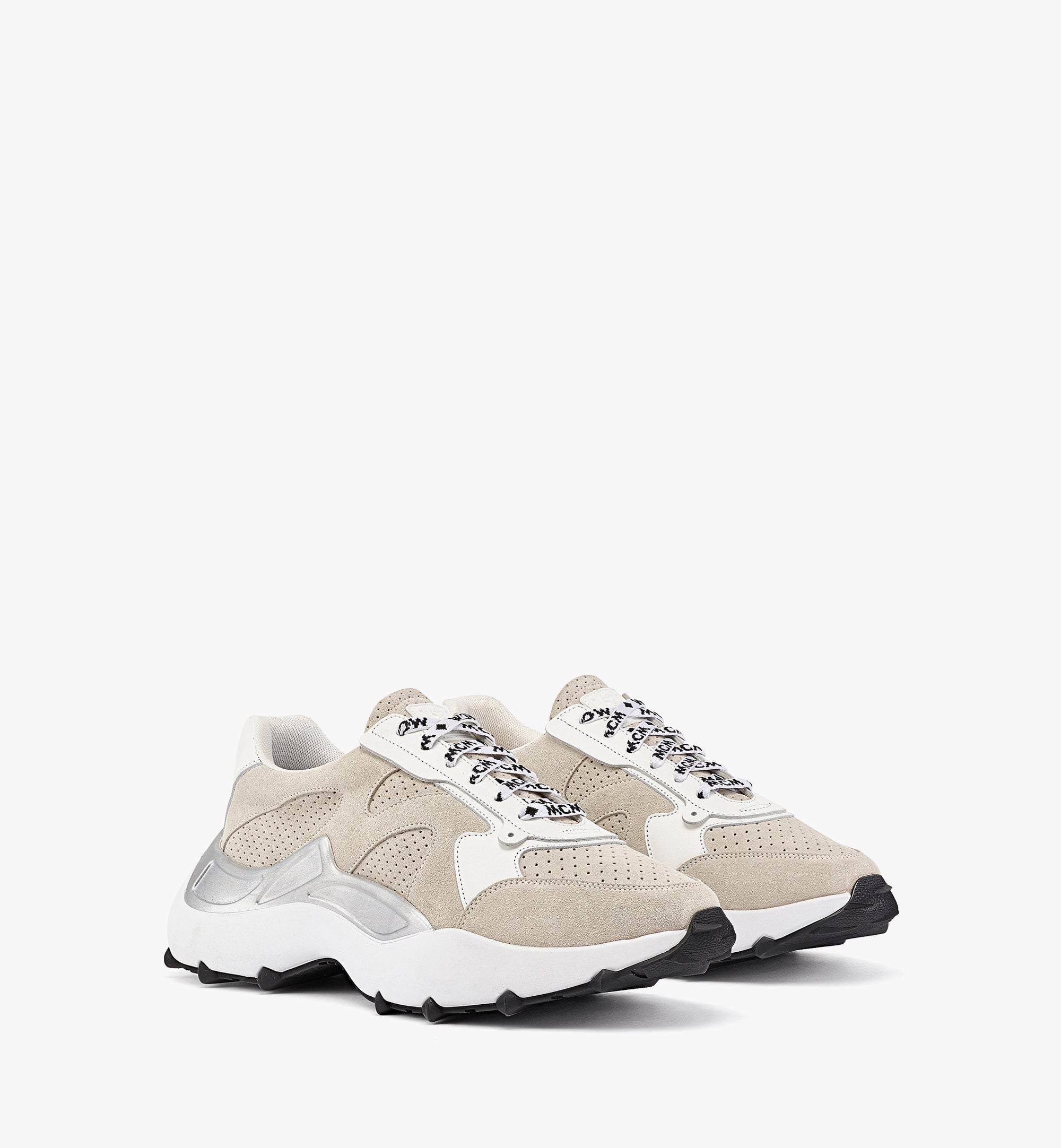 퍼포레이티드 송아지 스웨이드트림 소재: 이탈리안 송아지 가죽메시 안감텅의 러버라이즈드 MCM 로고 플레이트윙 디테일의 아이스테이바이에른 다이아몬드에서 영감을 받은 RPU 아웃솔과 TPU 바텀로고 우븐 슈레이스풋베드에 MCM 로고 프린트