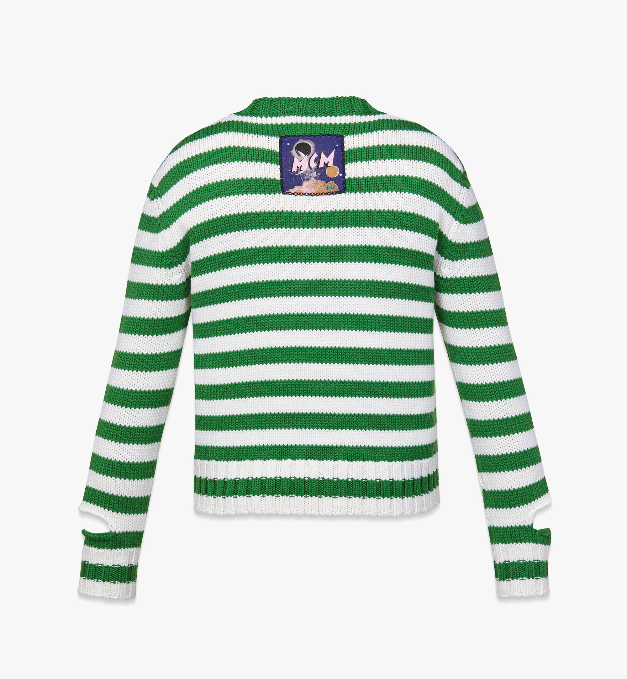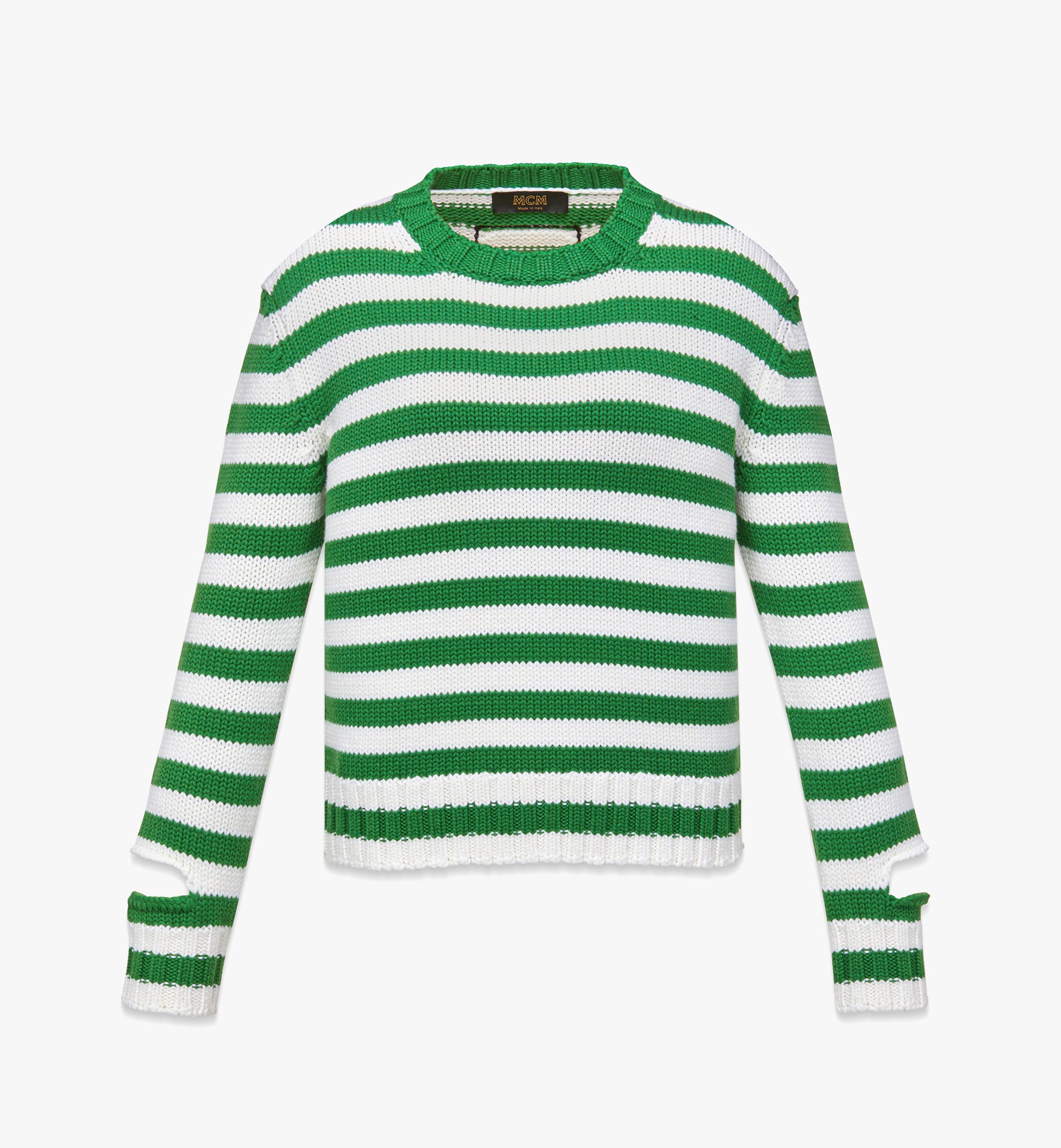 메리노 울 100%그린 스트라이프 모티프커프스의 슬릿 디테일뒷면의 MCM 로고 그래픽 패브릭 패치레귤러 핏손세탁 전용 뒤집어서 열이 식은 다리미로 다림질 건조기 사용 금지