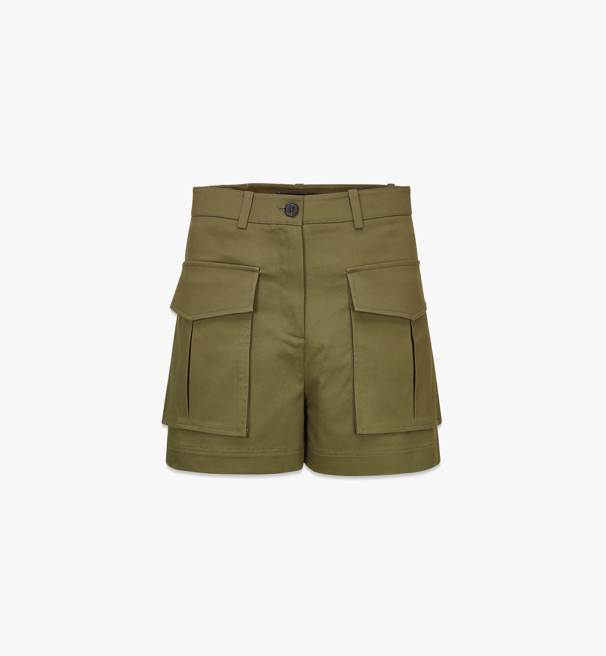 전통적인 사파리 스타일과 어우러지는 여러 개의 패치 포켓이 특징인 카키 코튼 트윌 쇼츠