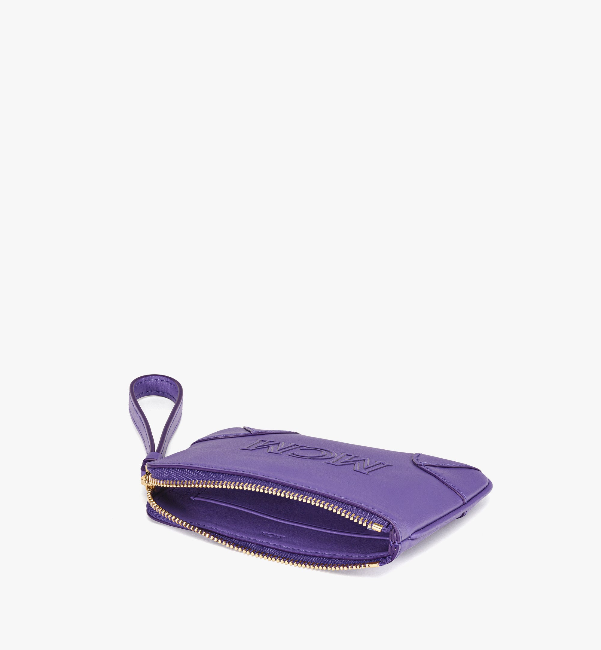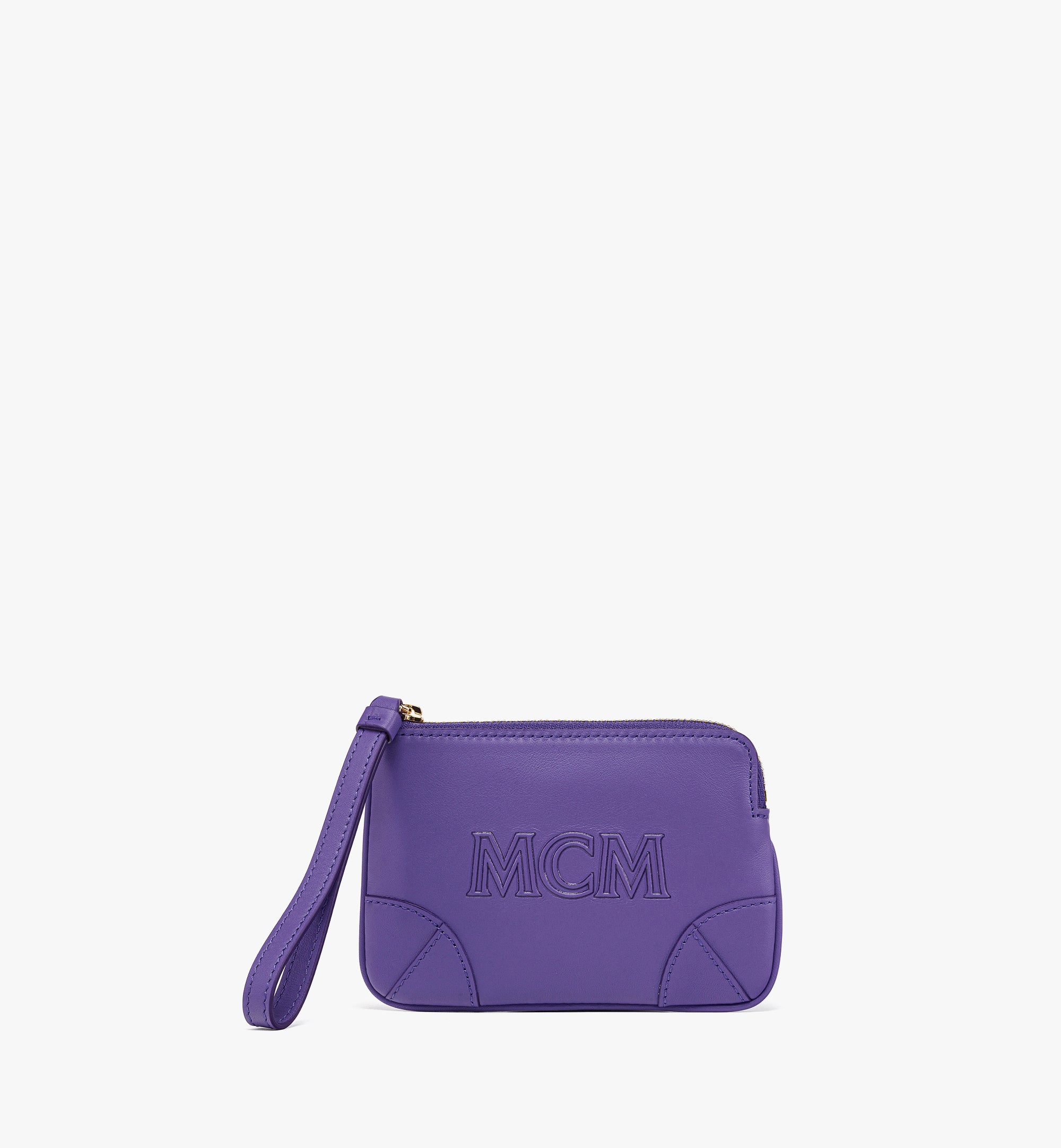 엠보스드 MCM 로고 모티프가 돋보이는 송아지 가죽 소재의 엑스트라 미니 손목 스트랩 지퍼파우치